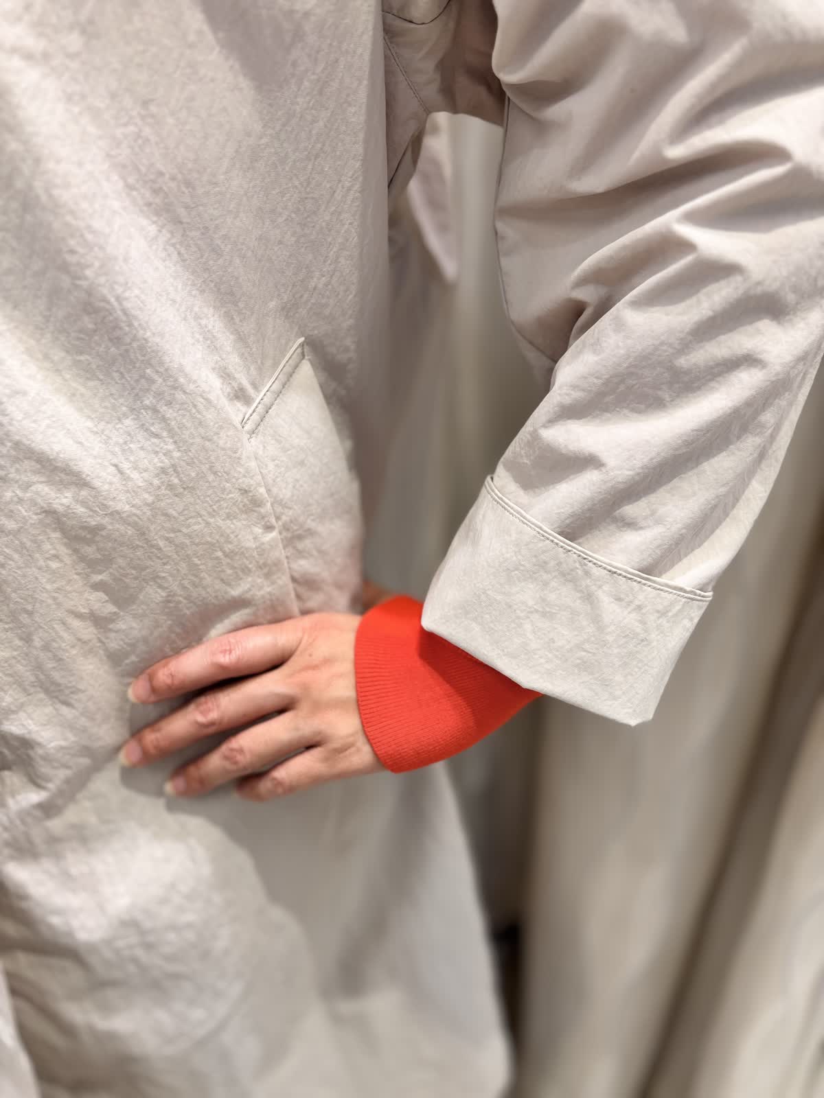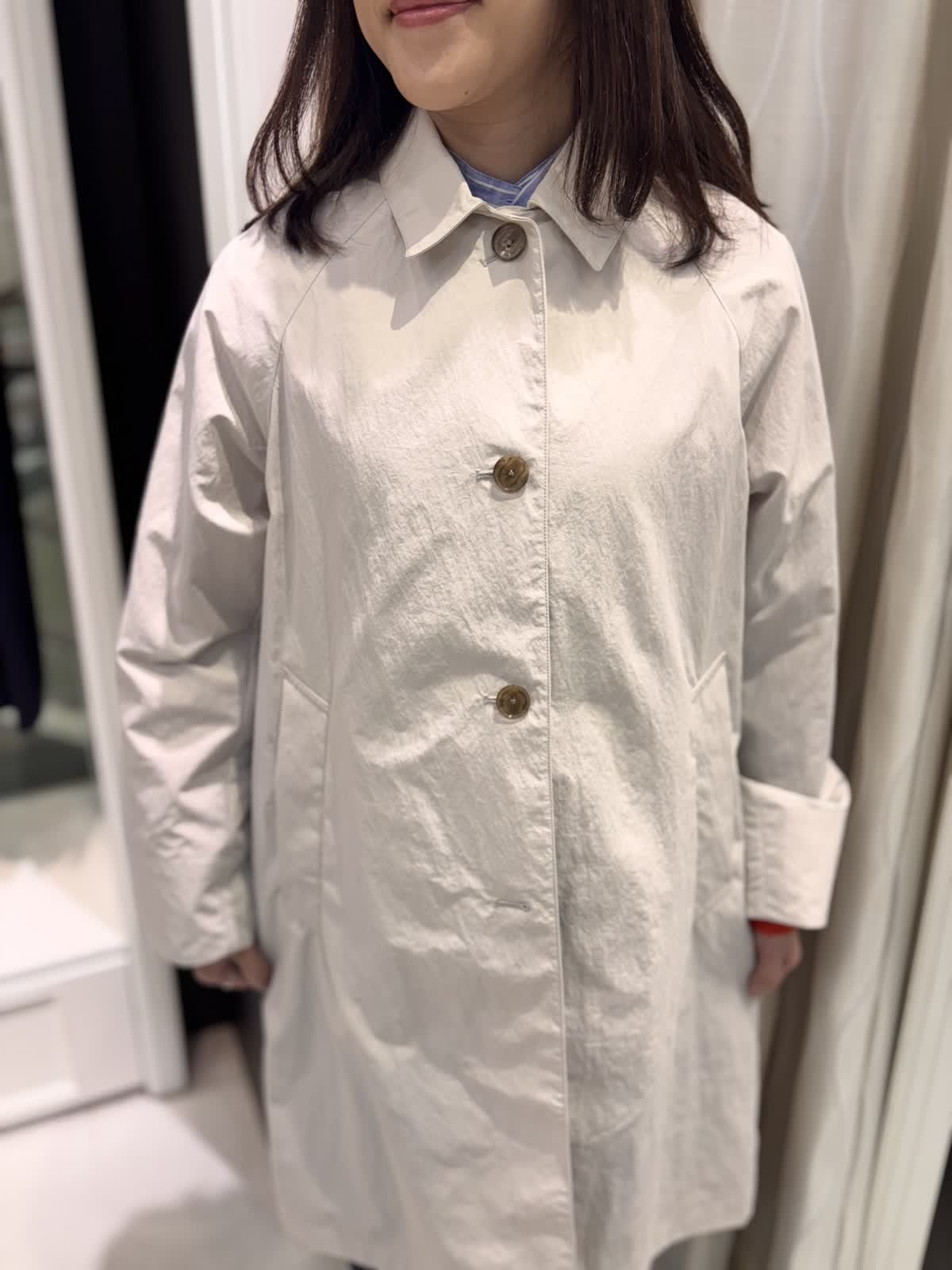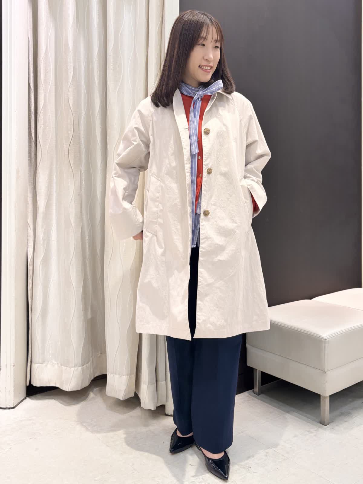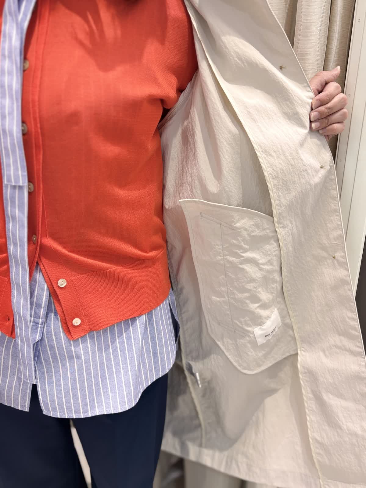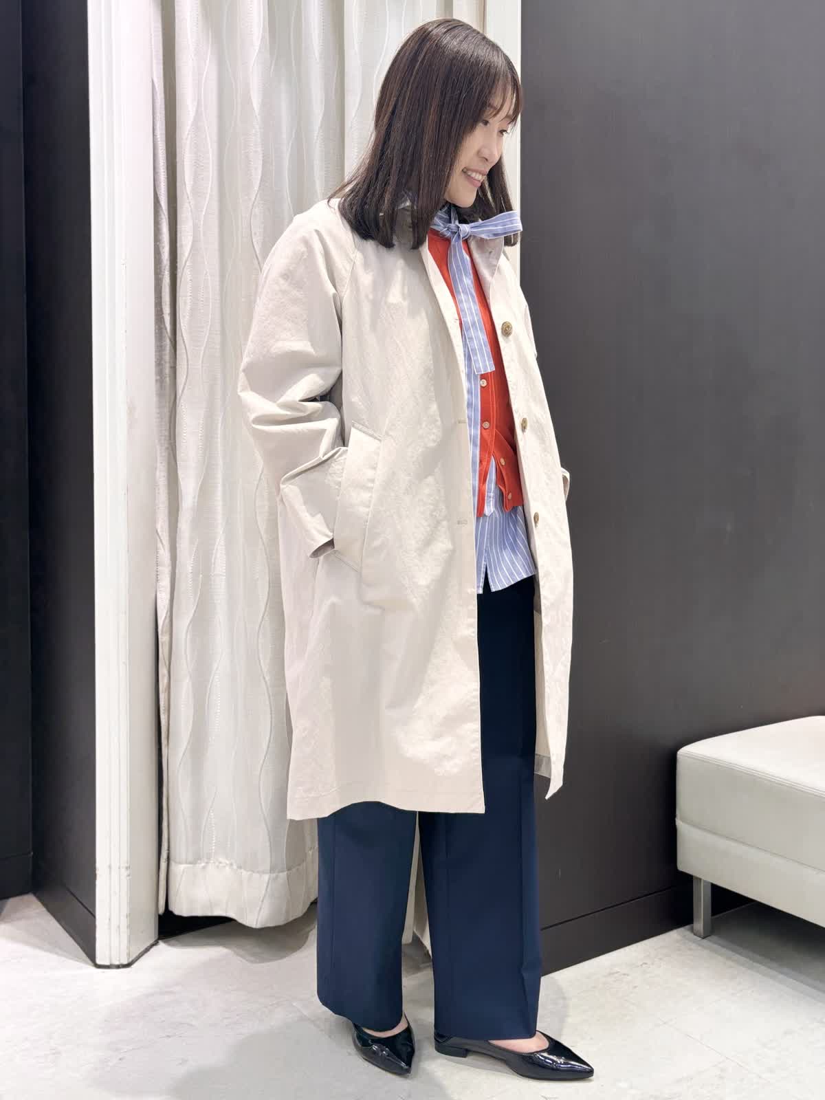 長く愛用いたたげるデザインなのはステンカラーコート。シャカシャカ素材でシワを気にせる通勤や旅行などさまざまな場面で使いやすいです。程よいシルエットは肌寒い春先にも着込みやすいサイズ感。裏地がないので本当に軽いです。インナーはオレンジカーディガンにストライプシャツをレイヤードしてトラッドスタイルに。パンツはストレートデザートなのでスッキリなシルエットです。股上は深めでウエスト後ろゴム、ベルトループ付きとお仕事などでもはきやすいデザインですよ。