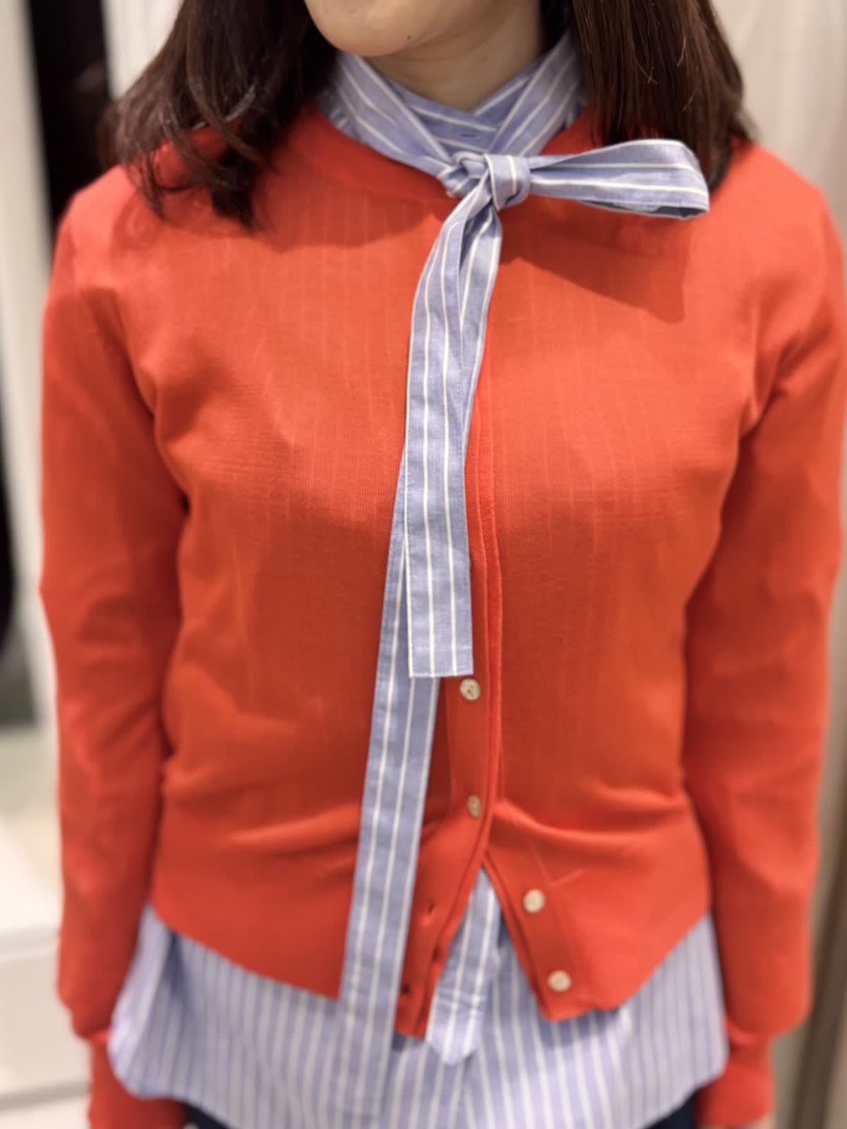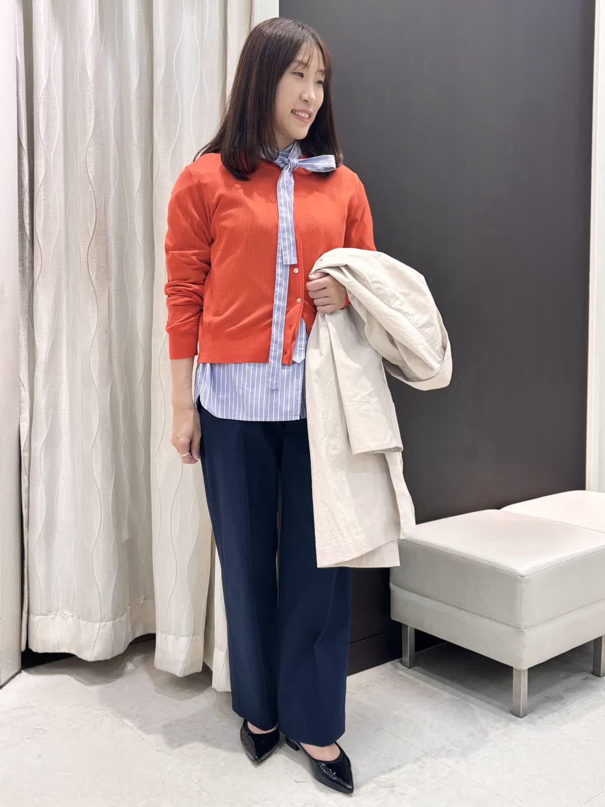 【着用カラー】コート:グレーベージュ カーディガン:オレンジ シャツ:ストライプ パンツ:ネイビー