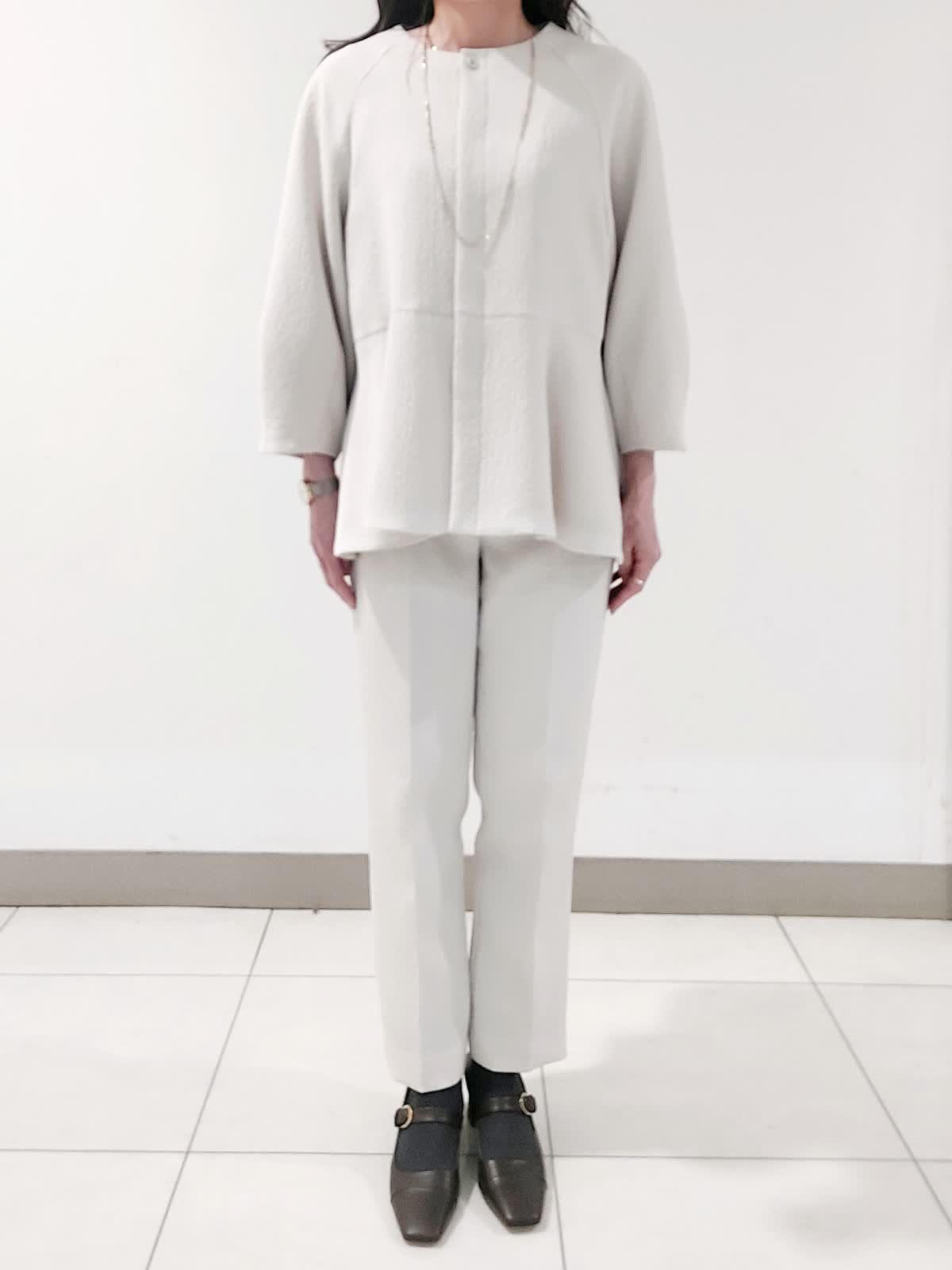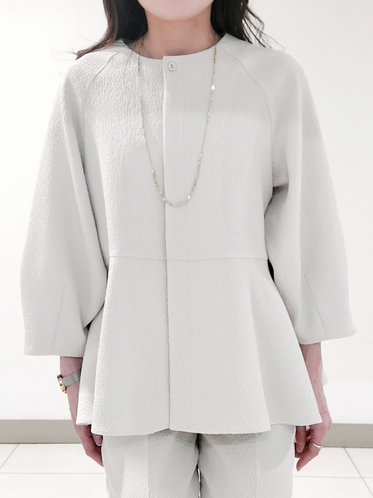 【着用サイズ】ジャケット・9号 パンツ・9号 高級感のあるジャガード素材を活かしたタックディデールがポイントのジャケットは、前開きにすることで羽織りとしても着ていただけます。ふくらみのある袖デザインやペプラム切り替えでアクセントを付けました。同素材のパンツは、すっきりとした美しいシルエットにこだわりました。センタープレスを施しスタイルアップ効果やウエストバックにはゴムを使用し履き心地も抜群です。シワになりにくいイージーケア性やシーズン問わず使える素材も魅力です。