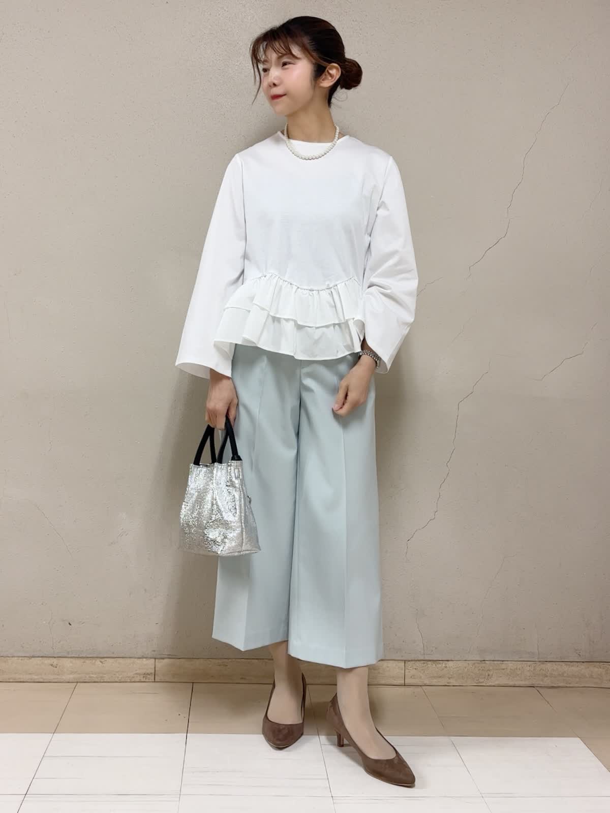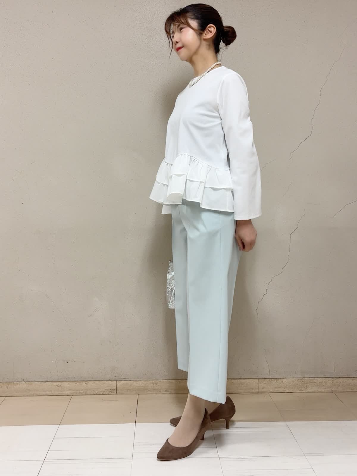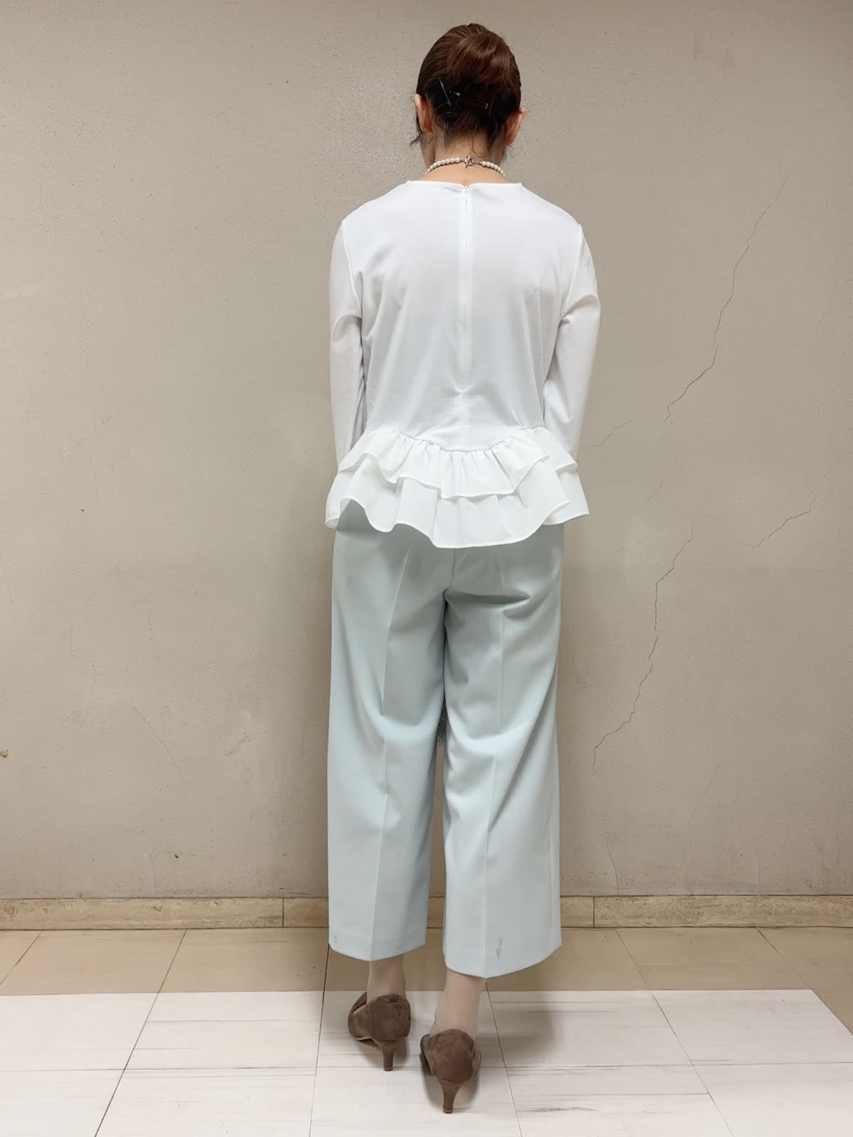 【着用サイズ】裾フリルカットソー:フリー パンツ:11号 【着用カラー】裾フリルカットソー:オフホワイト パンツ:ペールグリーン お出掛けスタイル 白いトップスは、これからのシーズン欠かせません。1枚着としてはもちろん、インナーにしても映えるので是非最初に新調することをお勧めします。