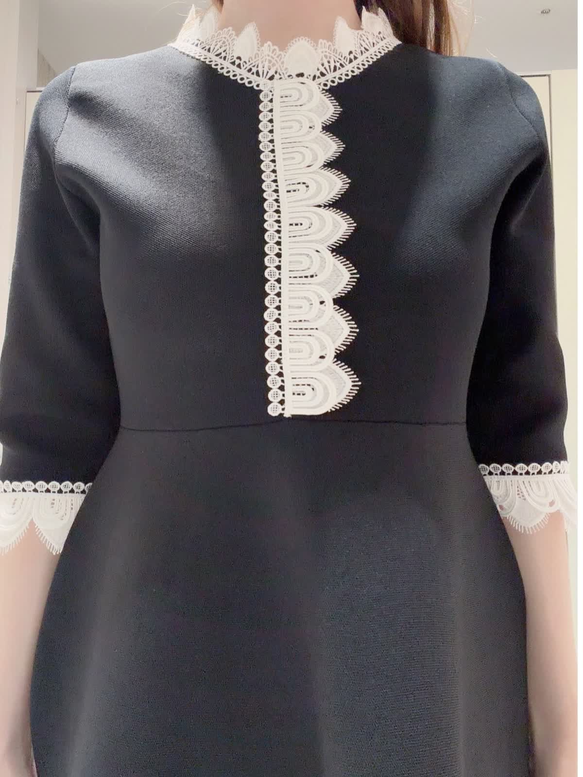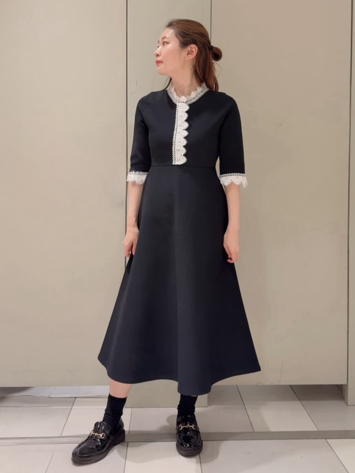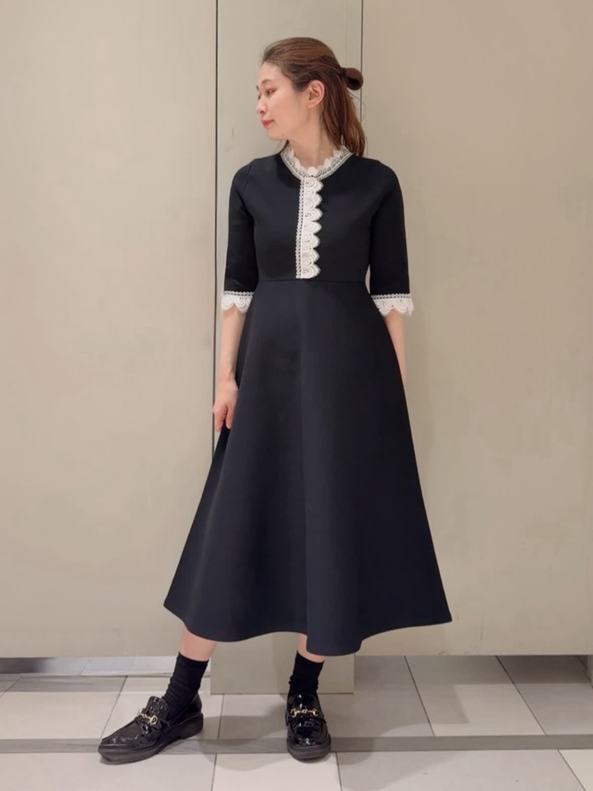 【着用カラー】ワンピース:ブラック 【着用サイズ】ワンピース:5号 レースのデザインが可愛いニットワンピース。1枚でコーディネートが完成するおすすめのワンピース。スカートの部分がフレアなので身体のラインも気にせず着て頂けます。袖のデザインがスッキリとしているので羽織も自在。ロングのニットワンピースですが軽く着心地も抜群です。