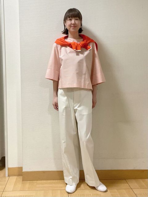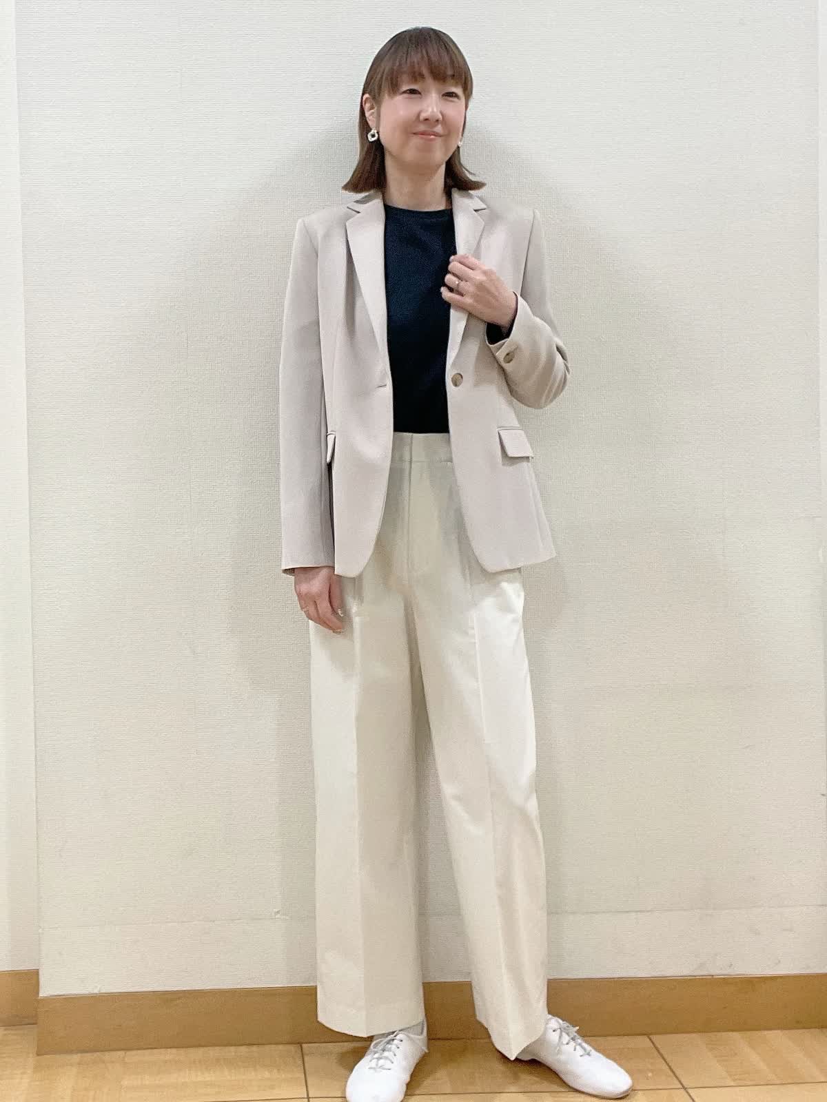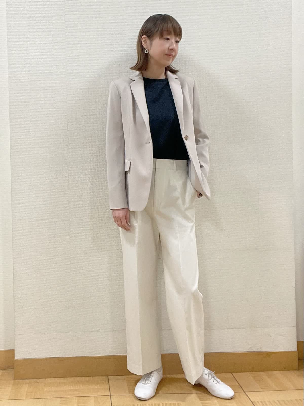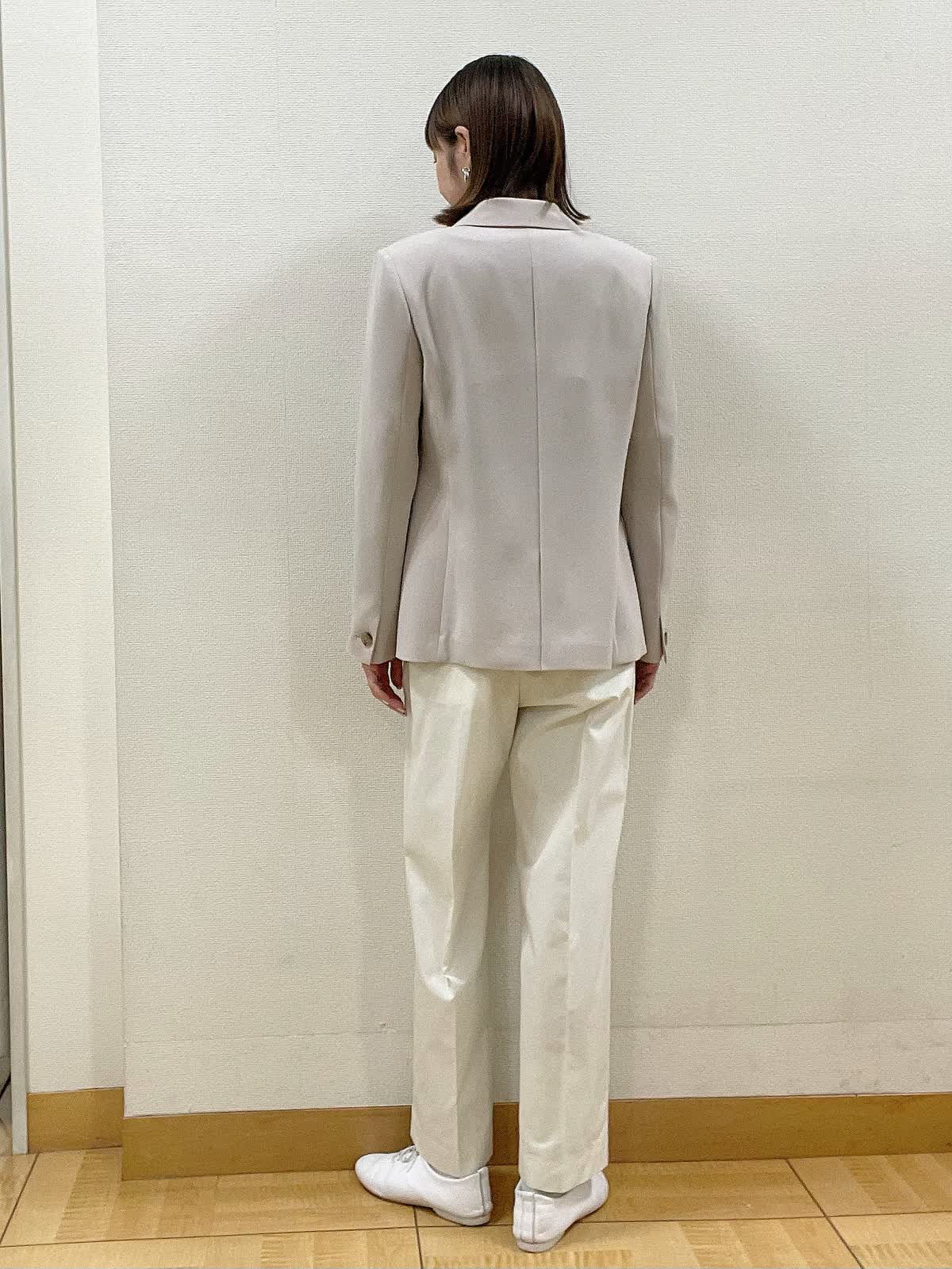 【着用サイズ】ジャケット、パンツと共に:9号 カットソー :フリー 【着用カラー】ジャケット:グレーベージュ カットソー:ブラック パンツ:オフホワイト シンプルなカットソーにジャケットを羽織るだけでお出かけスタイリングの完成。カジュアルなスタイリングにきちんと感をプラス!スタイリングの幅が広がるのでおすすめです。