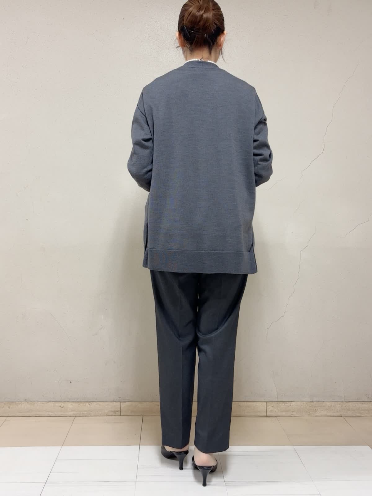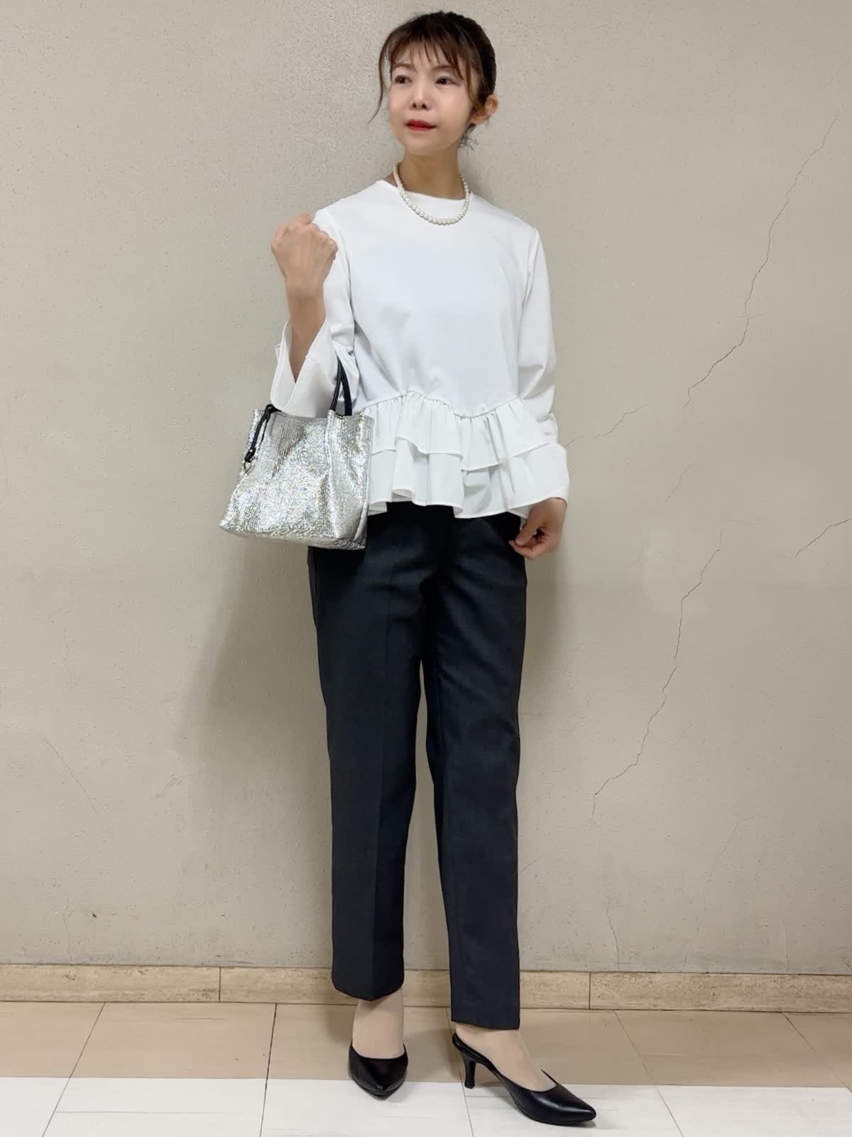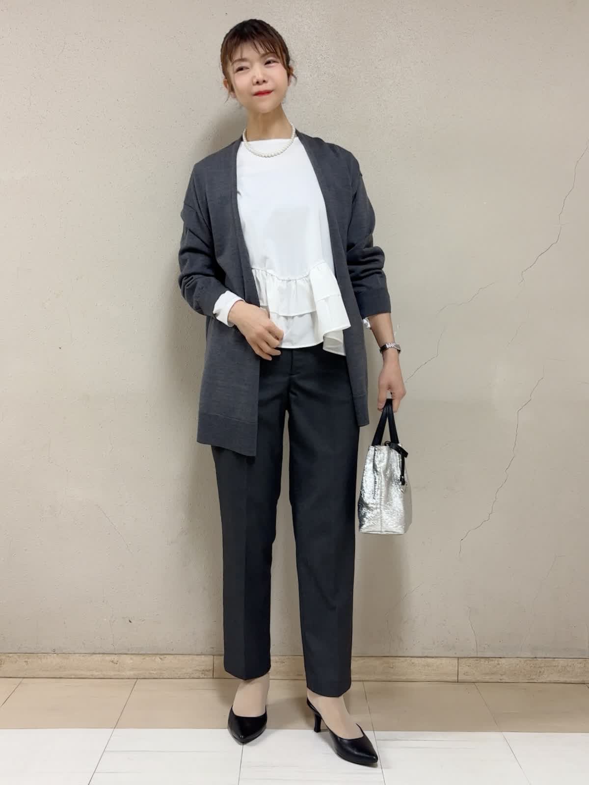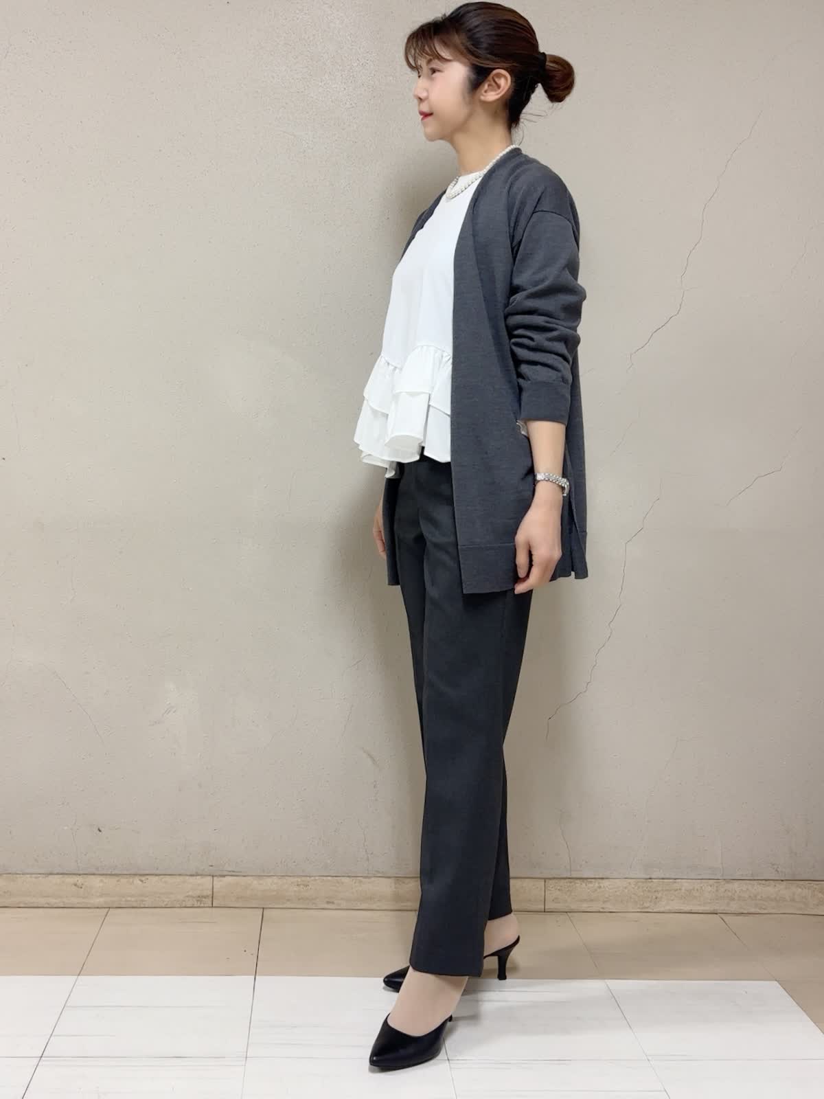 【着用サイズ】STORYコラボカットソー:フリー ロングカーディガン:フリー パンツ:11号 【着用カラー】STORYコラボカットソー:オフホワイト ロングカーディガン:チャコールグレー パンツ:チャコールグレー お出掛けスタイル 裾のフリルが可愛いカットソーだから、あえてベーシックなカラー,アイテムでコーデしました。嫌味なく、ロングカーディガンにバランス良い。