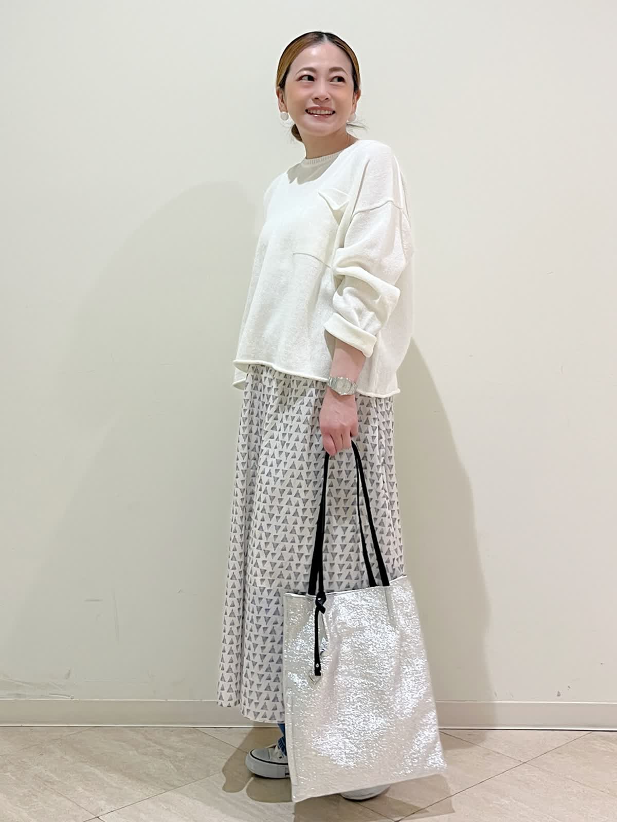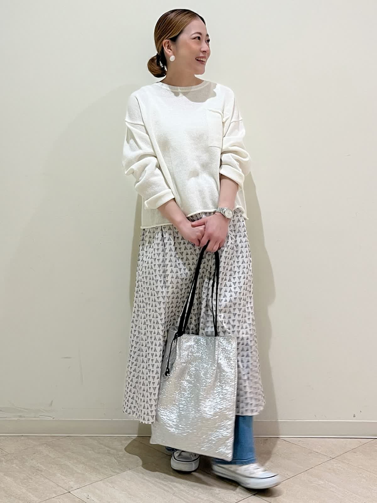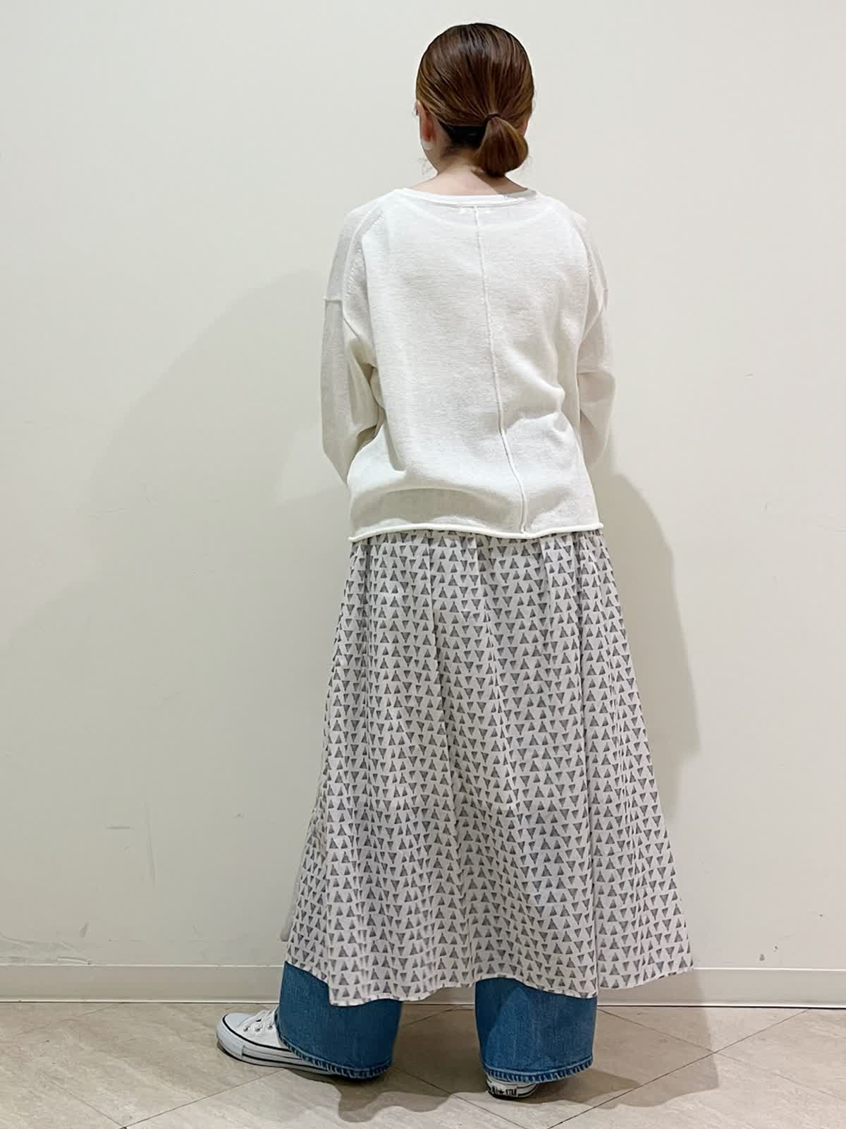 春のお出かけコーディネートです。ゆったりシルエットで一枚で様になるニットです。さらっとドライタッチで着心地が良いです。トライアングル柄のスカートを合わせて華やかに。スカートとデニムをレイヤードで合わせてみました。