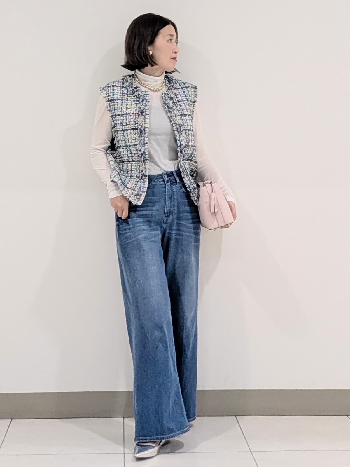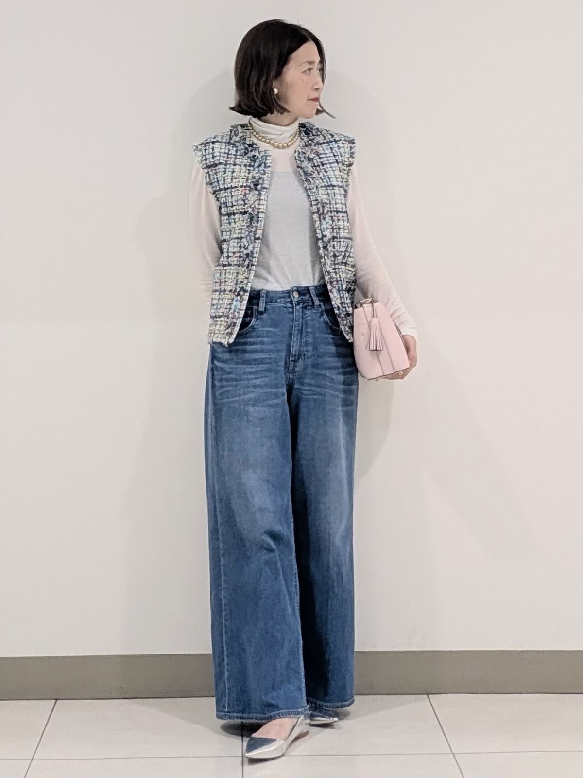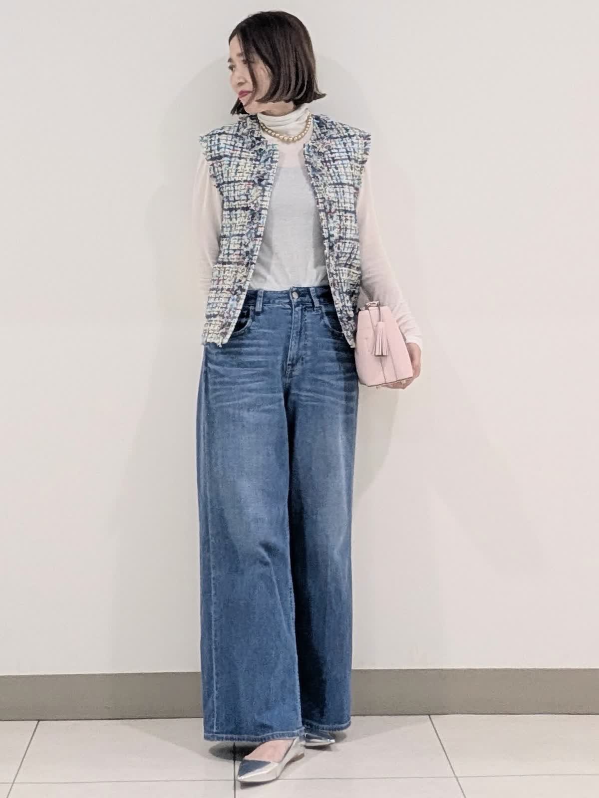 【着用サイズ9号】 《TOURNIER/トゥルニエ》 1865年フランスで創業したファンシーツィードメーカー。フランス色豊かなカラフルな色使いで高級感と存在感のあるファンシーツィードに定評があります。 色々なスタイリングを楽しめる、ワンランク上のコーディネートが楽しめます。 《Healthy DENIM》からウエスト・腰回りにリラックス感のある、ハイライズ・バギーデニムモデルを採用し、イネド別注に。レーヨンのようにしなやかで心地よく、穿き心地バツグンです◎ おすすめのインナーは、ずっと着ていたくなるようなしなやかでソフトな着心地のハイネックプルオーバー。レイヤードスタイルに欠かせないアイテムです。 アクセントのバッグはキャンディのシルエットのようなデザイン。毎日持ち歩きたくなるような可愛らしいバッグです。