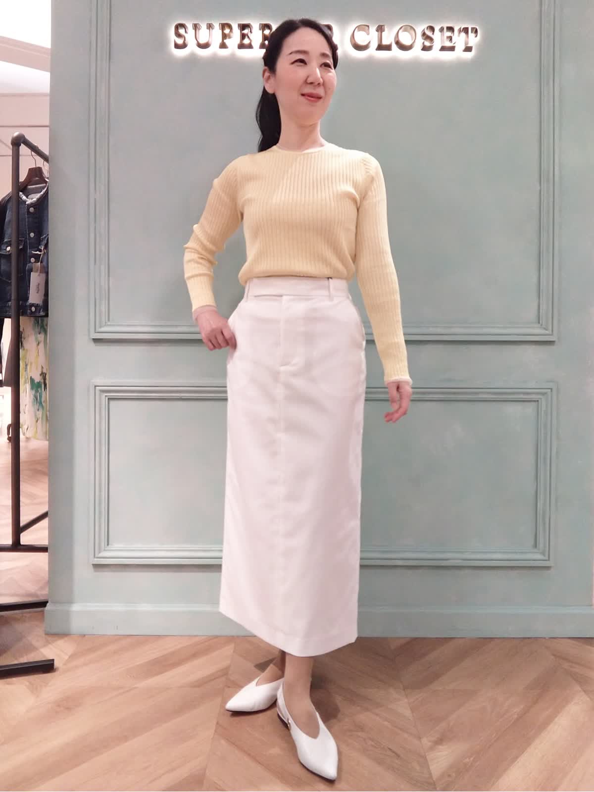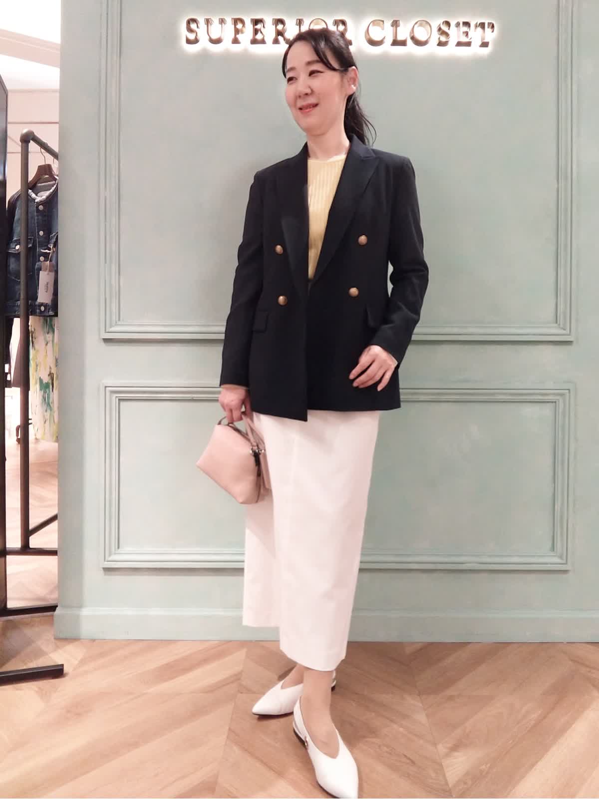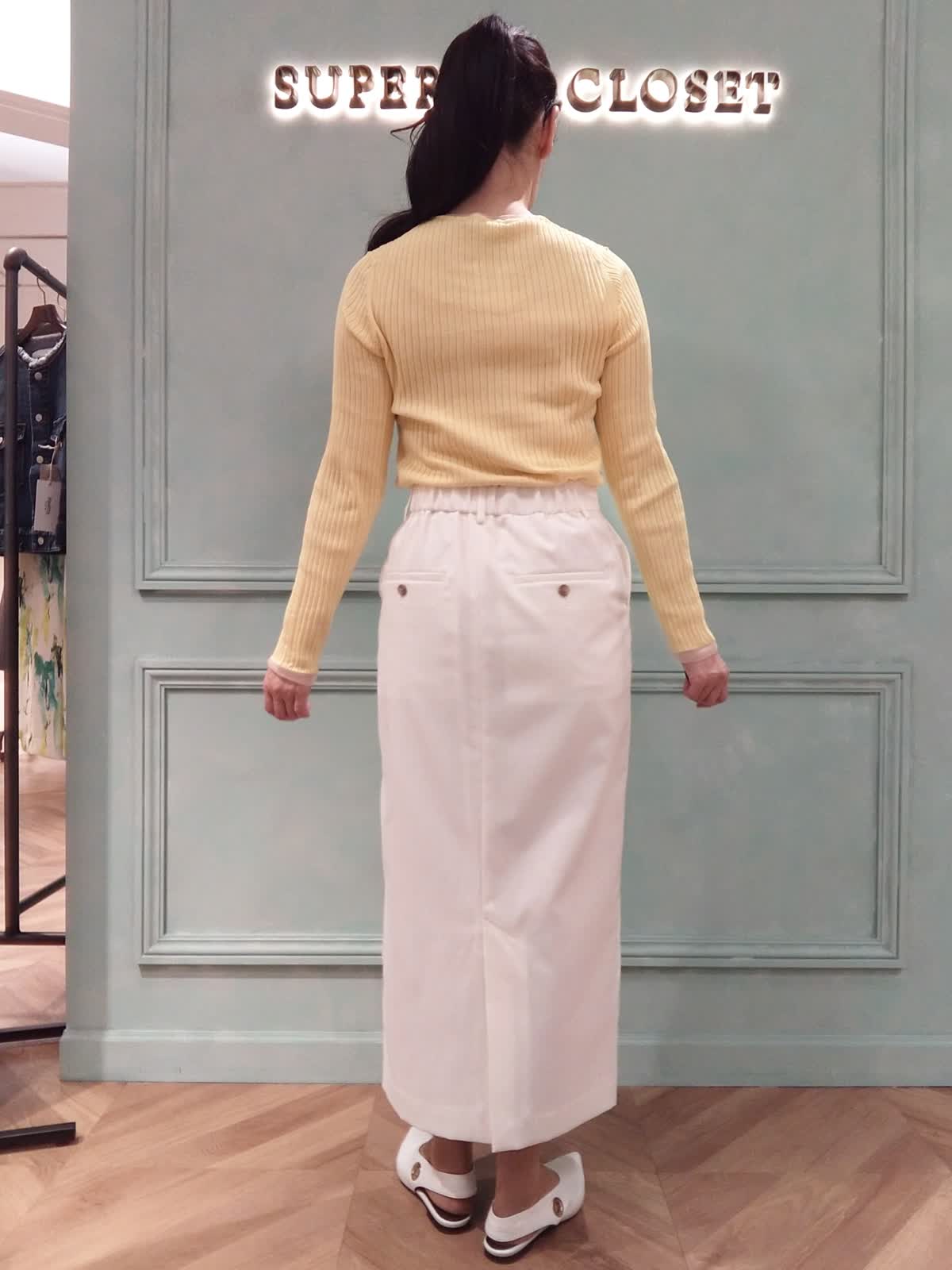 【着用サイズ】ジャケット:9号、ニット:9号、スカート:9号 【着用カラー】ジャケット:ネイビー、ニット:イエロー、スカート:オフホワイト ジャケットスタイル。オフィスとおでかけどちらも使えるダブルプレストのネイビージャケットは、ゴールドボタンが高級感と存在感があります。スッキリリブのイエローニットと白のタイトスカートを合わせてシンプルにコーディネート。ニットは首回りと袖口にシアー素材がドッキング!さりげなくオシャレです。スカートはぴったりし過ぎずIラインシルエット。ウエスト後ろゴム仕様で履きやすいです。