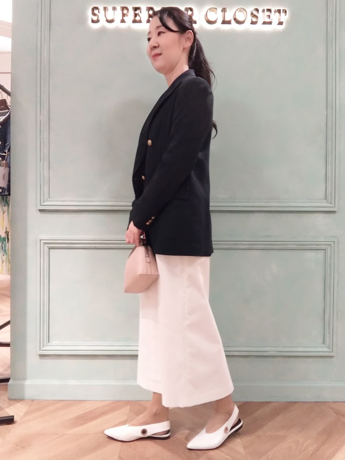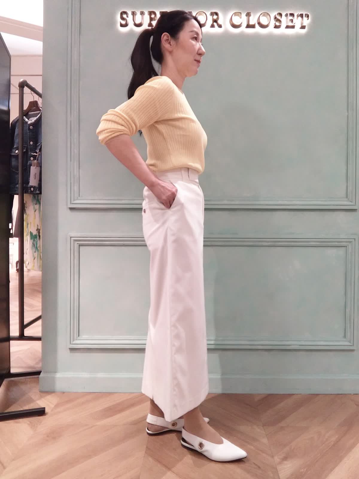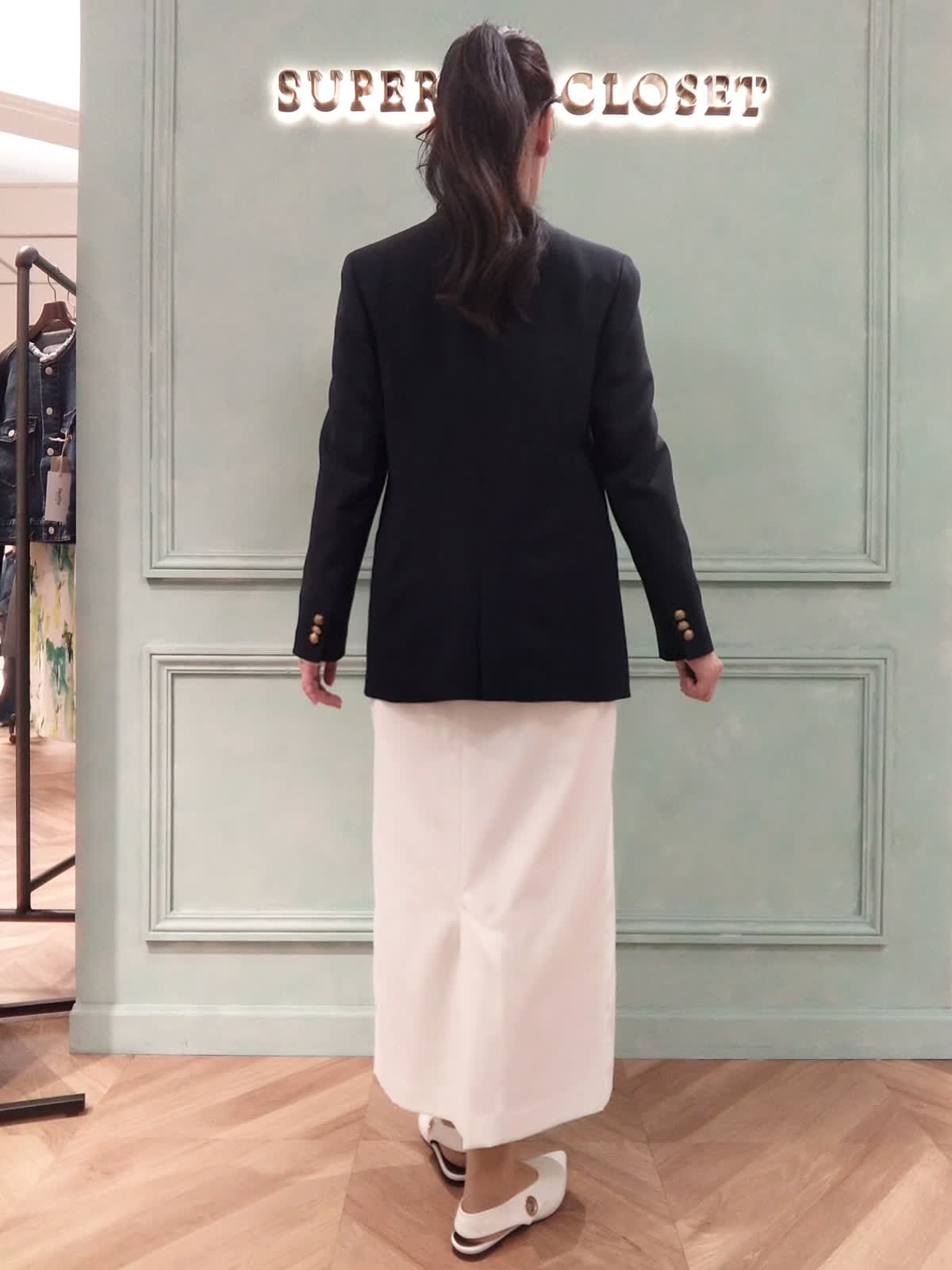 【着用サイズ】ジャケット:9号、ニット:9号、スカート:9号 【着用カラー】ジャケット:ネイビー、ニット:イエロー、スカート:オフホワイト ジャケットスタイル。オフィスとおでかけどちらも使えるダブルプレストのネイビージャケットは、ゴールドボタンが高級感と存在感があります。スッキリリブのイエローニットと白のタイトスカートを合わせてシンプルにコーディネート。ニットは首回りと袖口にシアー素材がドッキング!さりげなくオシャレです。スカートはぴったりし過ぎずIラインシルエット。ウエスト後ろゴム仕様で履きやすいです。