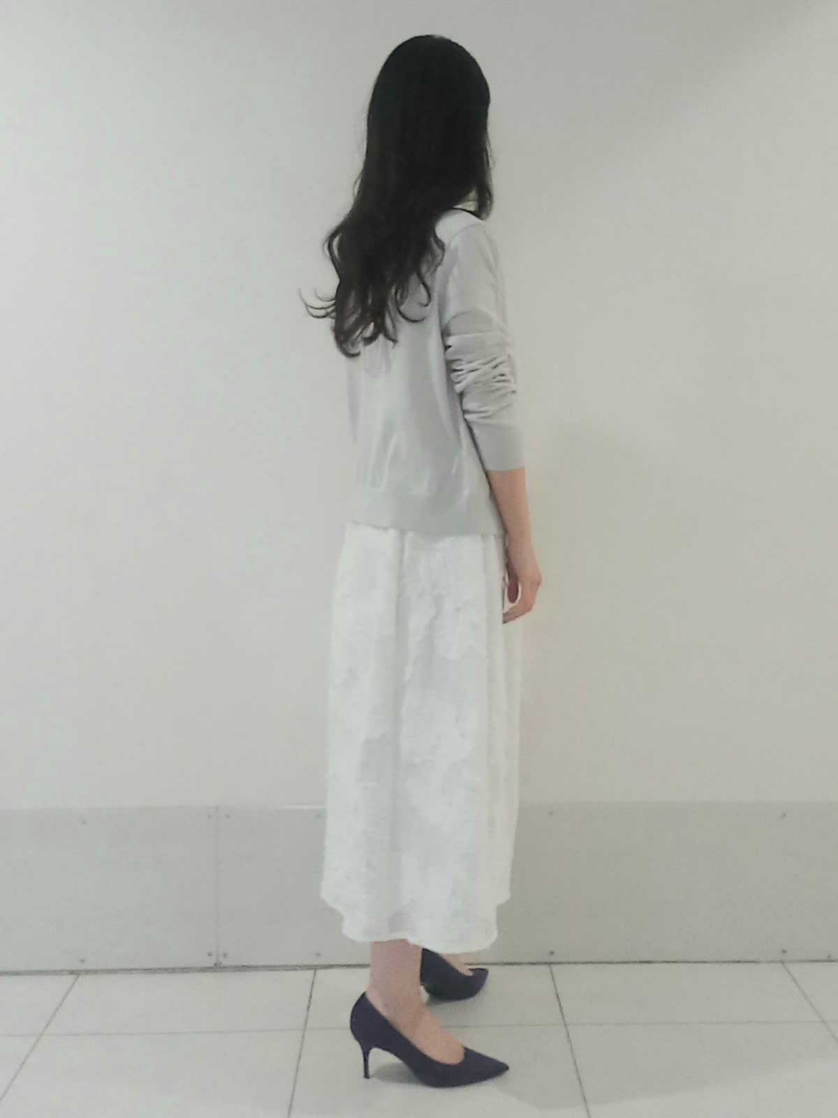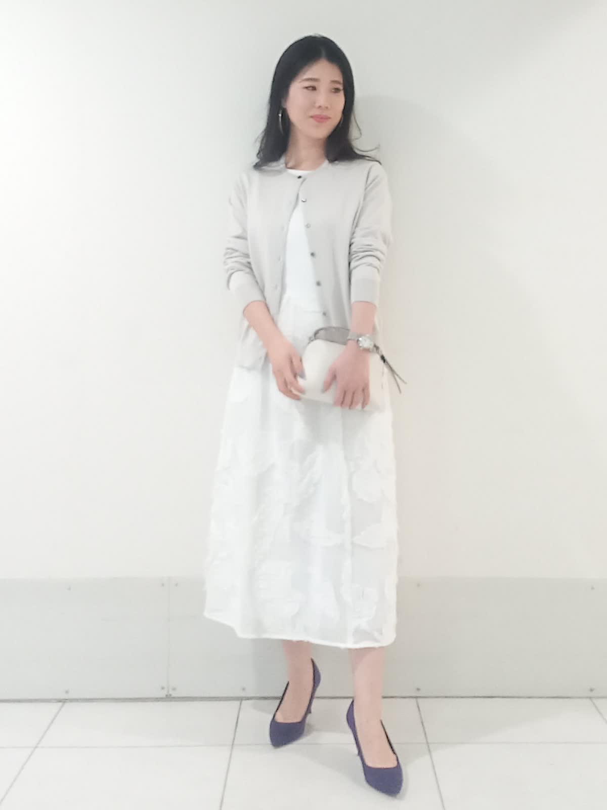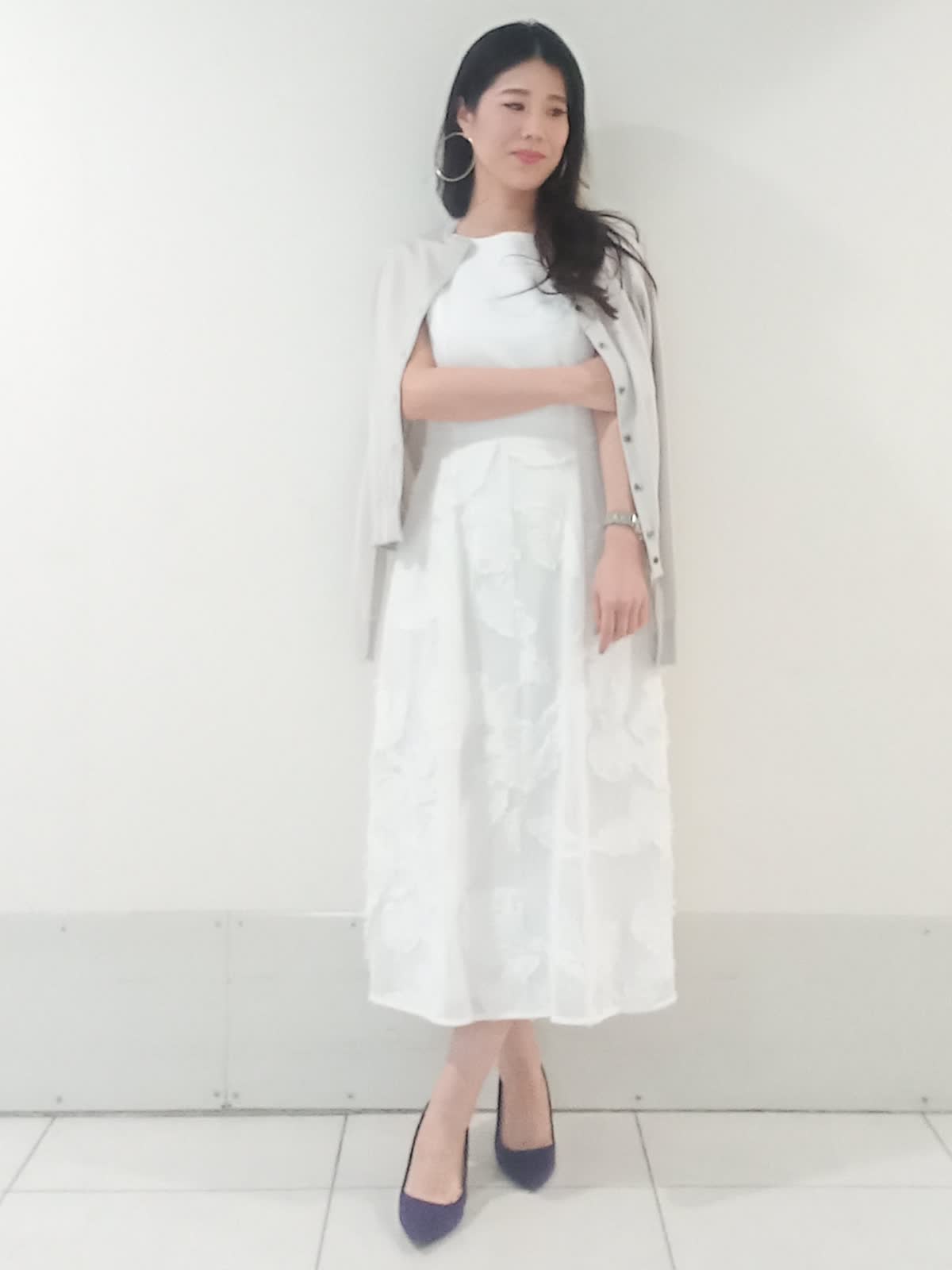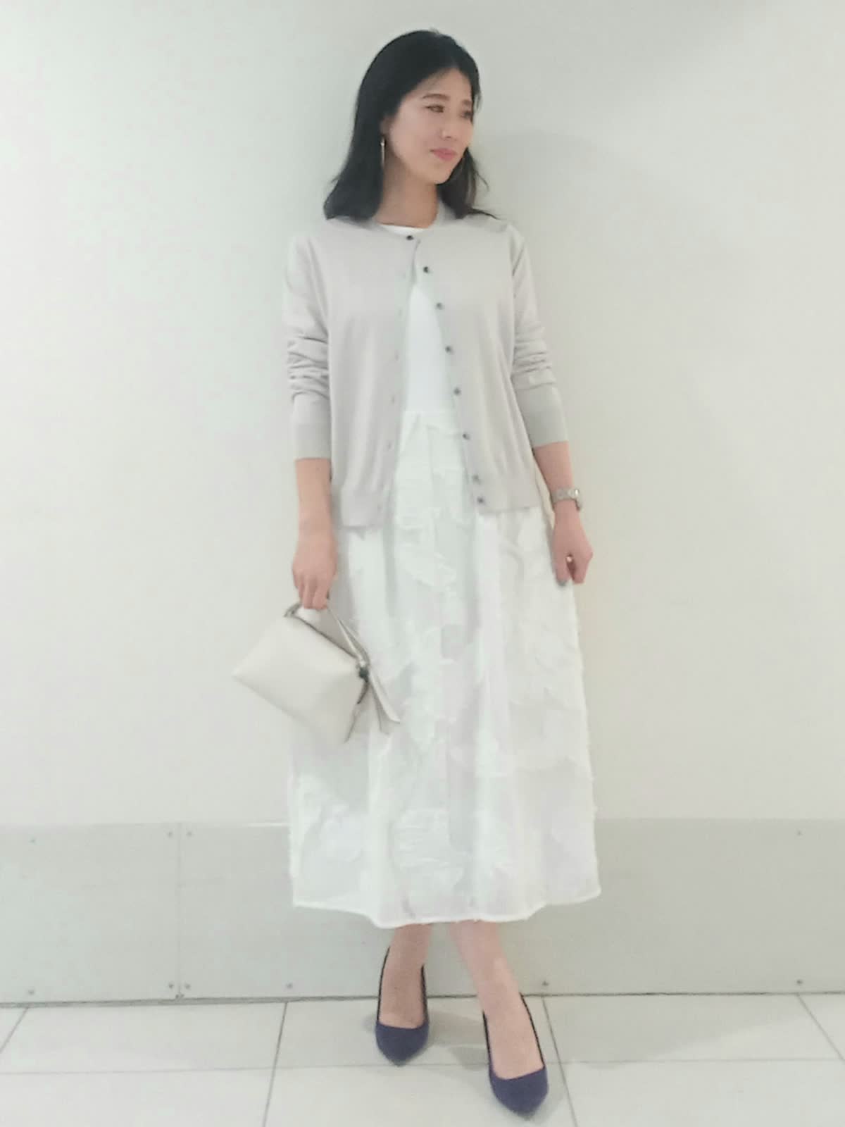 【着用サイズ、カーディガン9号、ワンピース9号】 全身を明るいトーンでまとめ「la veille」の異素材ワンピースを主役にしたフェミニンなコーディネートに仕上げました。 スカート部分の立体的なジャガード素材がワントーンコーデに豊かな表情を与えます。 ?滑らかなハイゲージニットのカーディガンは視線を上げる絶妙な着丈のバランスで、羽織るだけでワンピースの華やかな素材感がより際立ち上品な印象に。 親しみやすいきれいめオフィススタイルでも、華やかで上品なパーティースタイルでも活躍する上質なワンピースです。
