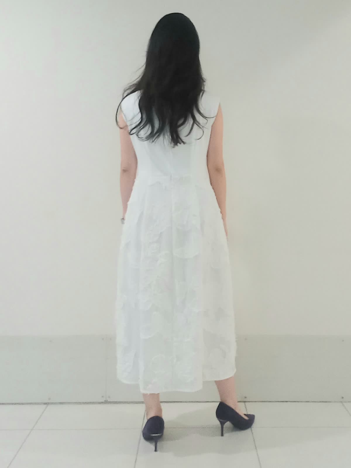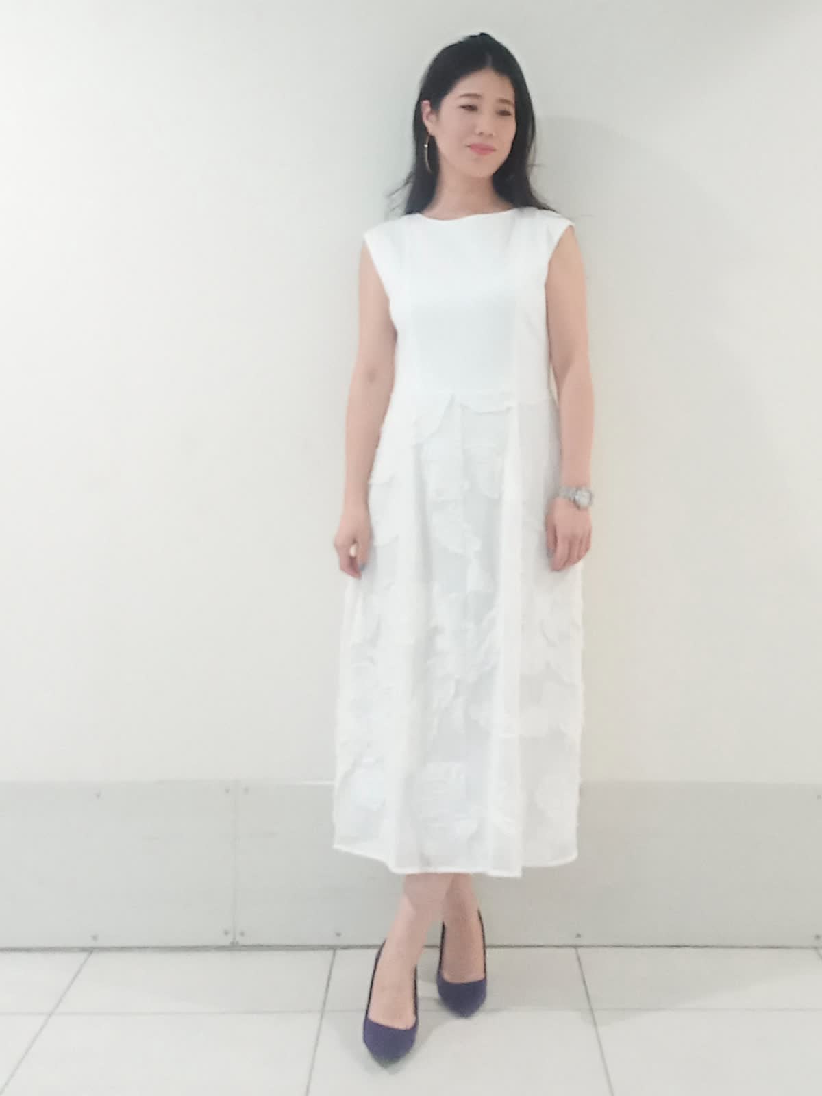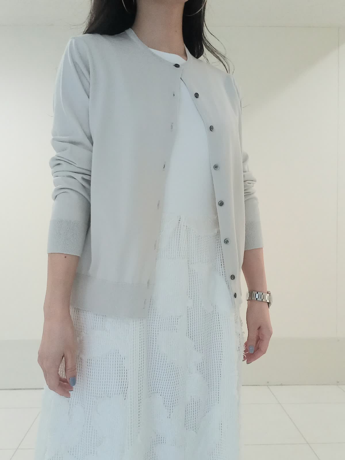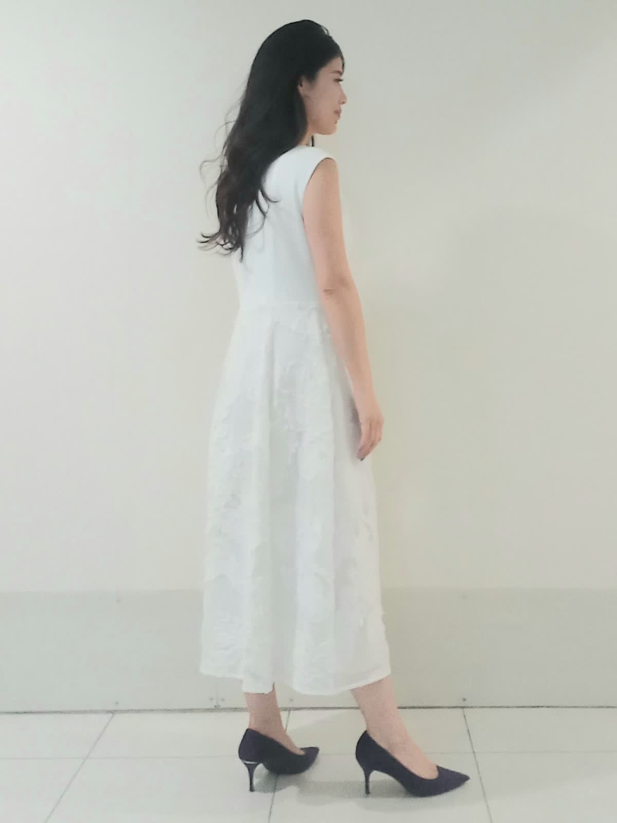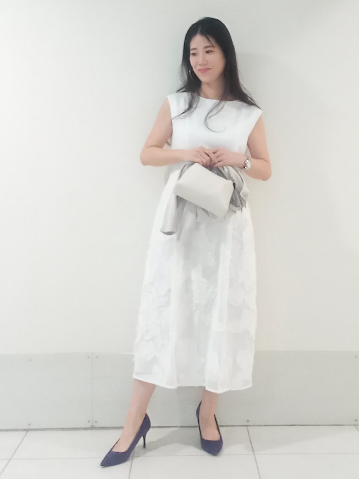 【着用サイズ、カーディガン9号、ワンピース9号】 全身を明るいトーンでまとめ「la veille」の異素材ワンピースを主役にしたフェミニンなコーディネートに仕上げました。 スカート部分の立体的なジャガード素材がワントーンコーデに豊かな表情を与えます。 ?滑らかなハイゲージニットのカーディガンは視線を上げる絶妙な着丈のバランスで、羽織るだけでワンピースの華やかな素材感がより際立ち上品な印象に。 親しみやすいきれいめオフィススタイルでも、華やかで上品なパーティースタイルでも活躍する上質なワンピースです。