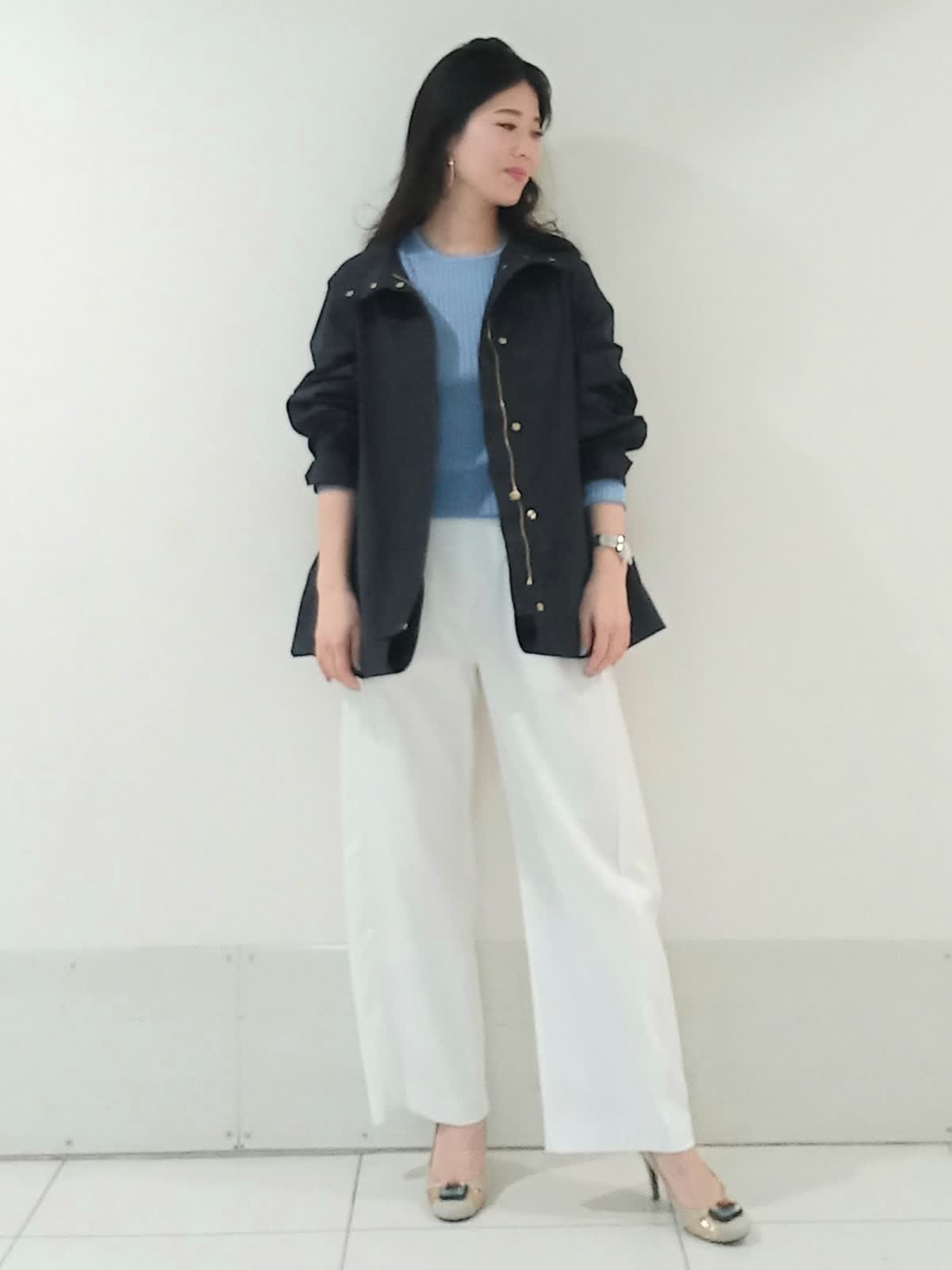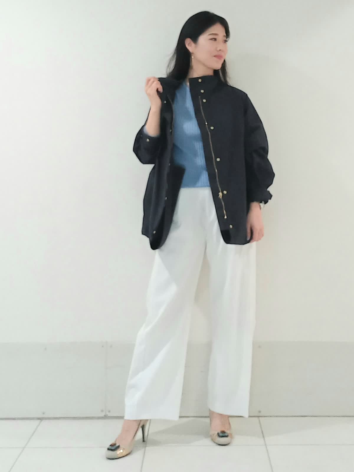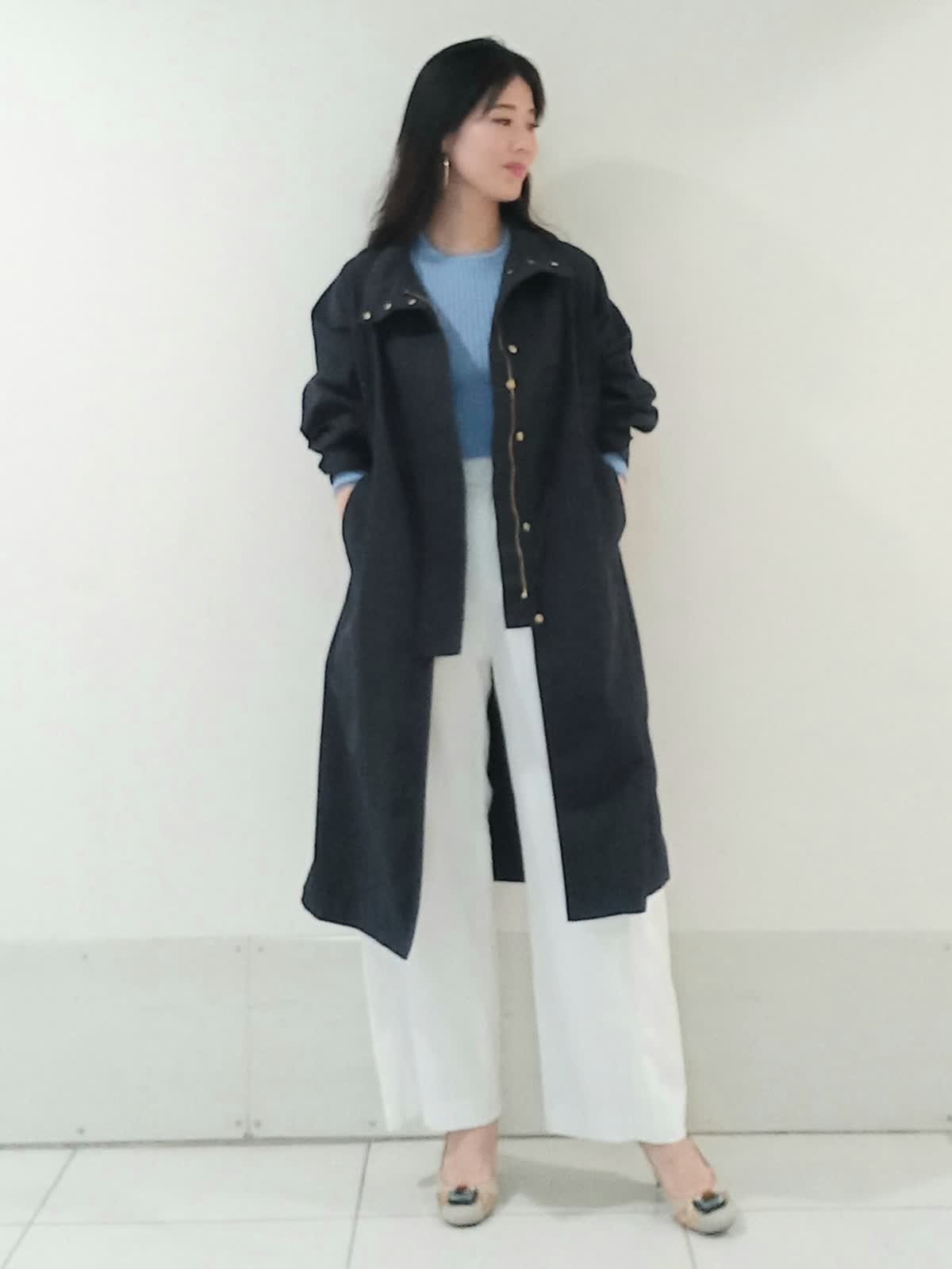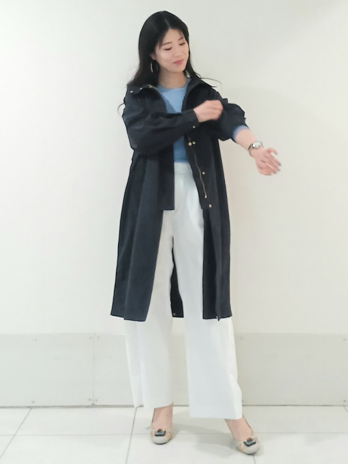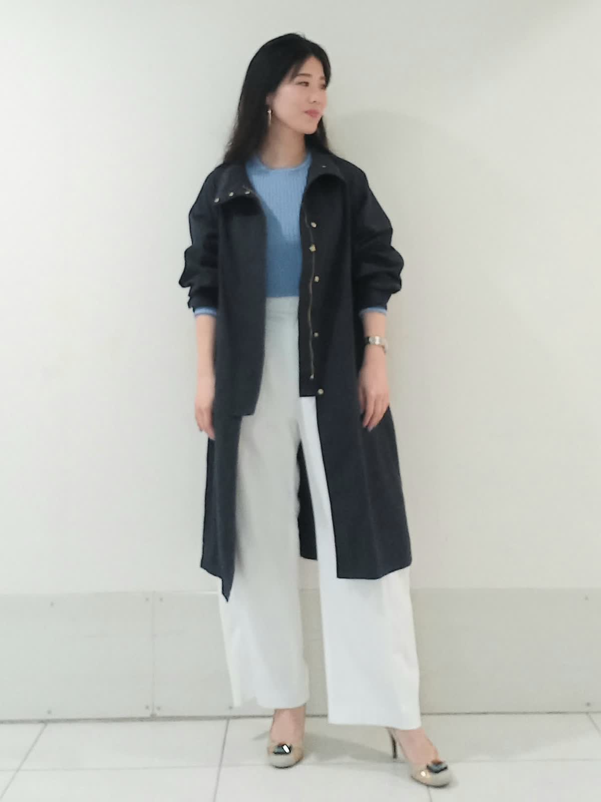 【着用サイズ、2wayコート9号、ニット9号、パンツ9号】 素材に軽さを出したさらりと羽織れる2wayコート、ロング丈もショート丈も楽しめる万能コートです。 ロング丈は縦のラインが強調されシュッとしたIラインシルエットで大人っぽく、ショート丈はコートを折り返すことで重心が上がり脚長効果も!より軽やかでアクティブな印象に変わります。 コートのボタンを上の方だけ留めたり、開けて見せたりすることでゴールドのドットボタンがアクセサリーのような役割にも。 インナーに合わせたブルーのリブニットは柔らかく着心地抜群です一枚でも華やかに決まります。 ボトムのホワイトがネイビーのコートに映えてパッと明るい印象を与えます。