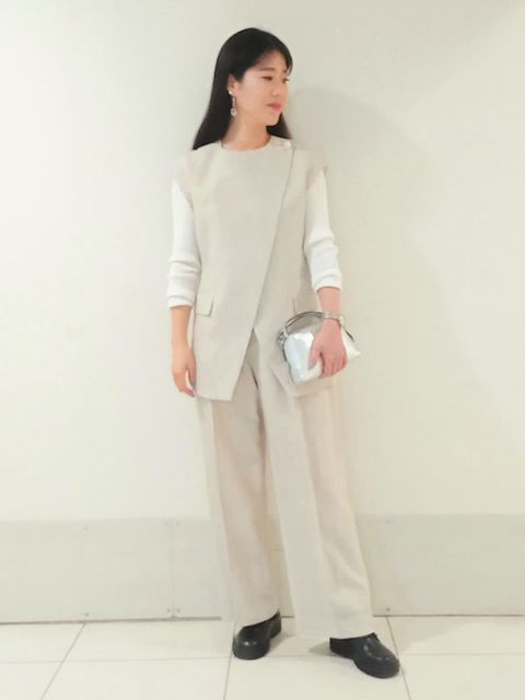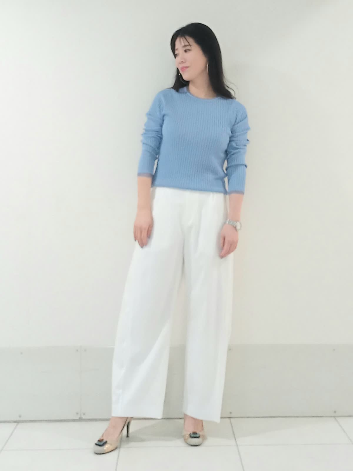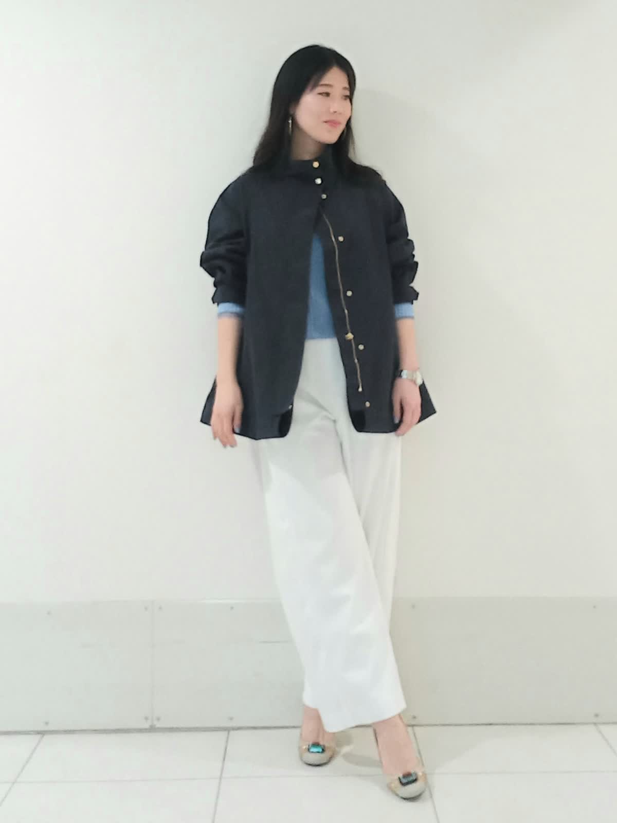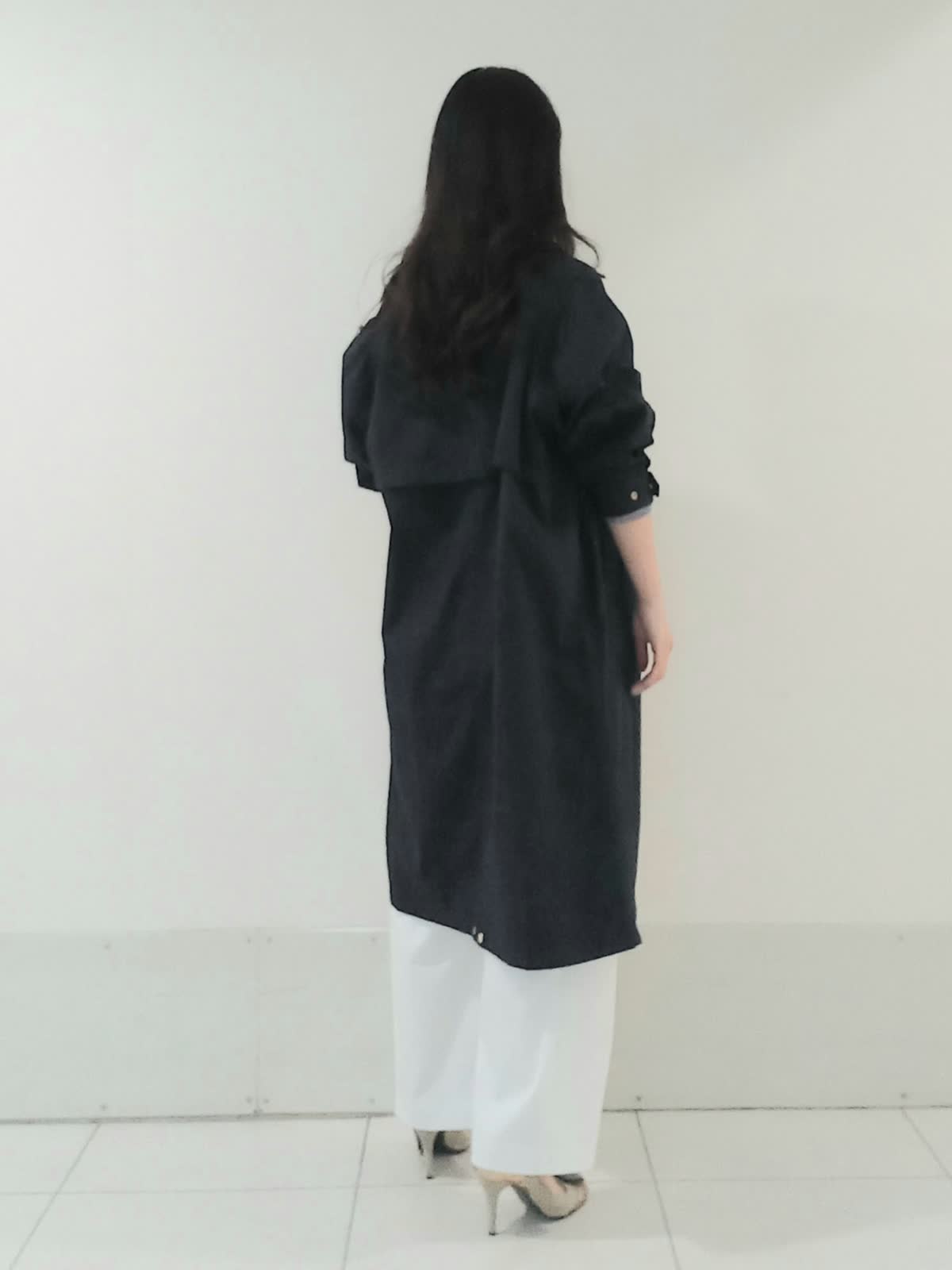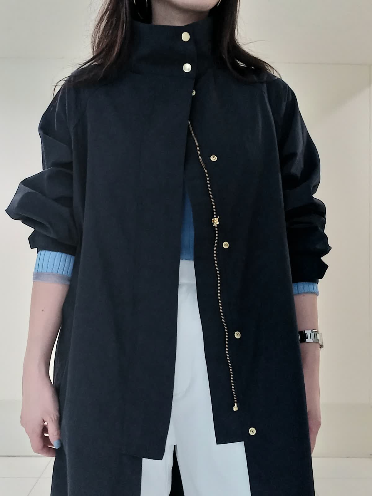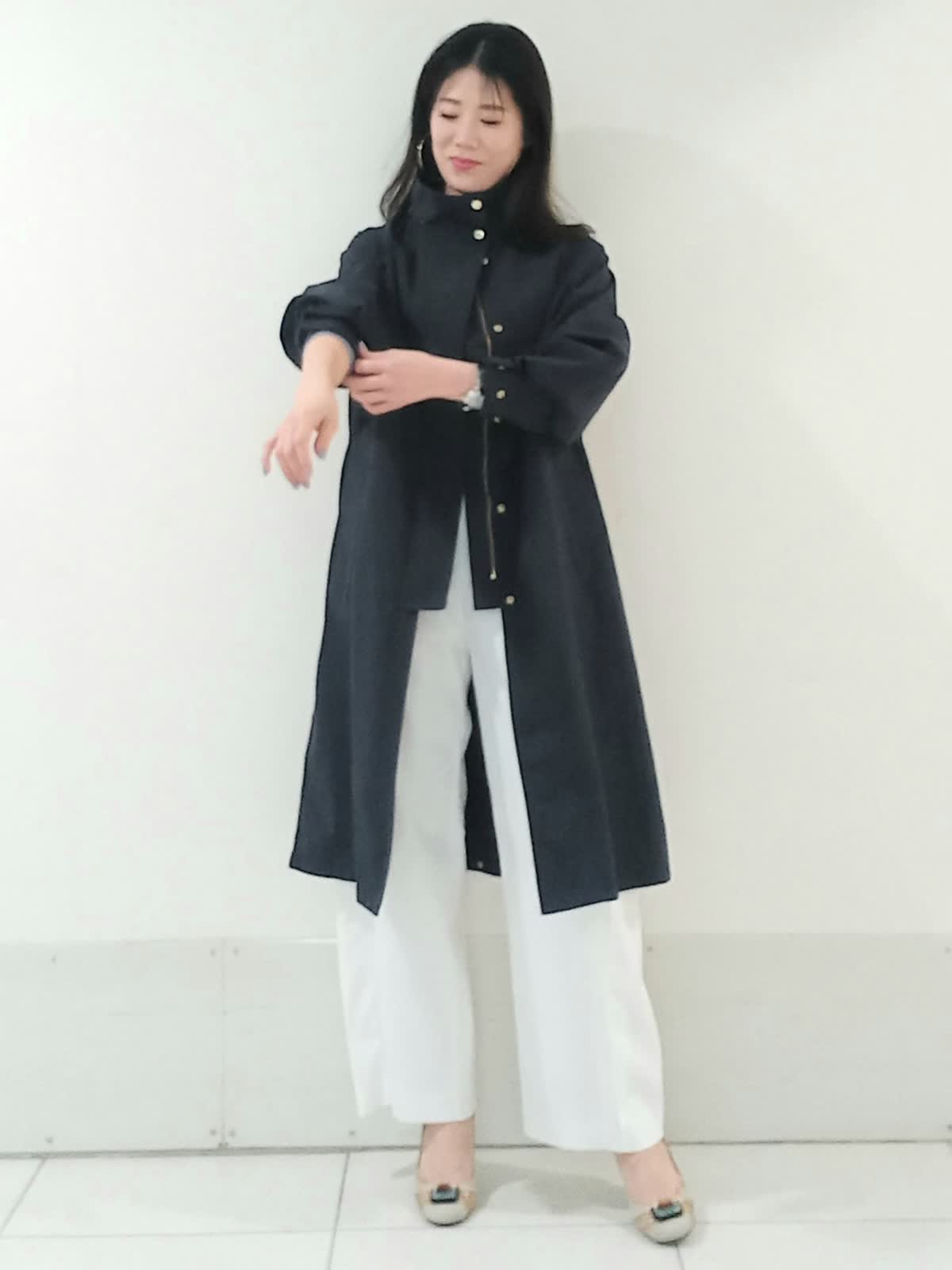 【着用サイズ、2wayコート9号、ニット9号、パンツ9号】 素材に軽さを出したさらりと羽織れる2wayコート、ロング丈もショート丈も楽しめる万能コートです。 ロング丈は縦のラインが強調されシュッとしたIラインシルエットで大人っぽく、ショート丈はコートを折り返すことで重心が上がり脚長効果も!より軽やかでアクティブな印象に変わります。 コートのボタンを上の方だけ留めたり、開けて見せたりすることでゴールドのドットボタンがアクセサリーのような役割にも。 インナーに合わせたブルーのリブニットは柔らかく着心地抜群です一枚でも華やかに決まります。 ボトムのホワイトがネイビーのコートに映えてパッと明るい印象を与えます。