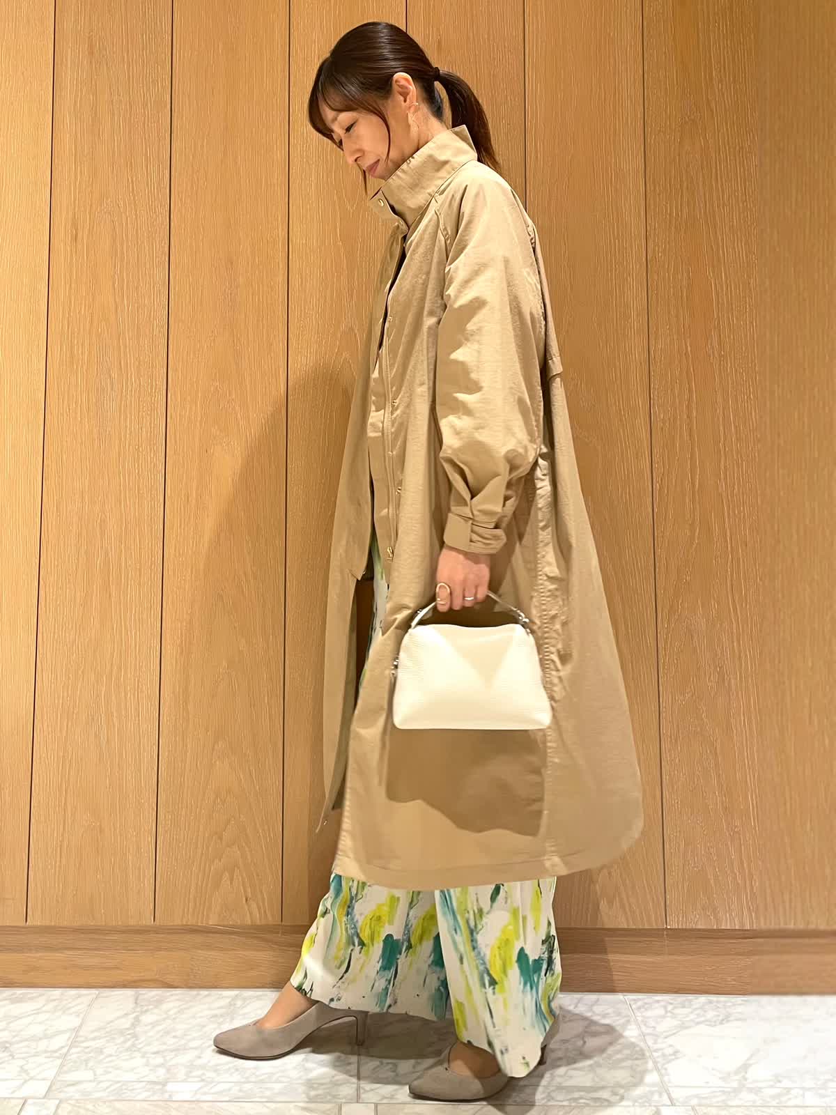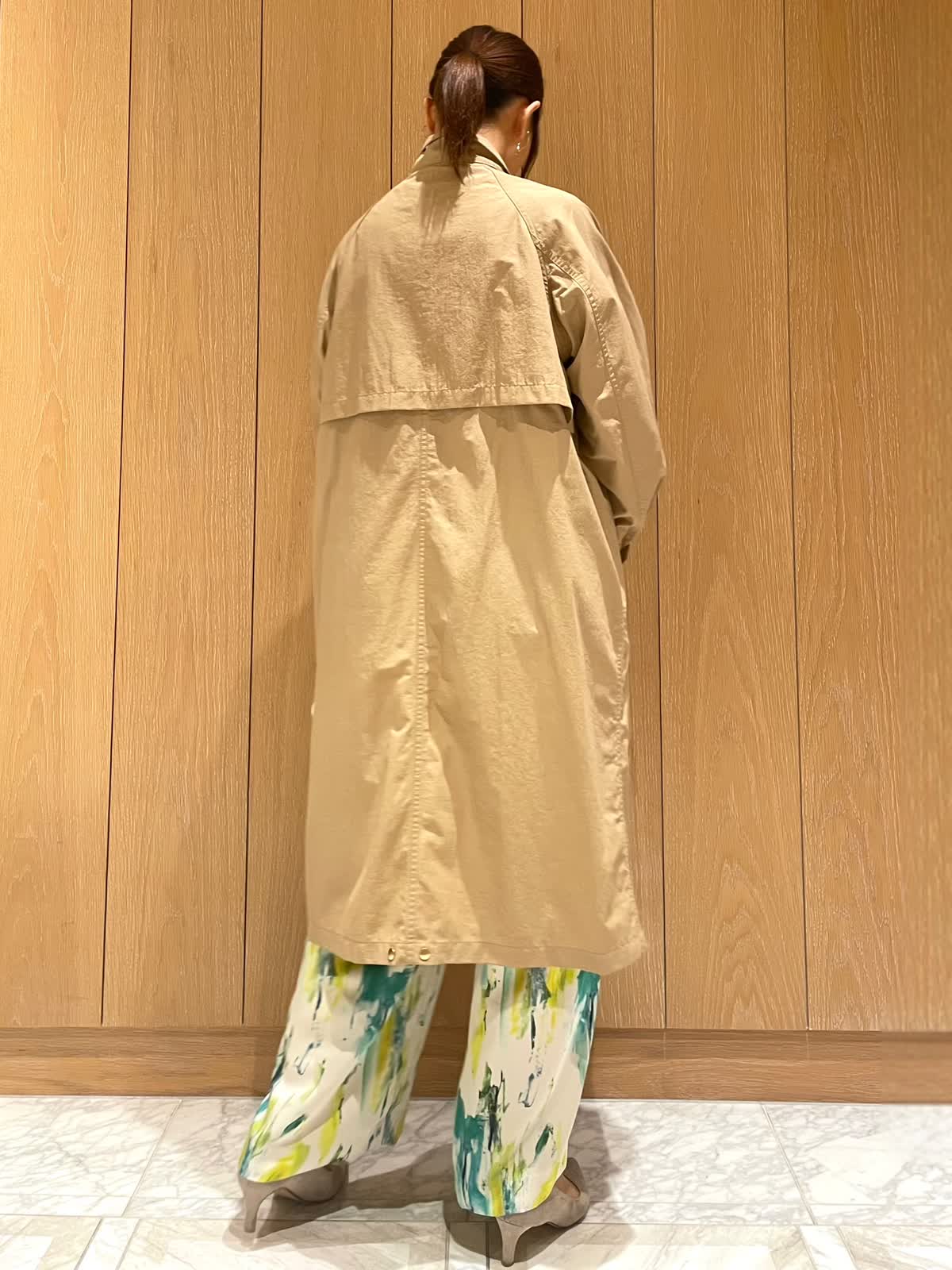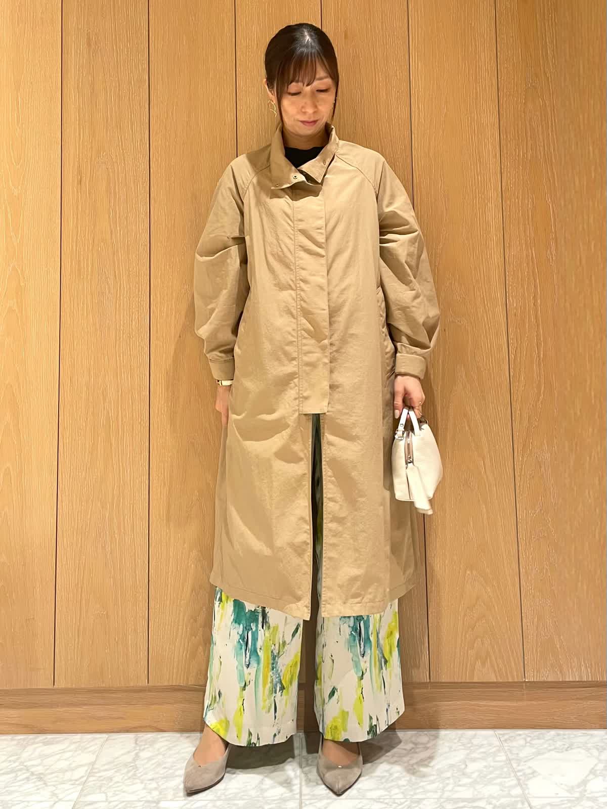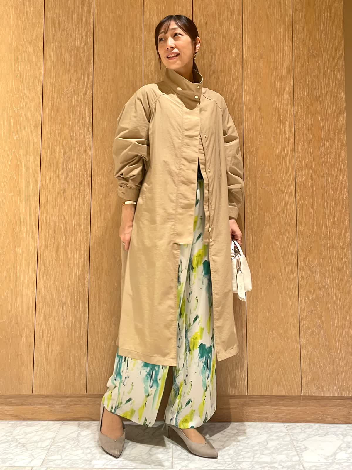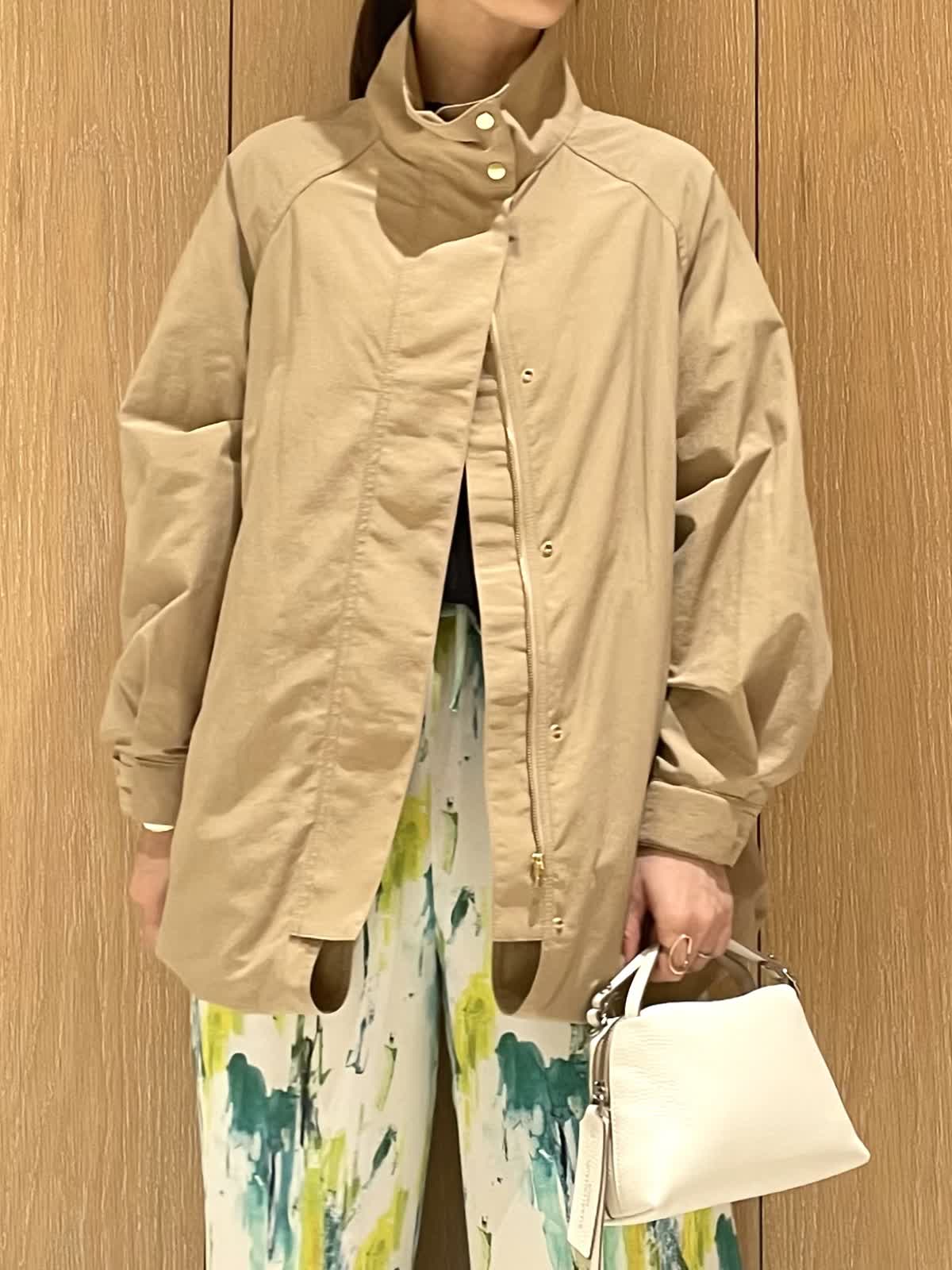 【着用サイズ・カラー】コート : 7号 キャメル ニット : 9号 ネイビー パンツ : 7号 ペパーミント 春のお出かけスタイルです。さらっと羽織るだけで着映えするスタンドコート。裾のスナップボタンで着丈を変えることができる万能な2WAYコートです。見た目よりも軽くて柔らかい素材です。春らしいプリントパンツを合わせると、より気分の上がるスタイリングになります。