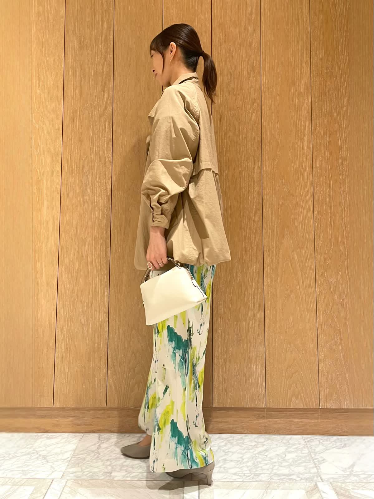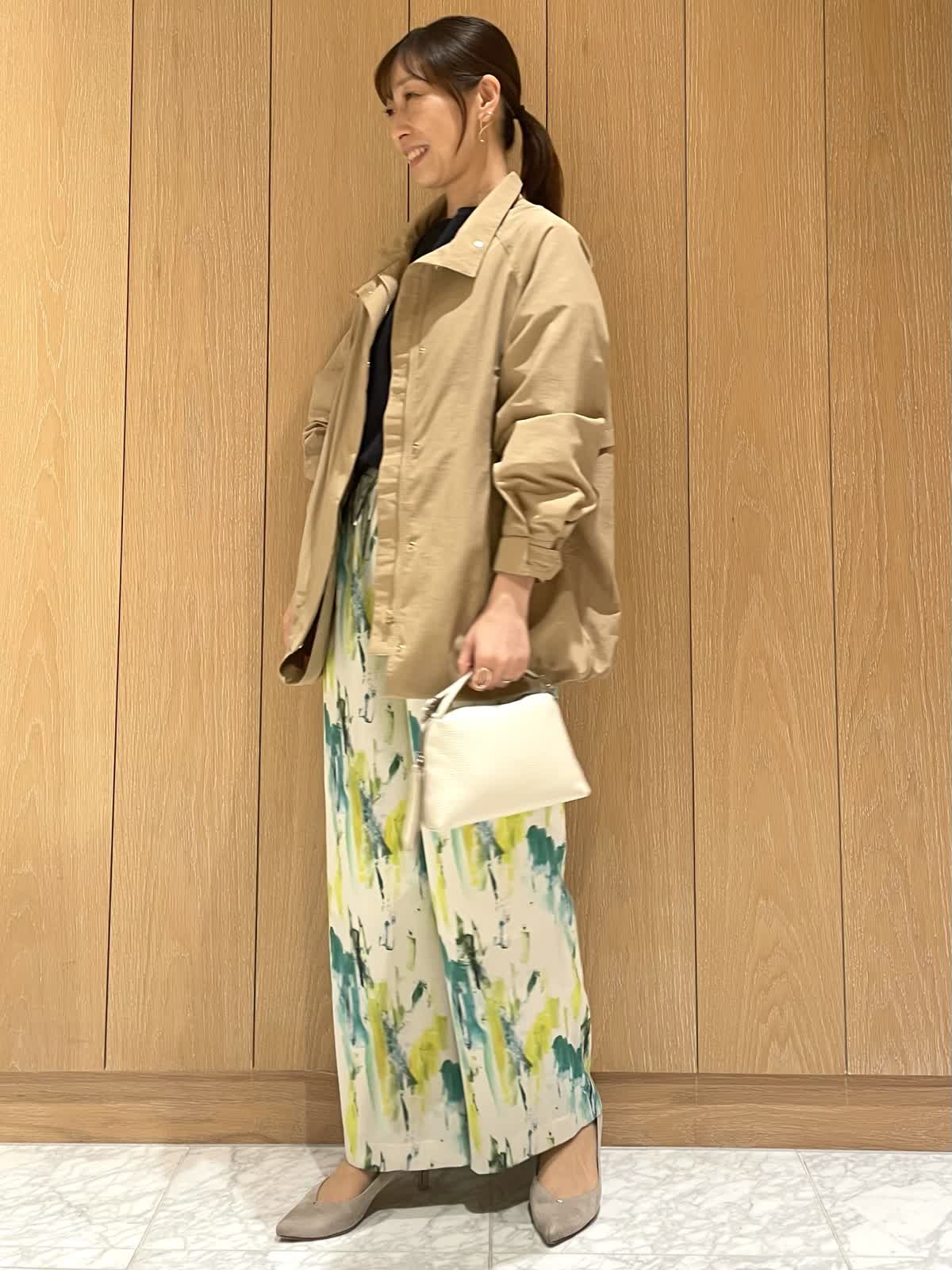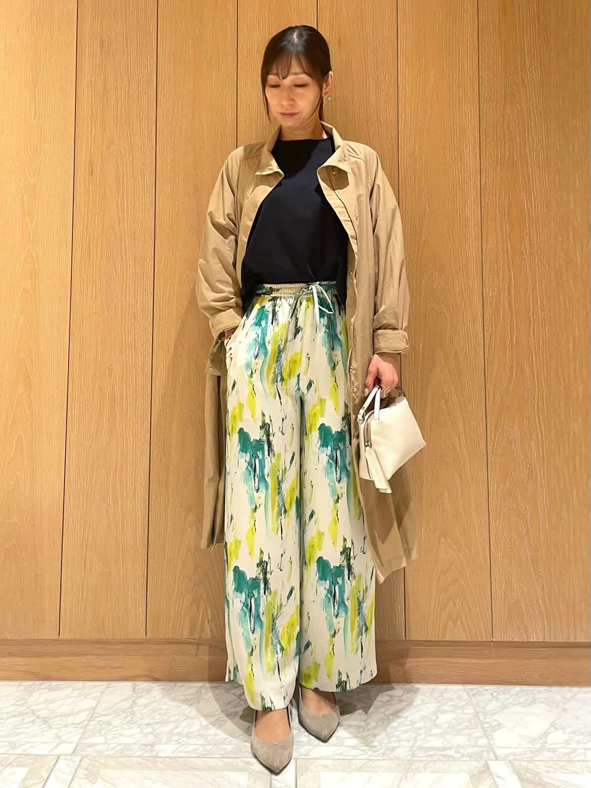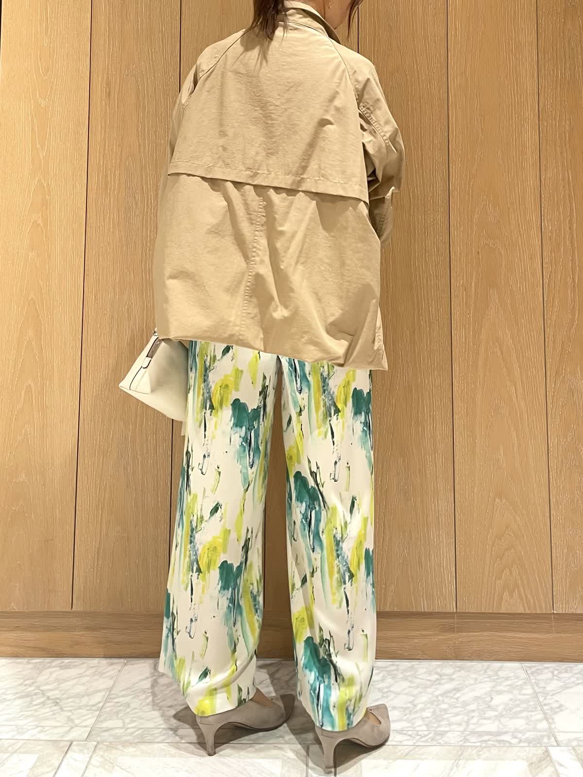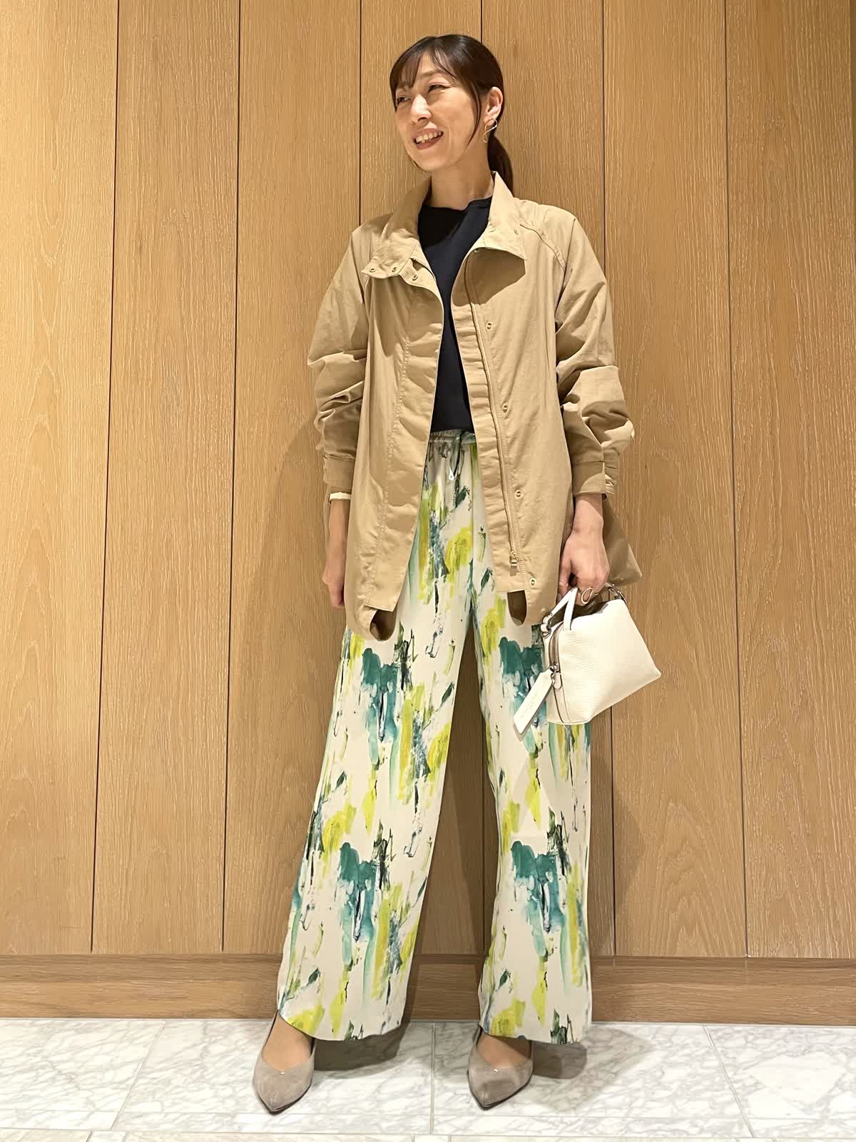 【着用サイズ・カラー】コート : 7号 キャメル ニット : 9号 ネイビー パンツ : 7号 ペパーミント 春のお出かけスタイルです。さらっと羽織るだけで着映えするスタンドコート。裾のスナップボタンで着丈を変えることができる万能な2WAYコートです。見た目よりも軽くて柔らかい素材です。春らしいプリントパンツを合わせると、より気分の上がるスタイリングになります。