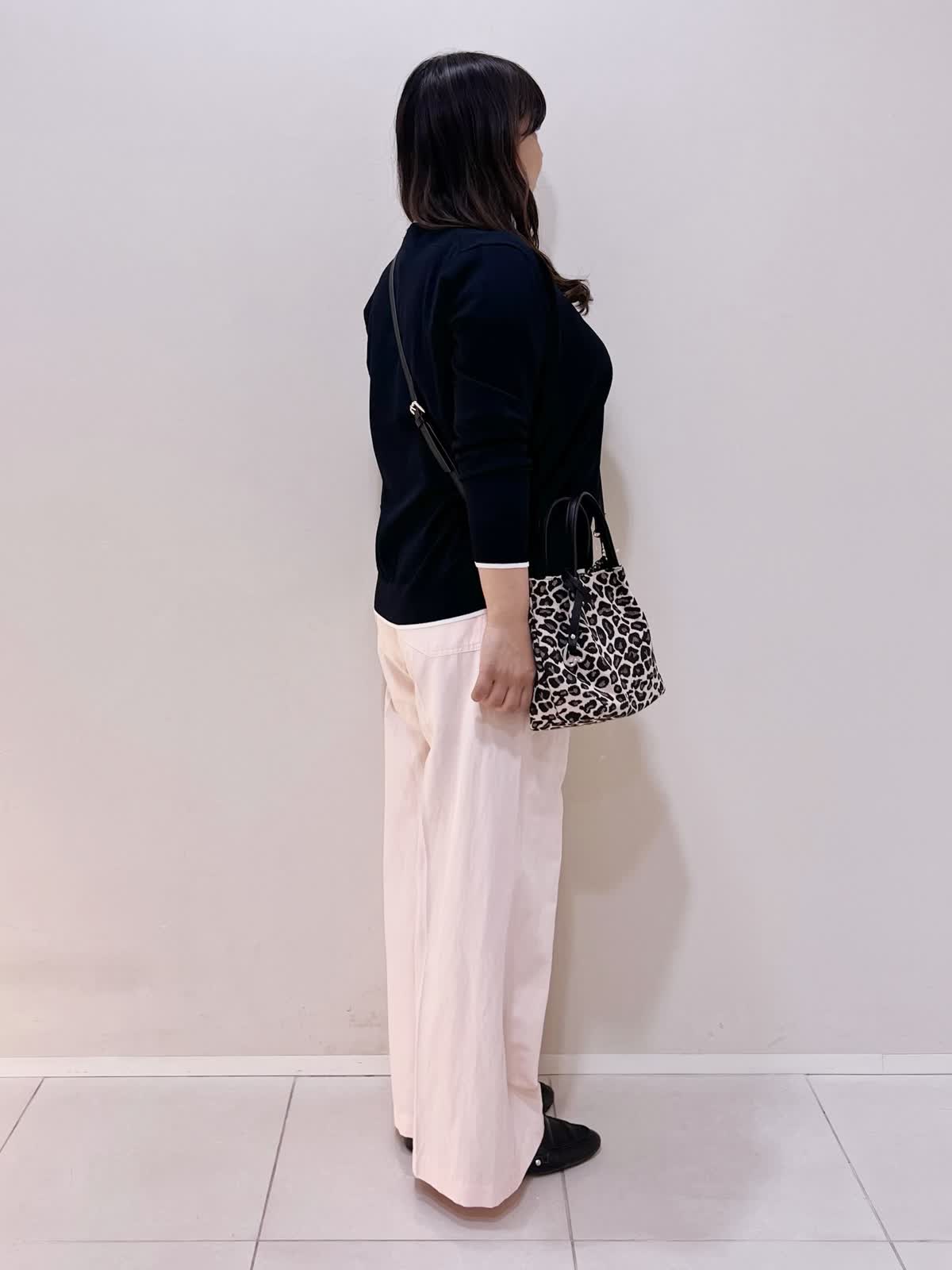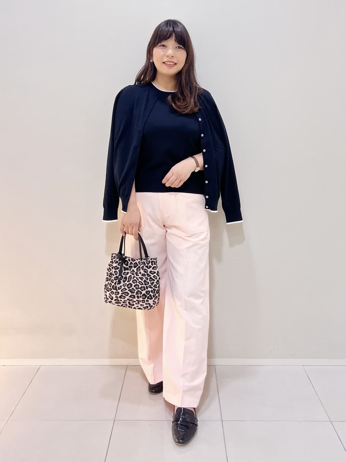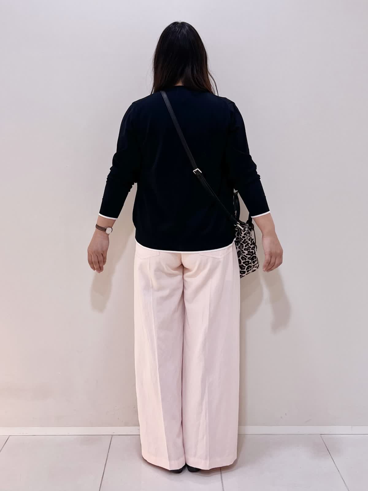 【着用サイズ】アンサンブル:11号 パンツ:9号 【着用カラー】アンサンブル:ネイビー パンツ:ピンク バッグ:ベージュ カジュアルお出掛けスタイル。 さらっとした着心地のアンサンブルは半袖インナーと長袖カーディガンでシーズン長く着用できます。ベーシックな型に裾と袖口に入った配色がポイント。UVカット機能付きで、半袖インナーは接触冷感なので夏までお勧めです。 カラーパンツと合わせて、カジュアルにお勧めのコーディネートです。