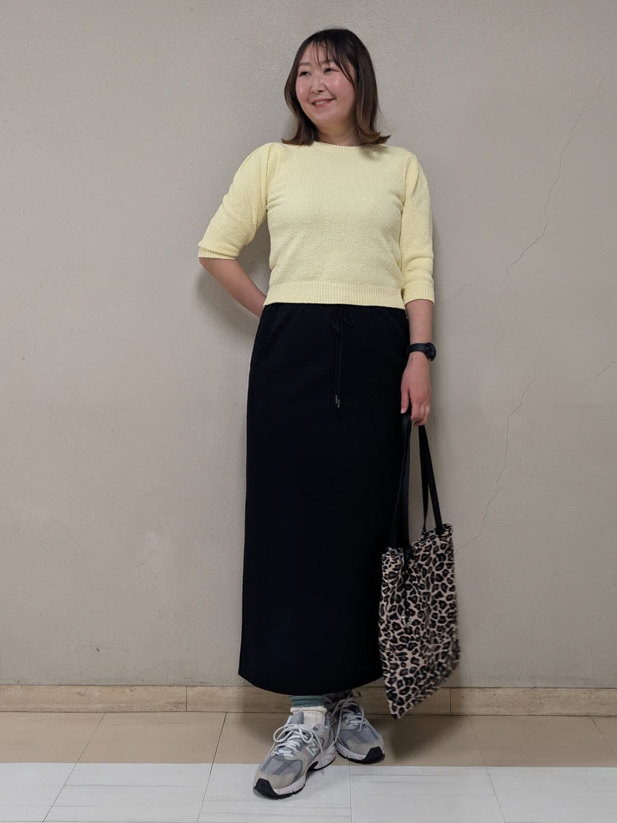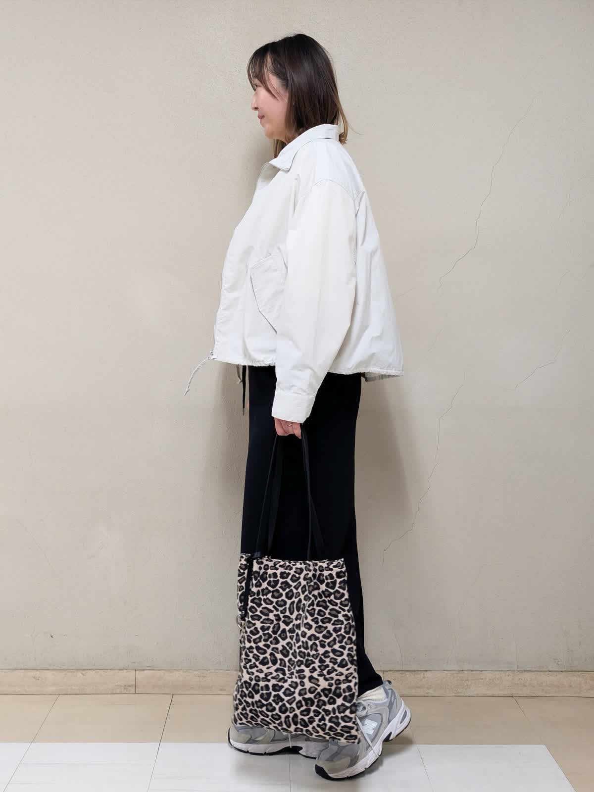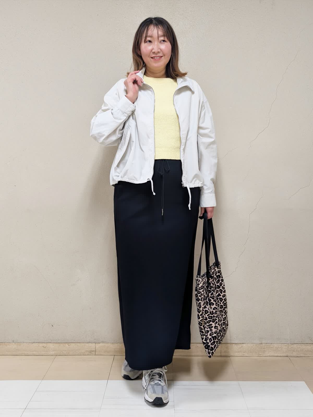 【着用サイズ】全て:フリー【着用カラー】ブルゾン:グレーベージュ ニット:イエロー スカート:ブラック 春のお出かけコーディネートです。ミモザのような柔らかイエローのニットを差し色に、きれいめカジュアルにまとめました。ブルゾンは短め丈で気軽に羽織れるデザイン。裾の絞りで広がり方を調節できるので、気分に合わせてシルエットを変えて着ていただけます。ニットはブークレの表面感のある生地で可愛いです。コンパクトな着丈なので、スカートやワイドパンツなど、ボリュームのあるボトムスとの相性が良いです。