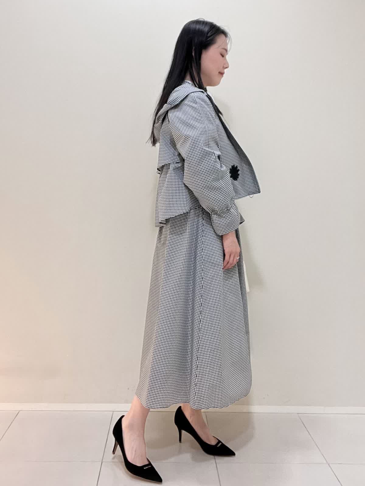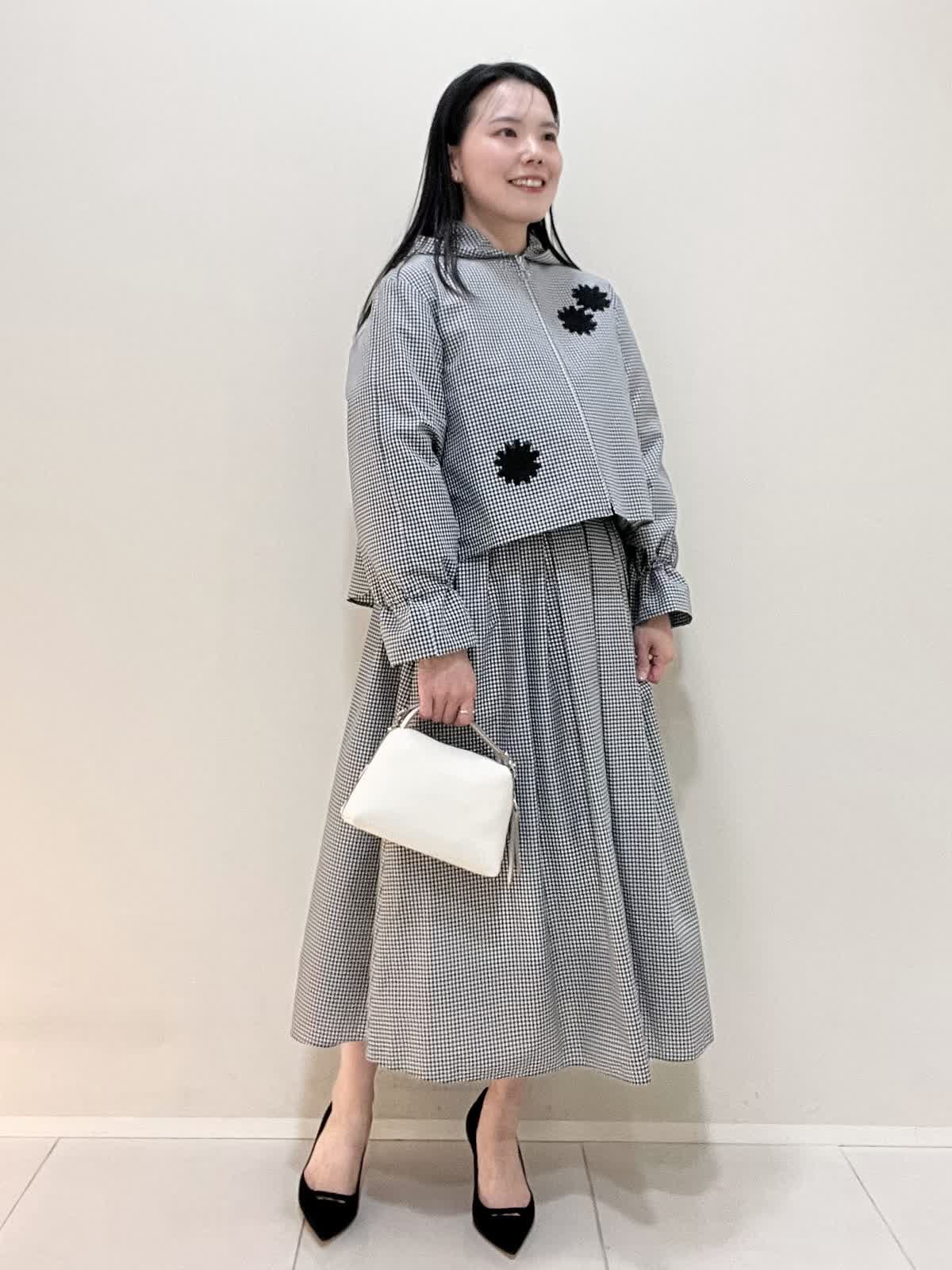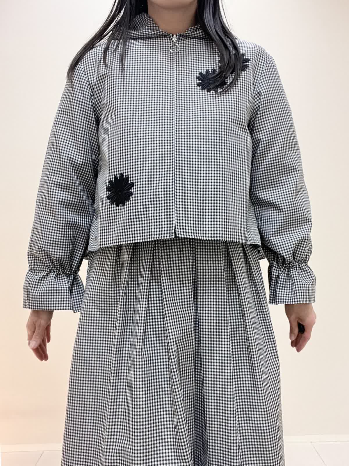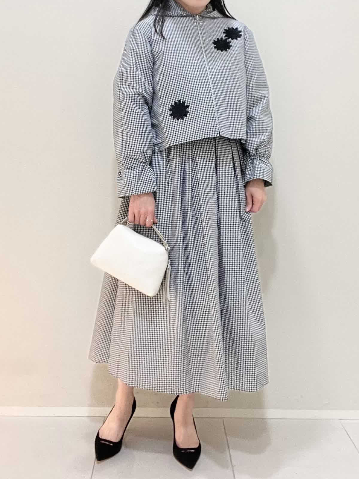 【着用サイズ/カラー】ブルゾン:9号 格子 ブラウス:9号 オフホワイト スカート:7号 格子 バッグ:オフホワイト ブルゾンは袖を絞ることができ、お好みでアレンジ可能です。フロントが短いので、ウエスト位置が高く見えます。スカートはなんといってもサイドのロゴテープがポイントに。今までに無い、新しいセットアップスタイルです。インナーのブラウスも、ボタンパールが可愛く、1枚でもサマになります。