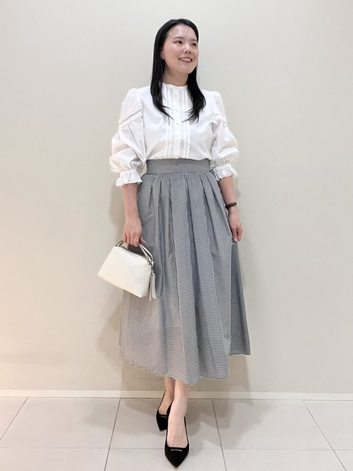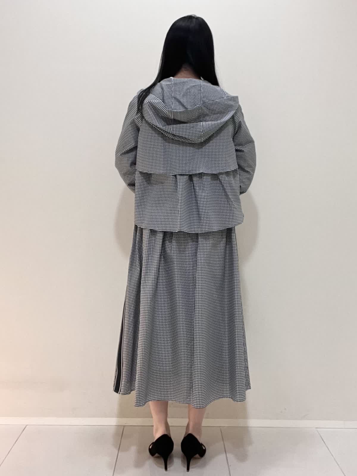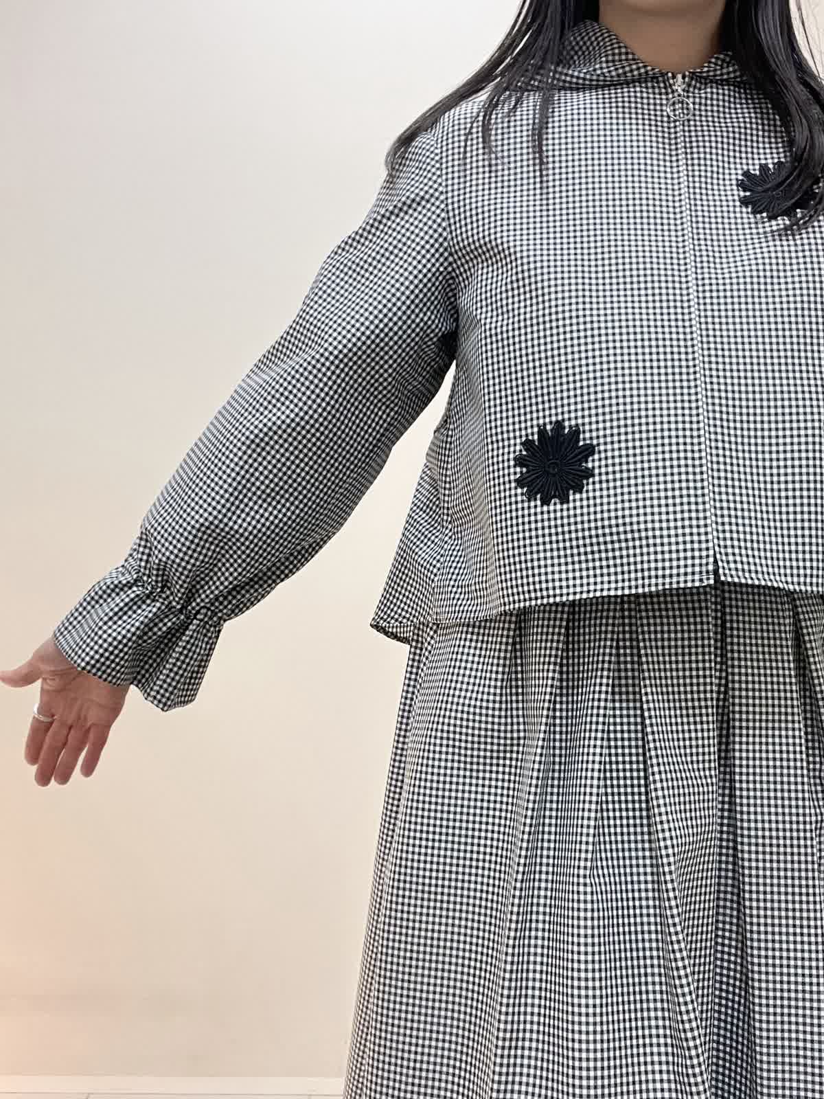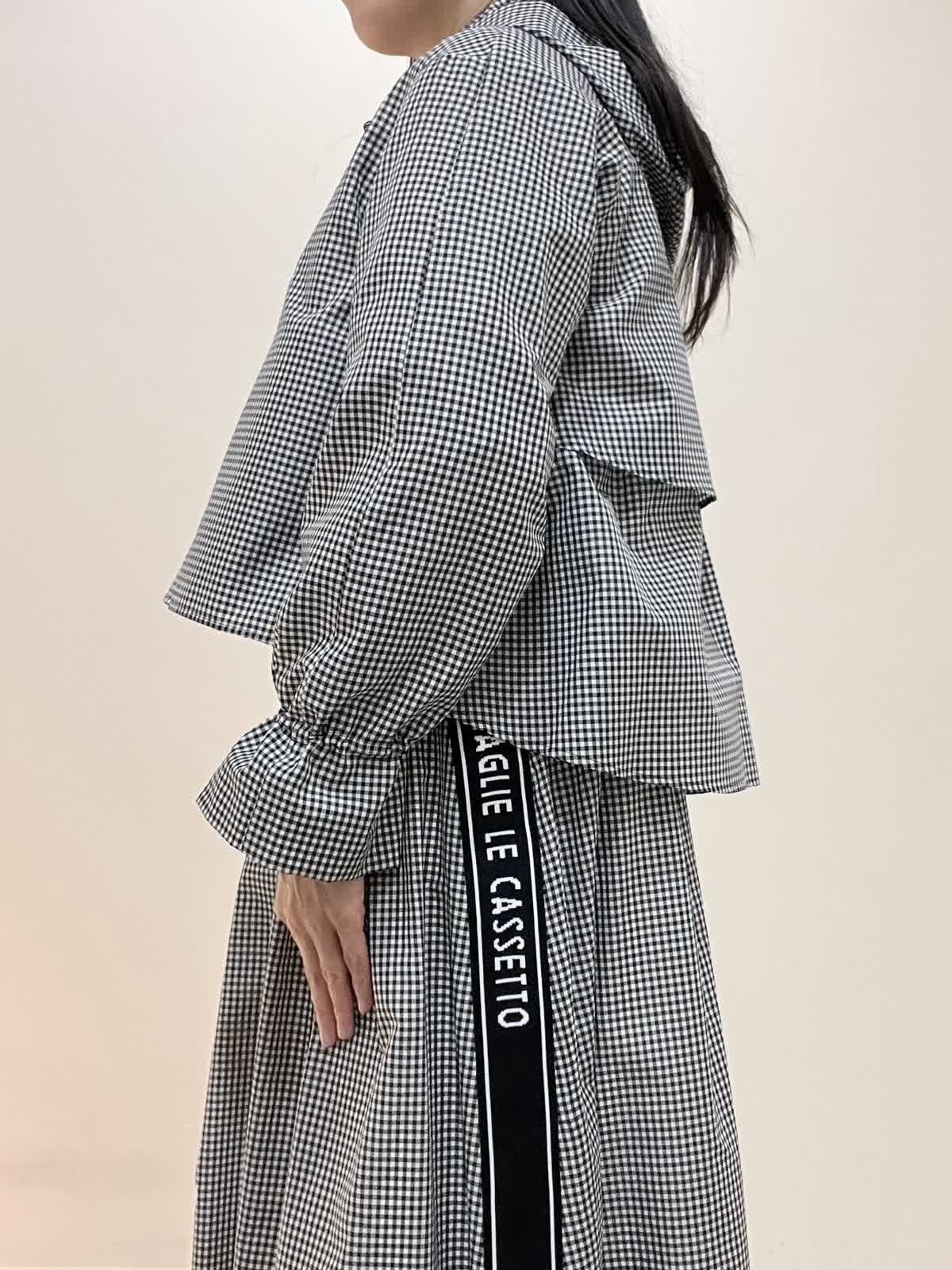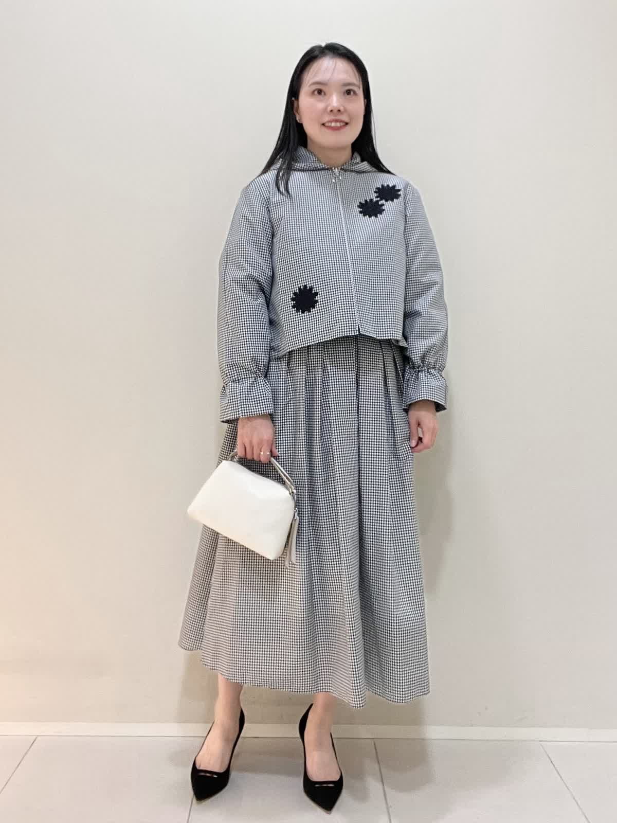 【着用サイズ/カラー】ブルゾン:9号 格子 ブラウス:9号 オフホワイト スカート:7号 格子 バッグ:オフホワイト ブルゾンは袖を絞ることができ、お好みでアレンジ可能です。フロントが短いので、ウエスト位置が高く見えます。スカートはなんといってもサイドのロゴテープがポイントに。今までに無い、新しいセットアップスタイルです。インナーのブラウスも、ボタンパールが可愛く、1枚でもサマになります。