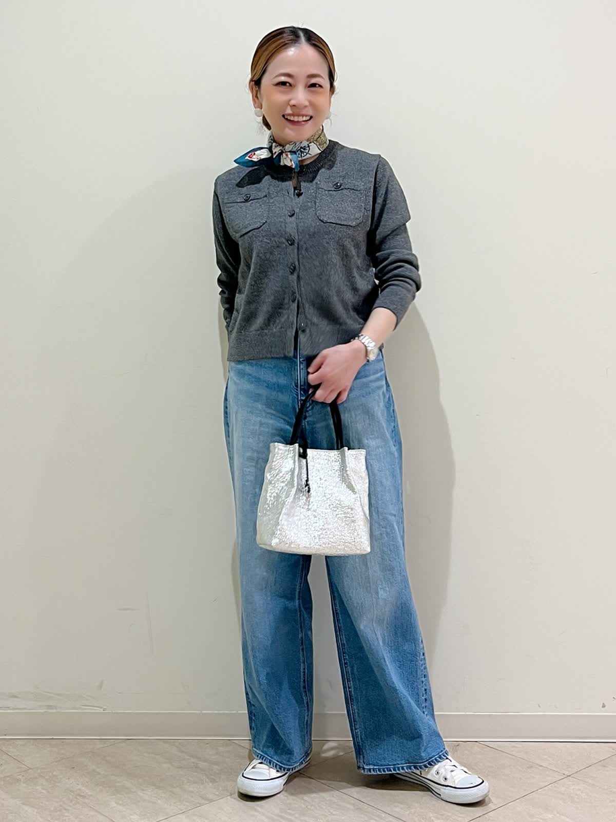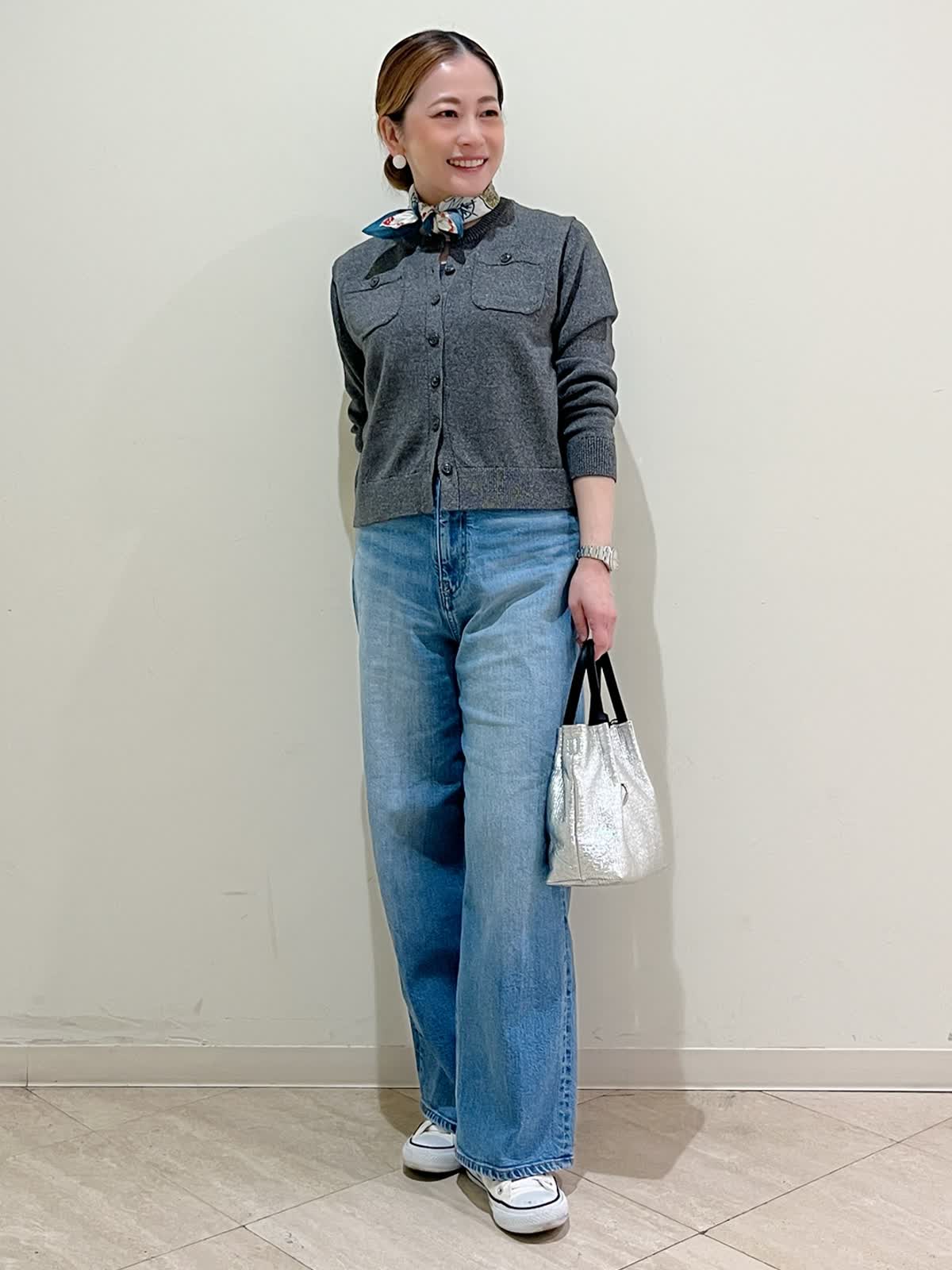 【着用サイズ】カーディガン:フリーサイズ パンツ:9号 【着用カラー】カーディガン:ミディアムグレー パンツ:ブルー 春のお出かけにぴったりな大人カジュアルコーディネートです。 コンパクトなグレーカーディガンに ワイドシルエットのデニムを合わせて程よくリラックス感のあるスタイリングにしていました。首元のスカーフがシンプルなコーデのアクセントになっています。