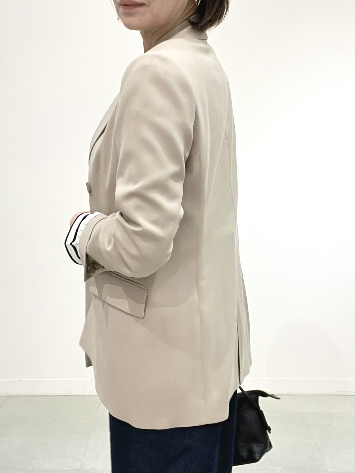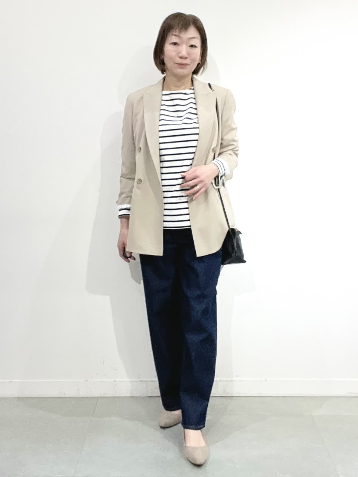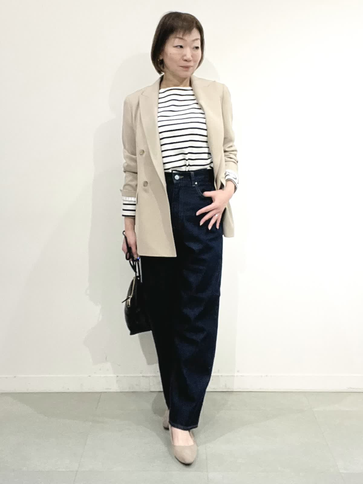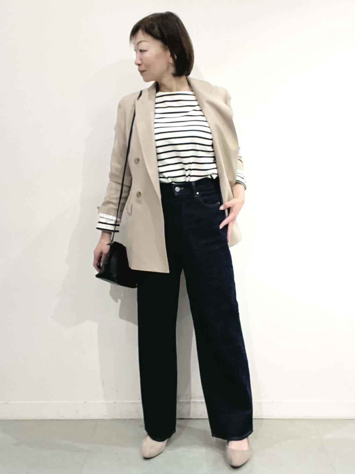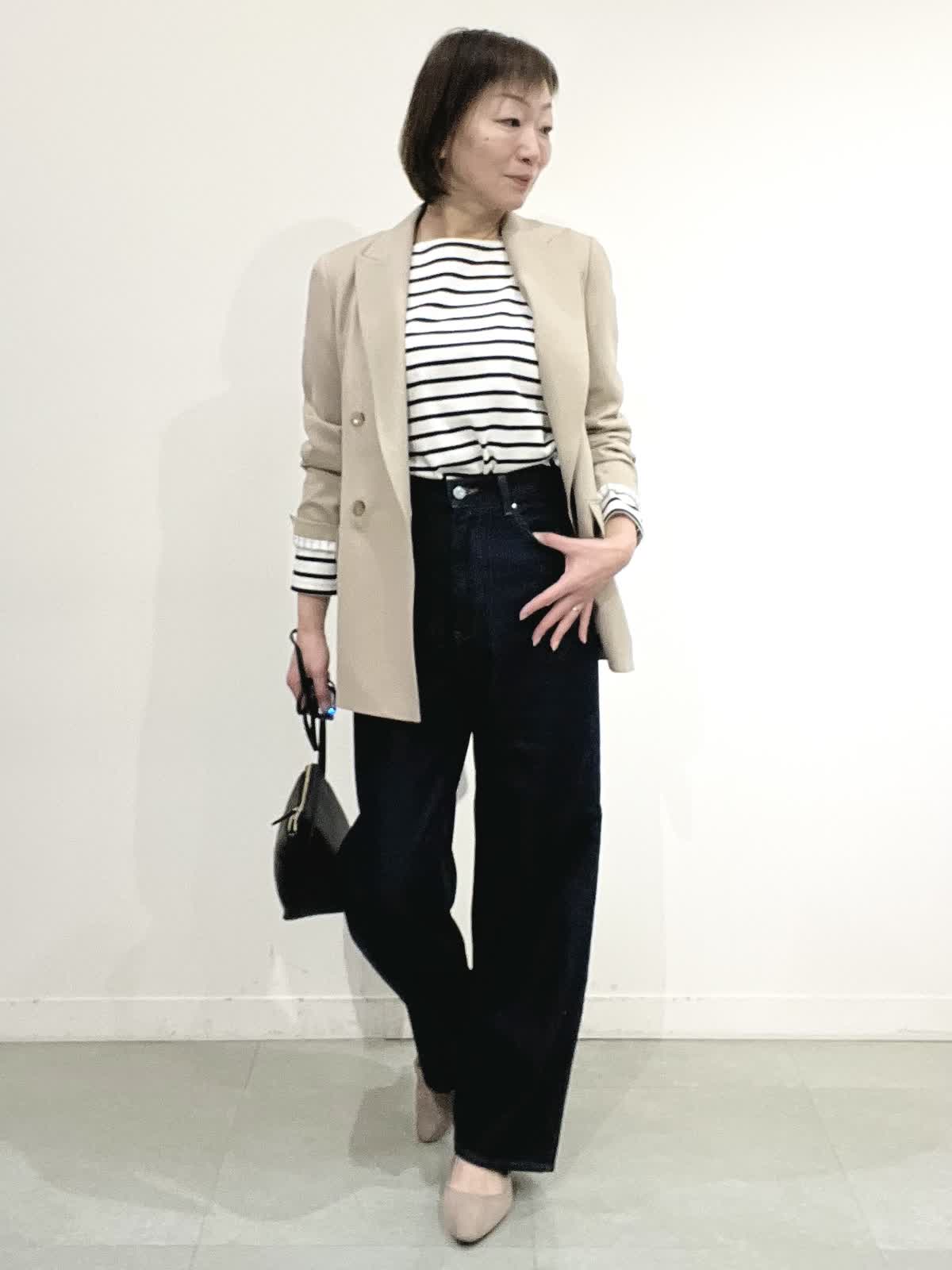 【着用サイズ】全て09 ダブルジャケットを使ったカジュアルコーディネート。春の大人カジュアルに柔らかな色合いのダブルジャケットを合わせています。 ジャケットはお袖を折り返すとストライプ柄が見え、垢抜けた印象に。 ストレートのデニム合わせですっきりとしたラインになります。