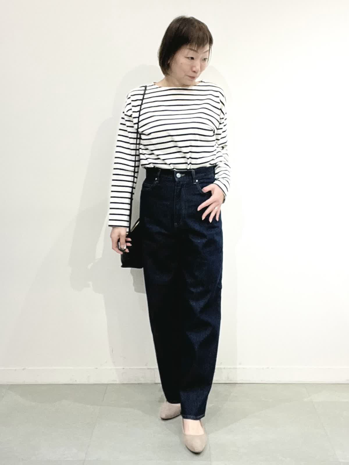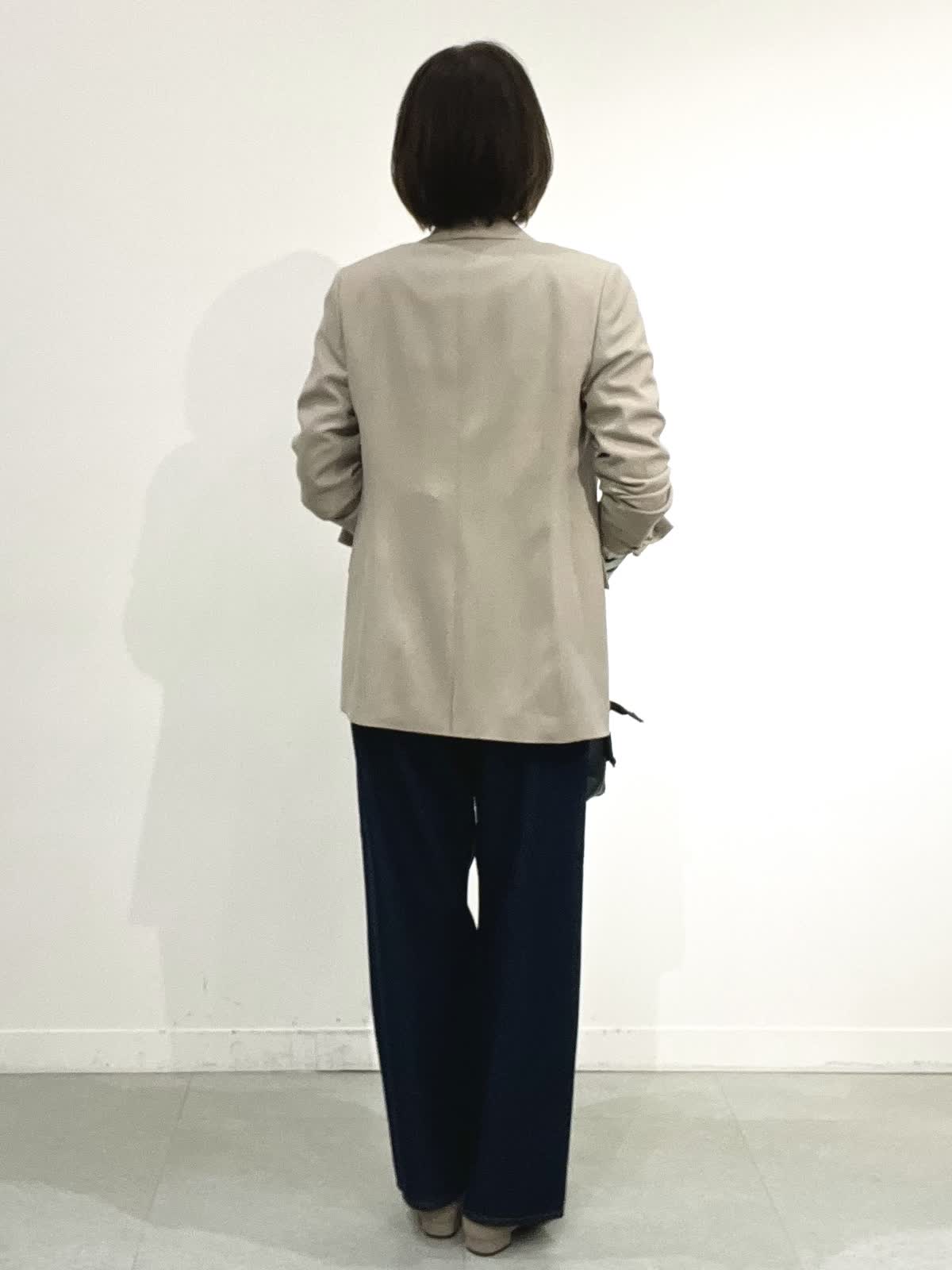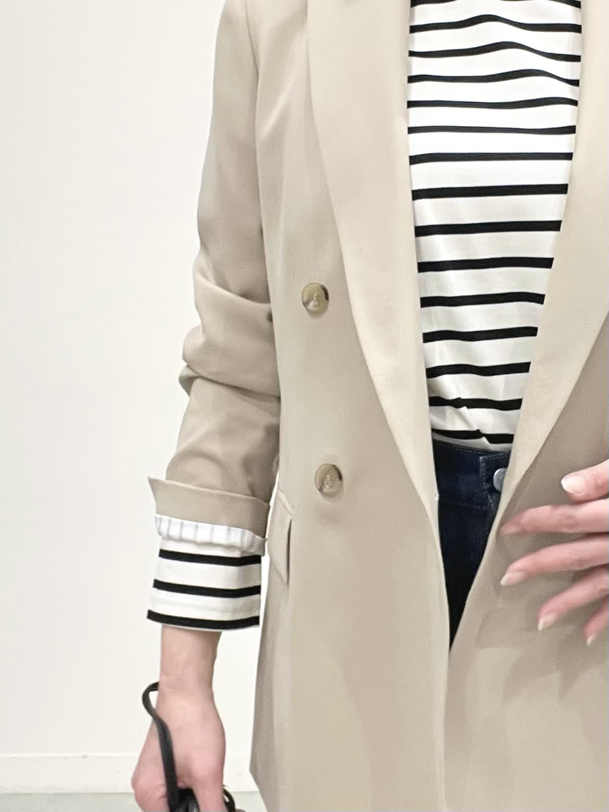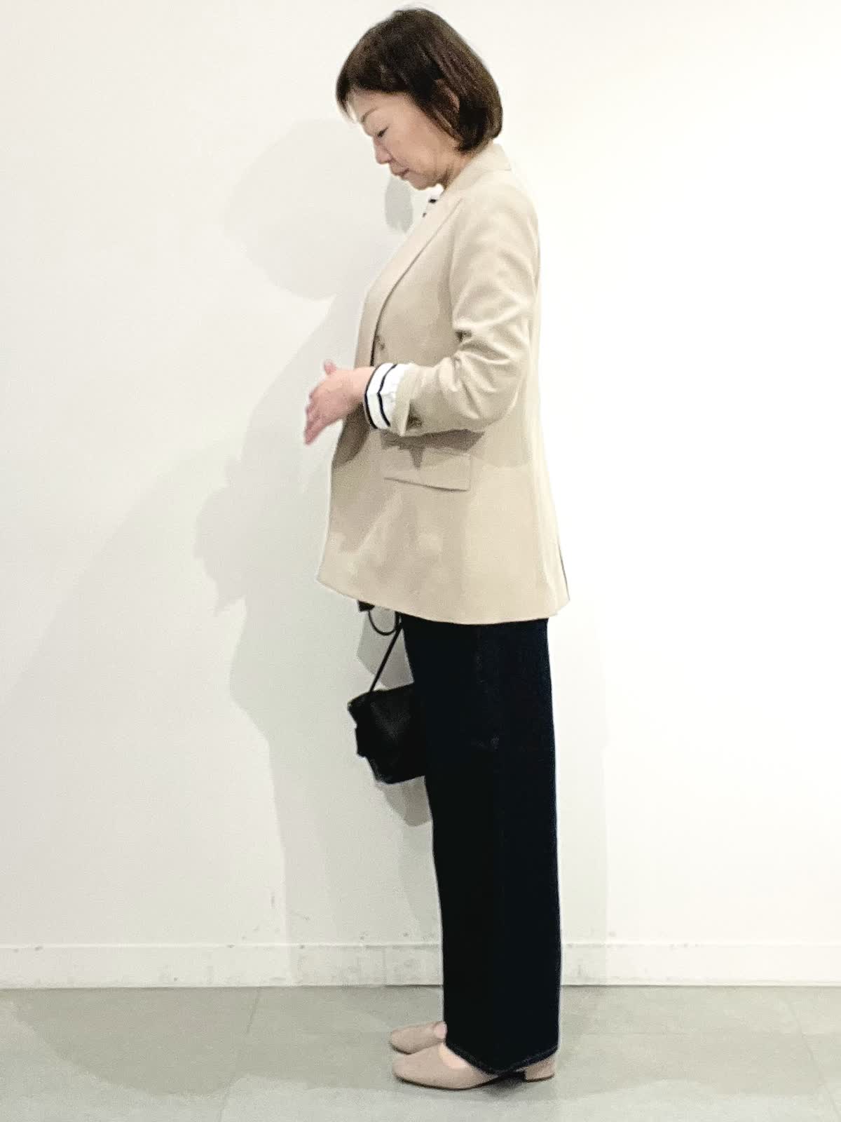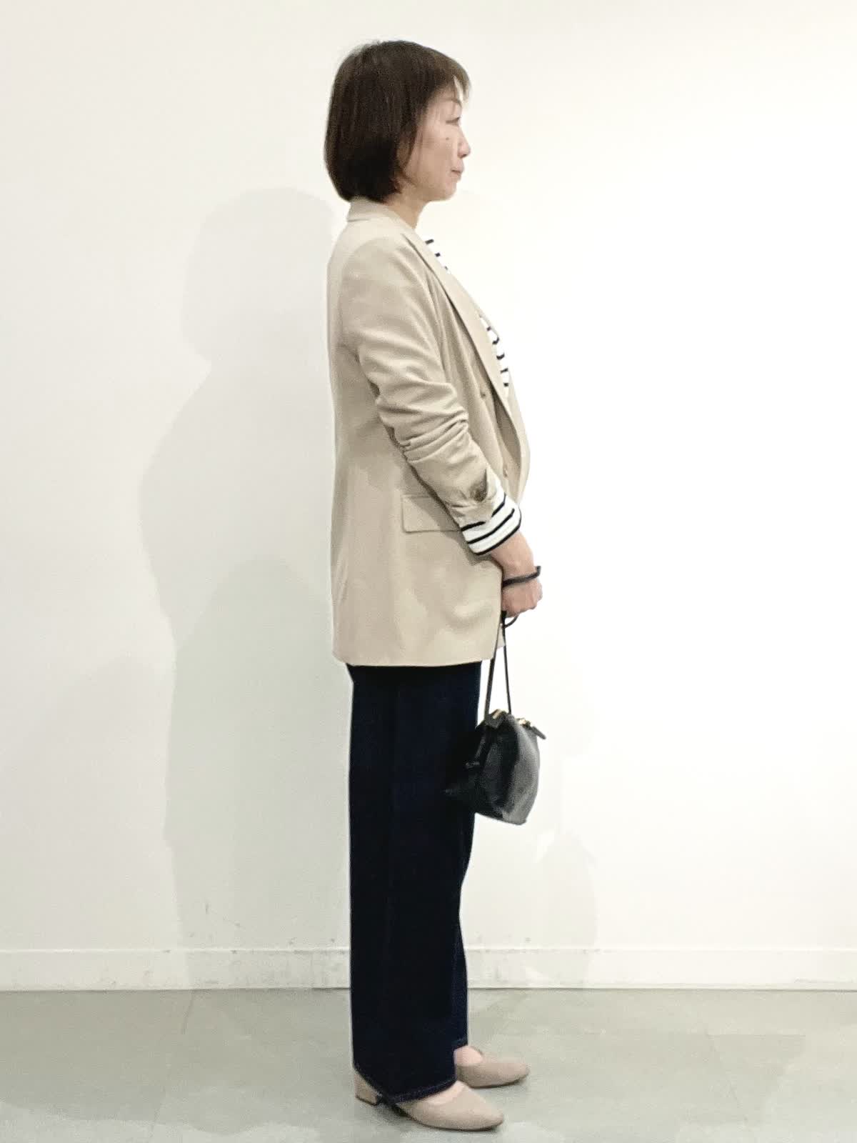 【着用サイズ】全て09 ダブルジャケットを使ったカジュアルコーディネート。春の大人カジュアルに柔らかな色合いのダブルジャケットを合わせています。 ジャケットはお袖を折り返すとストライプ柄が見え、垢抜けた印象に。 ストレートのデニム合わせですっきりとしたラインになります。