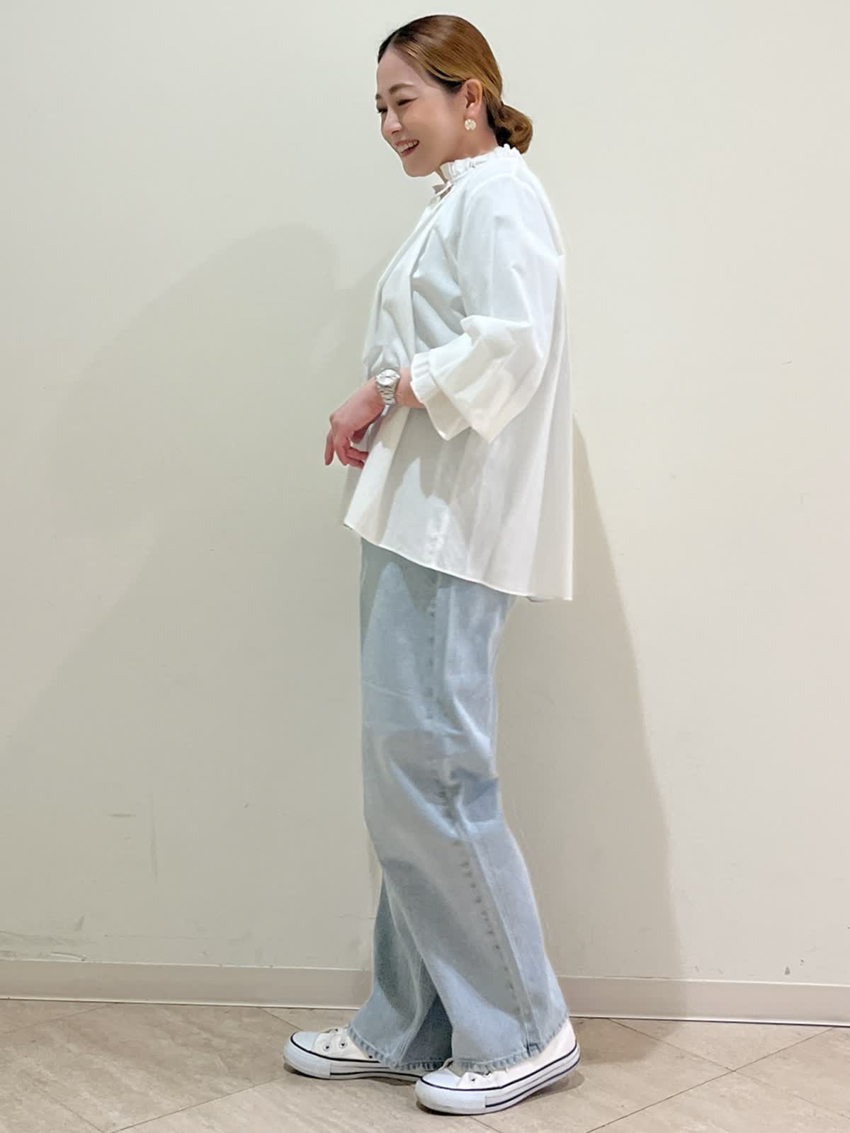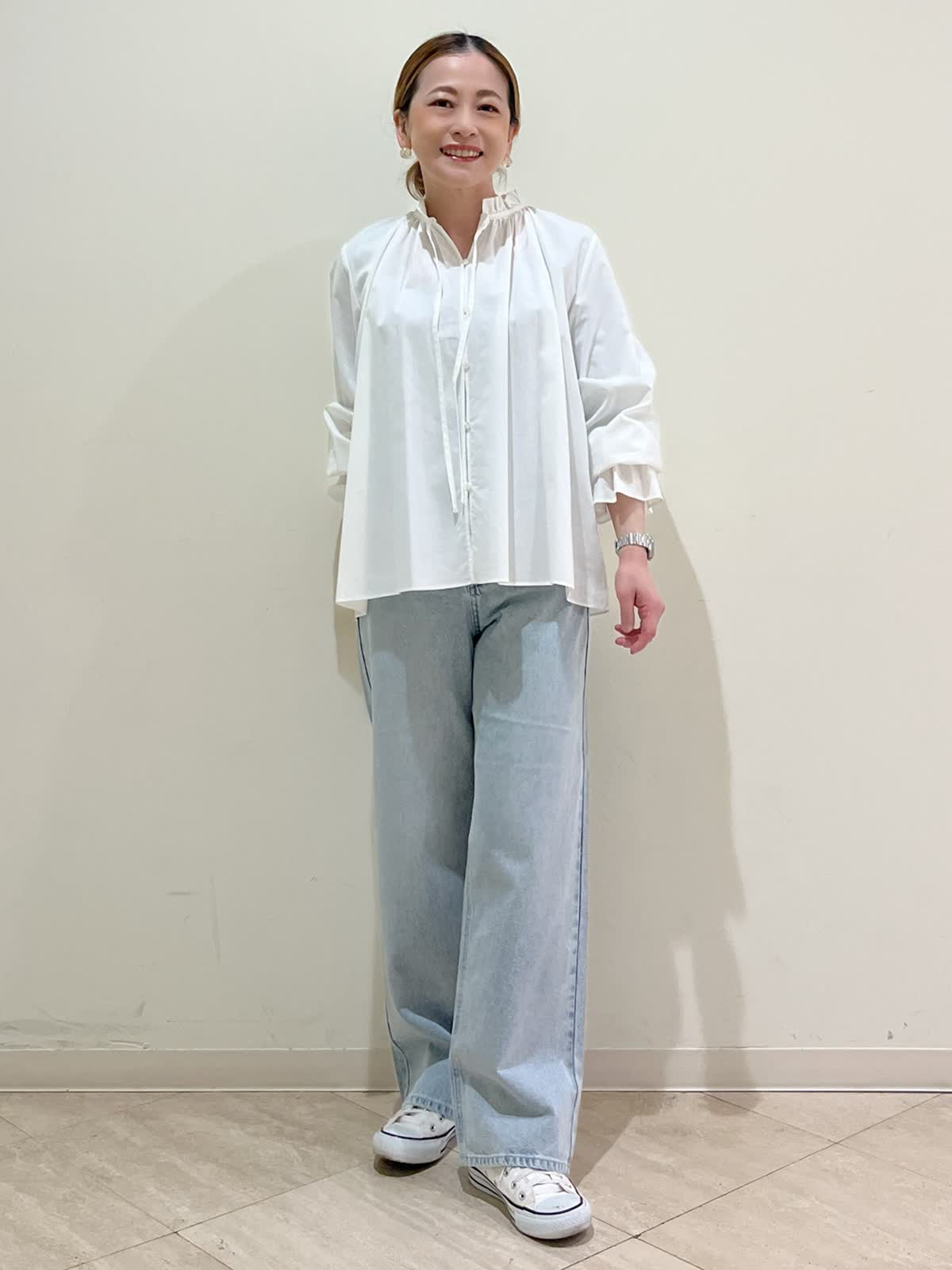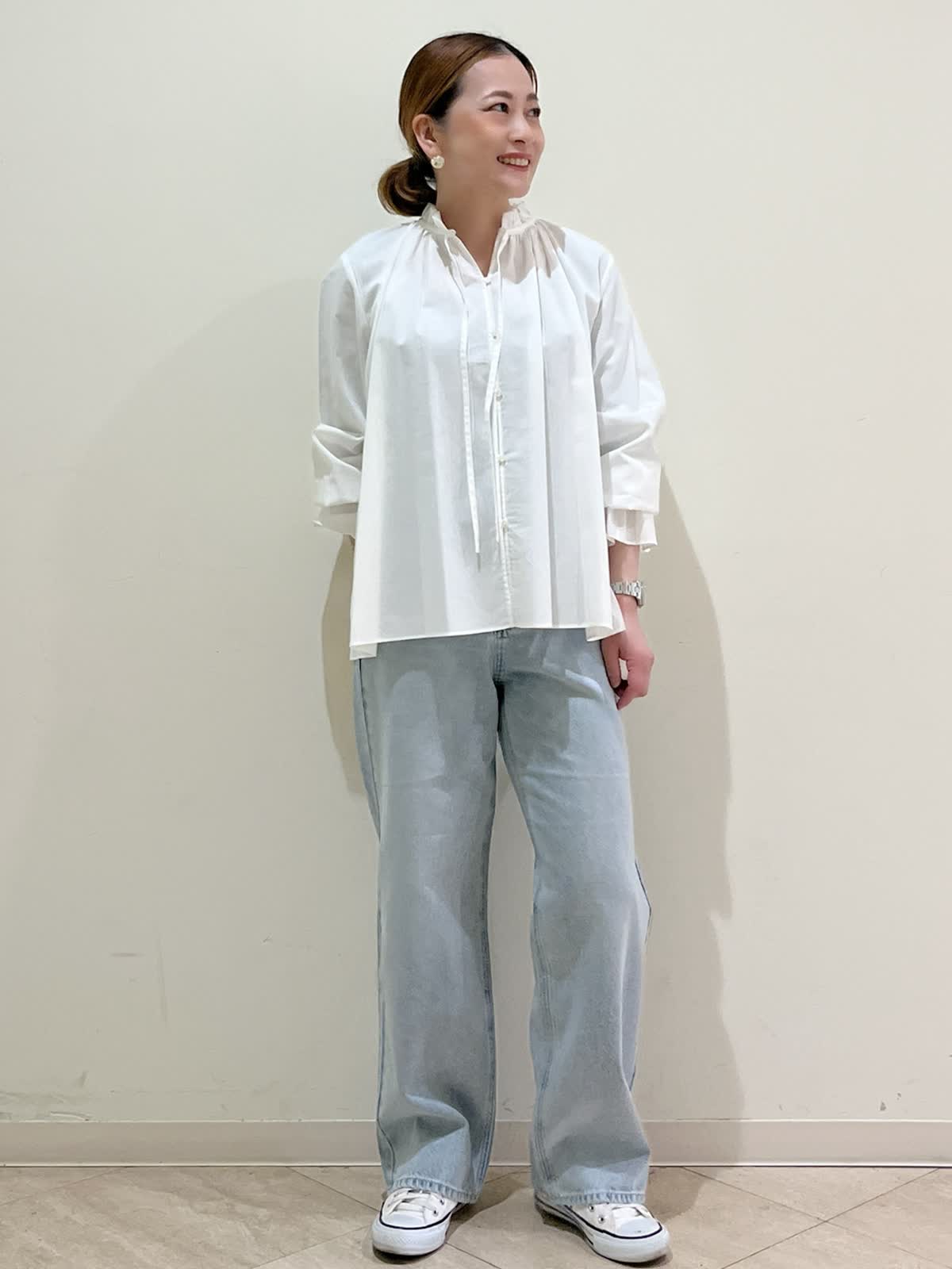【着用サイズ】ブラウス:フリーサイズ パンツ:9号 【着用カラー】ブラウス:オフホワイト パンツ:サックス 春のお出かけコーディネートです。お出かけにもデイリーにも使える大人の白ブラウスです。ゆったりしたシルエットで さっと着るだけでこなれた印象になります。デニム合わせできれいめカジュアルコーデが完成します。