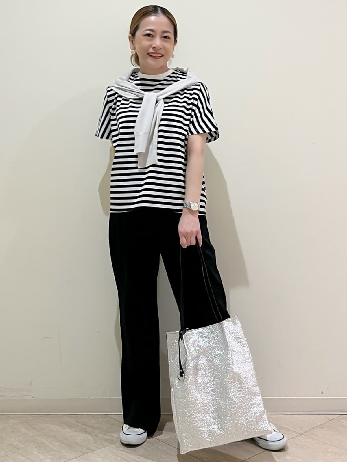 【着用サイズ】カットソー:フリーサイズ カーディガン:9号 パンツ:9号 【着用カラー】カットソー:ボーダー カーディガン:グレー パンツ:ブラック 休日のお出かけスタイリングです。ボーダーのカットソーはゆるっと抜け感を出して着れます。ポイントでシアーカーディガンを肩掛けにしてみました。表面に立体感のあるジャガードのパンツを合わせています。リラックス感のある大人のカジュアルコーディネートです。