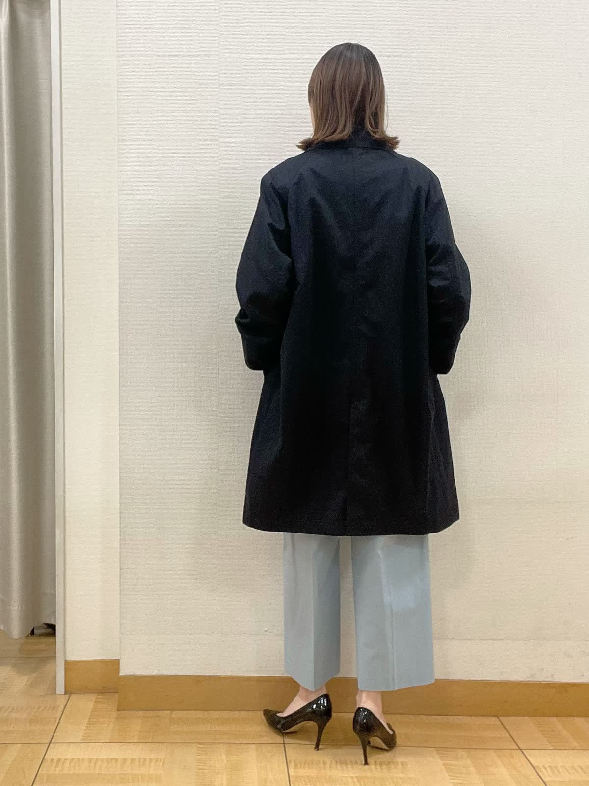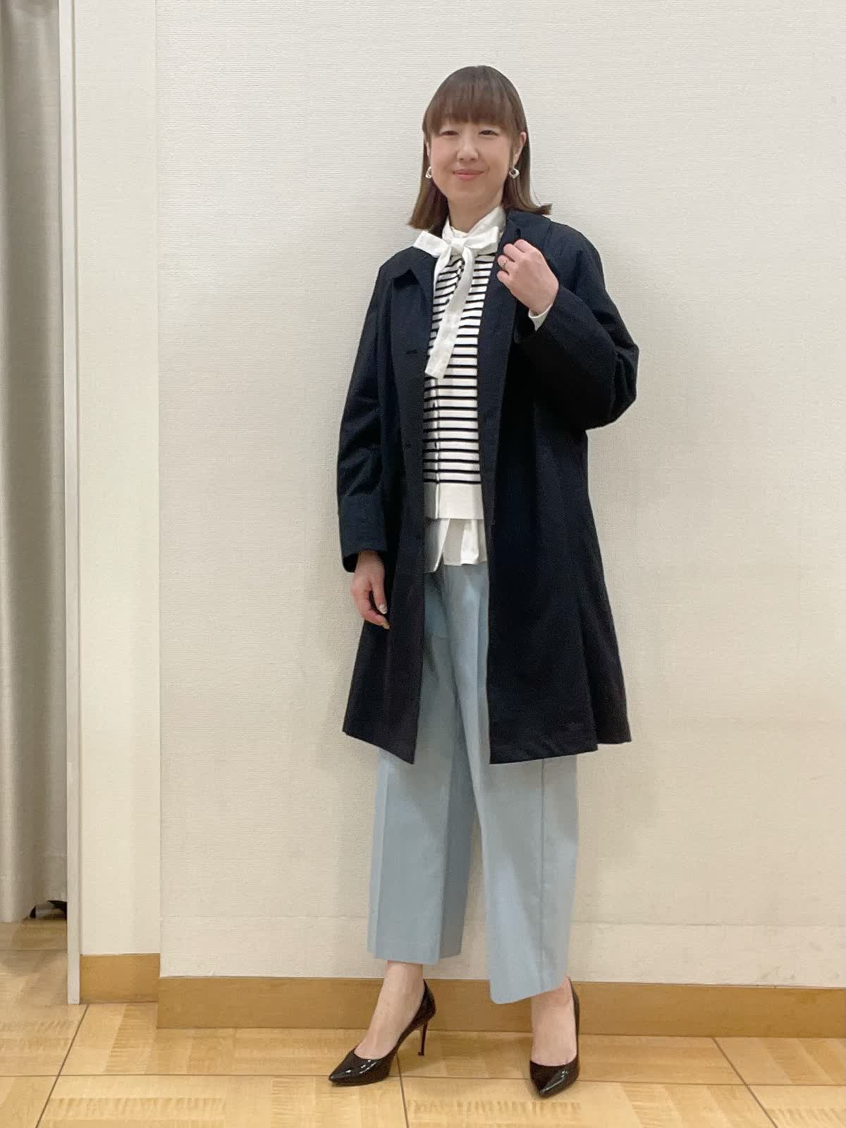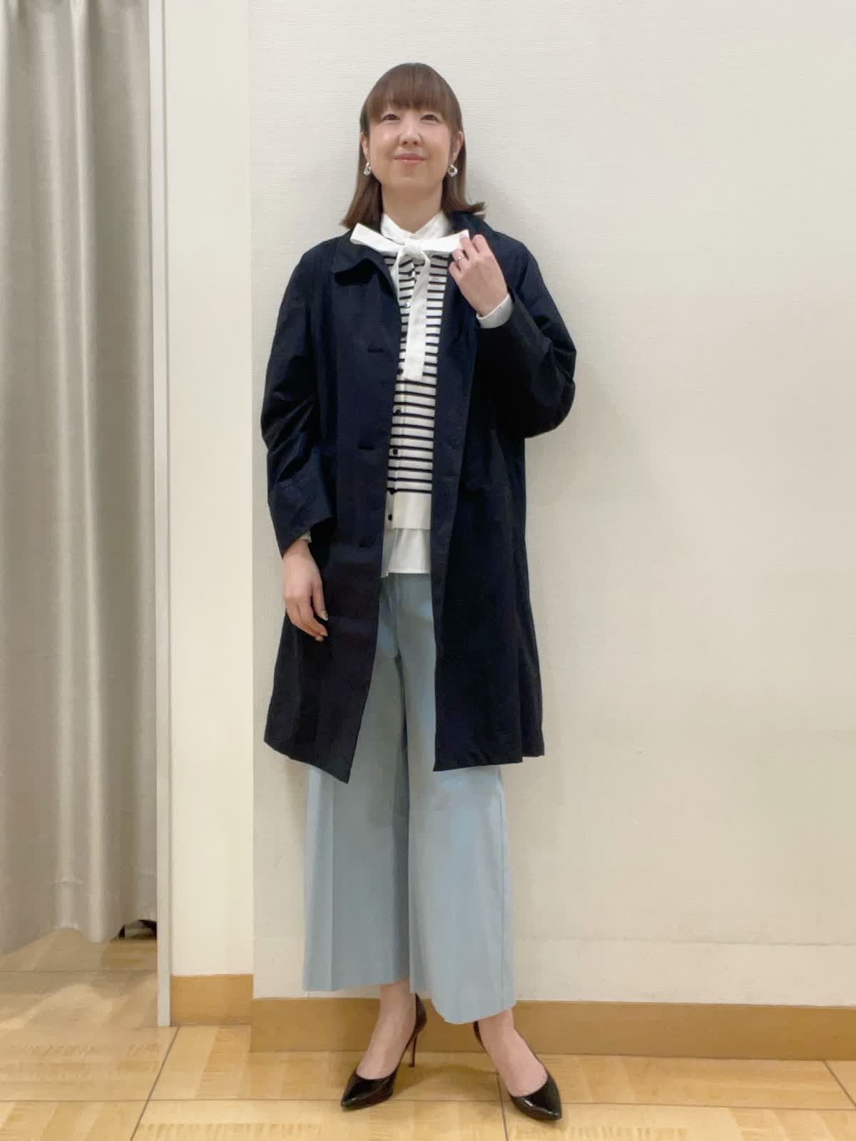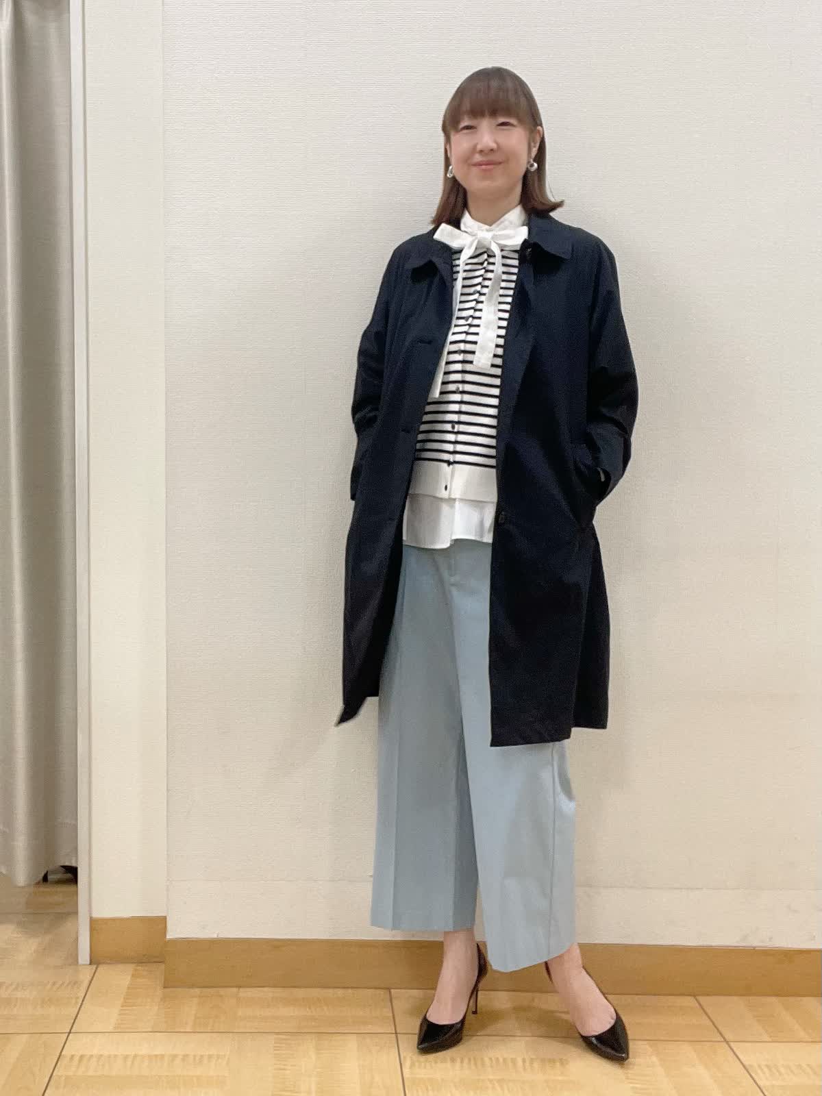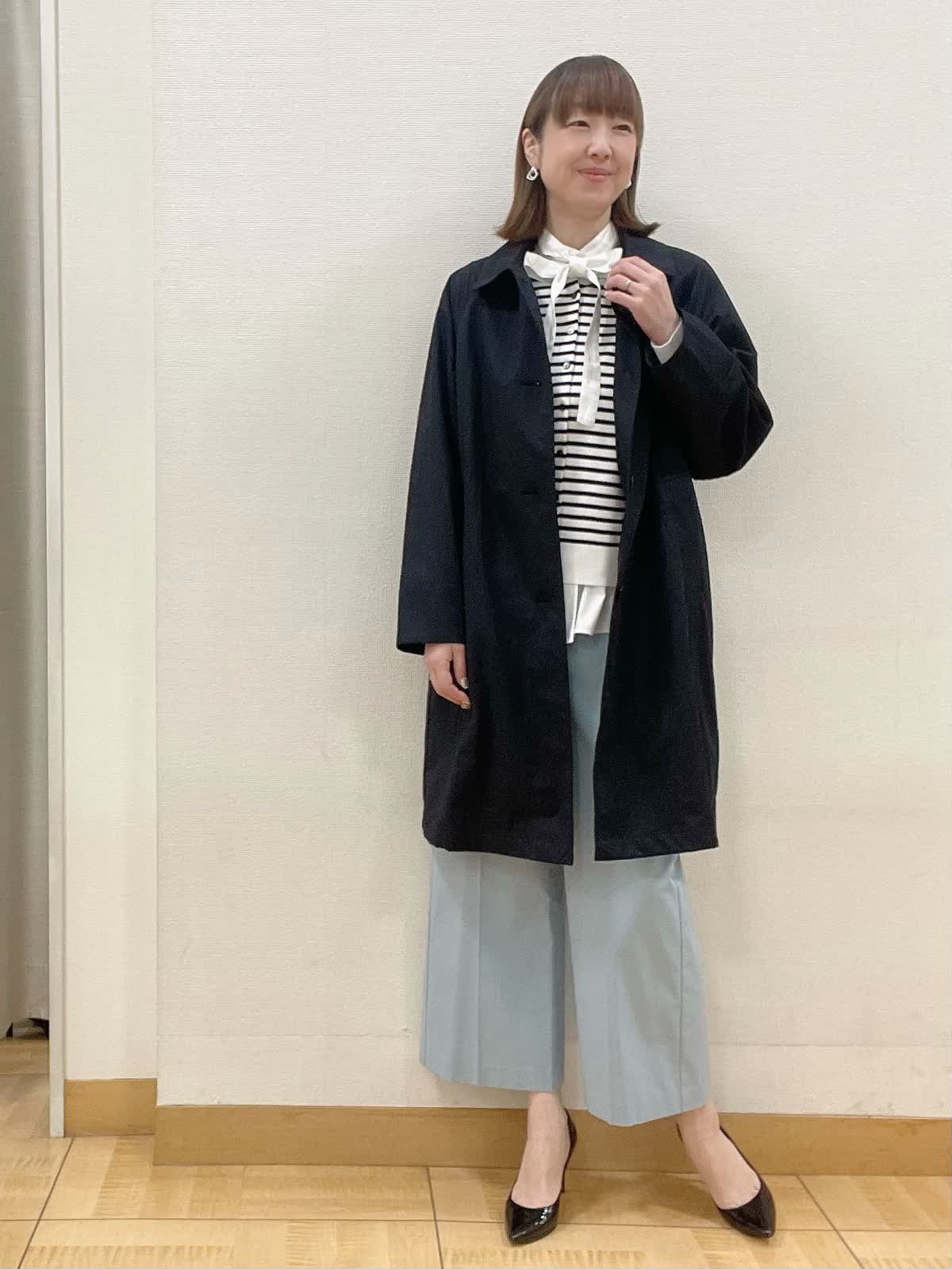 【着用サイズ】コート、シャツ共にフリー アンサンブル、パンツ共に9号 【着用カラー】コート:ブラック シャツ、アンサンブル共にオフホワイトボーダー パンツ:ブルー サッと羽織れるステンカラーコート。ワイドクロップドパンツにも相性が良い丈で万能です。今年トレンドのボウタイシャツできりりとお出かけスタイルに。
