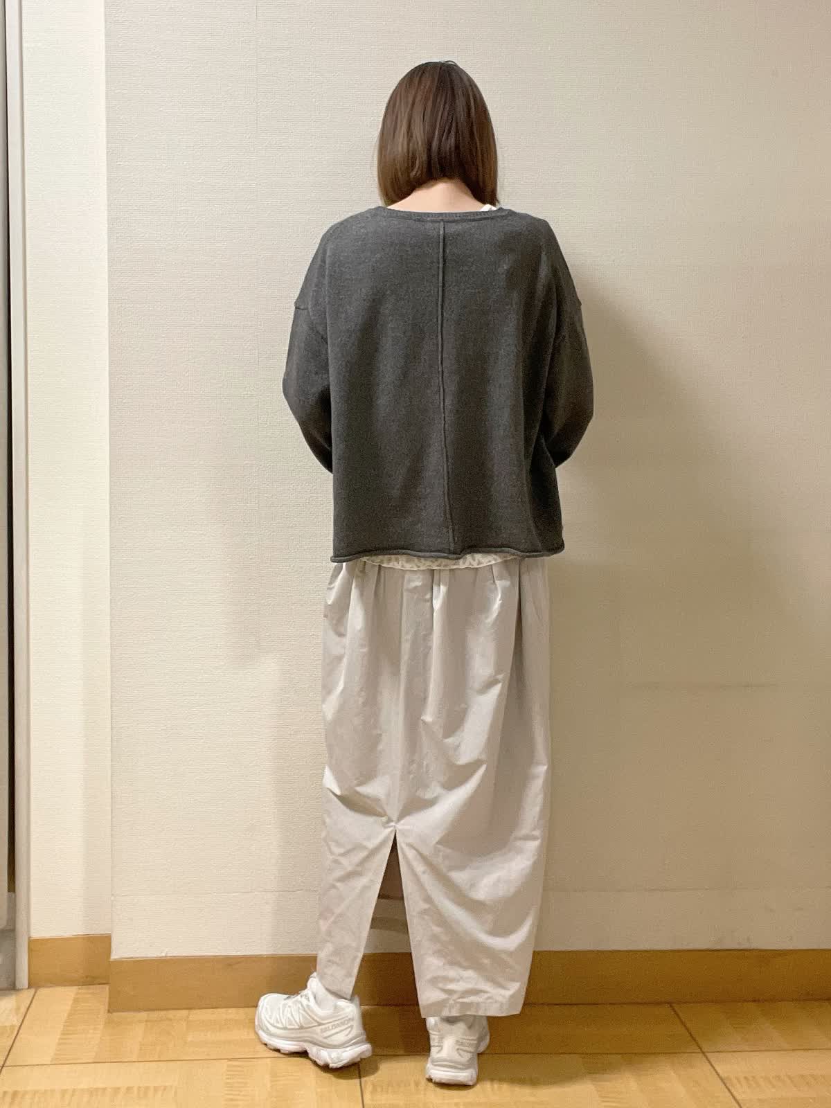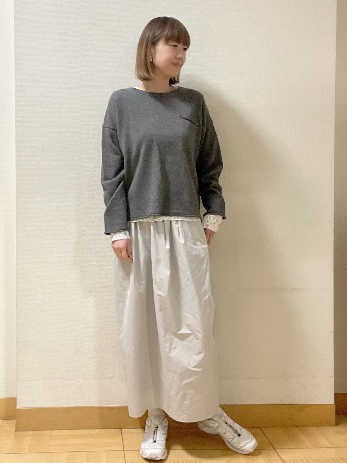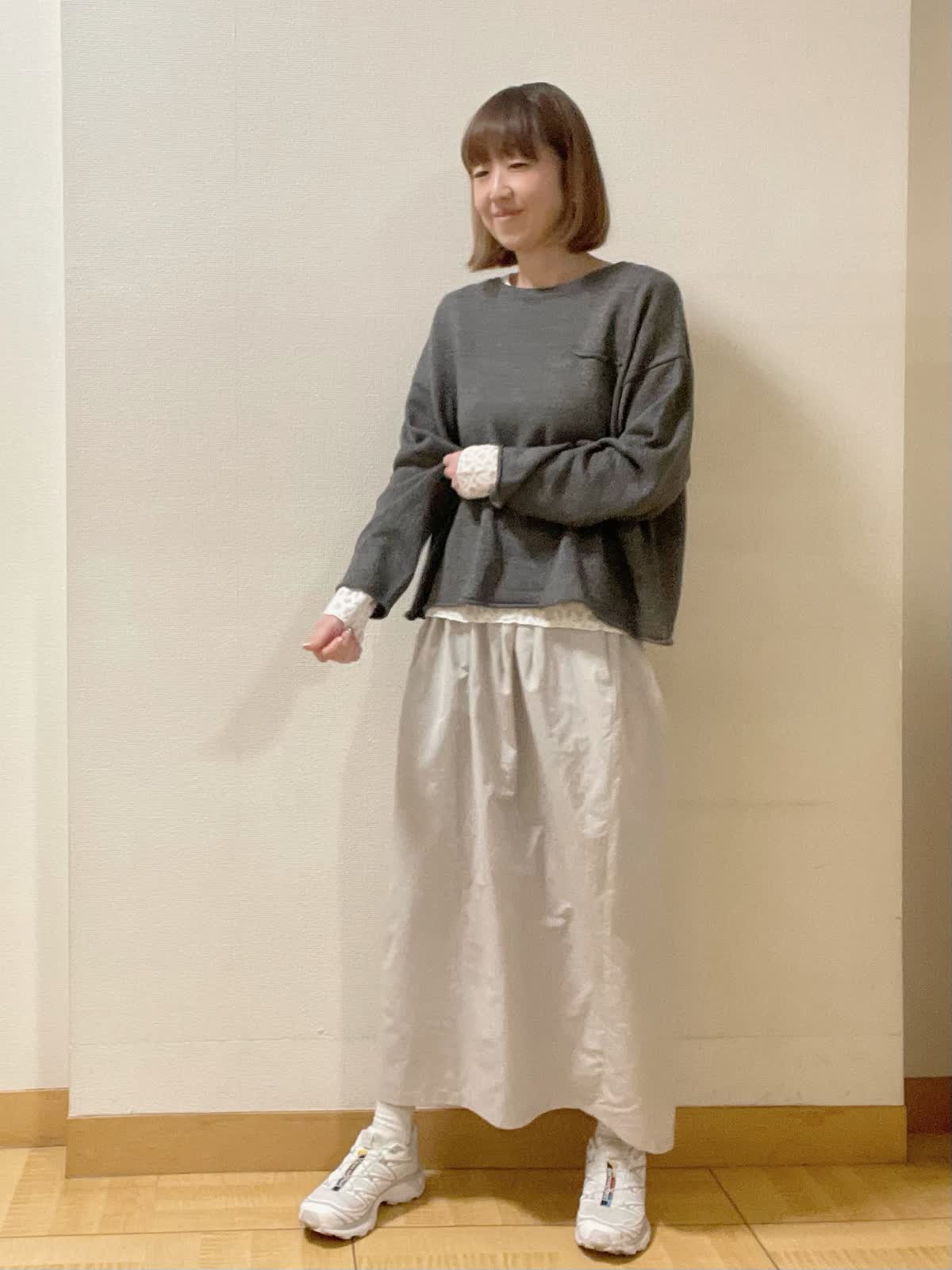 【着用サイズ】ニット:フリー カットソー、スカート共に9号【着用カラー】ニット:ミディアムグレー カットソー:アイボリー スカート:グレー オーバーサイズでラフに着られるニット。レースのカットソーをレイヤードして休日スタイルに。足元はスニーカーがおすすめ!
