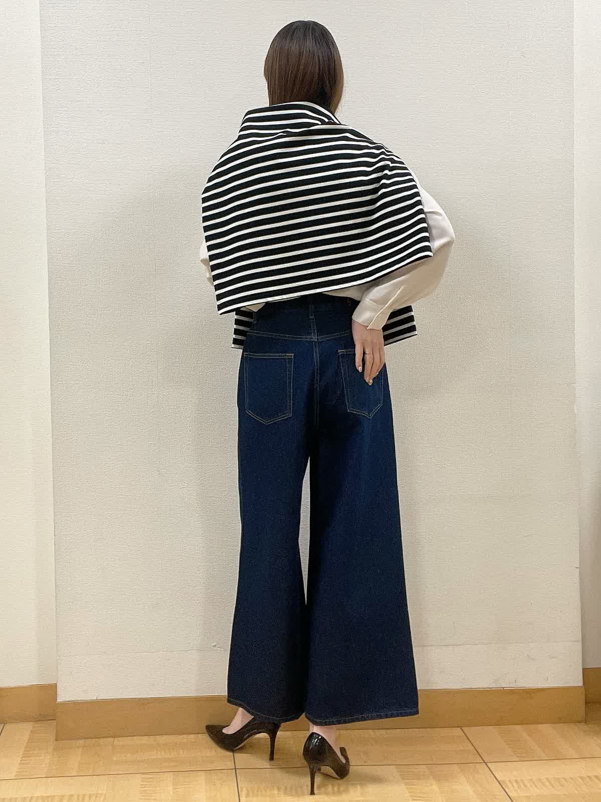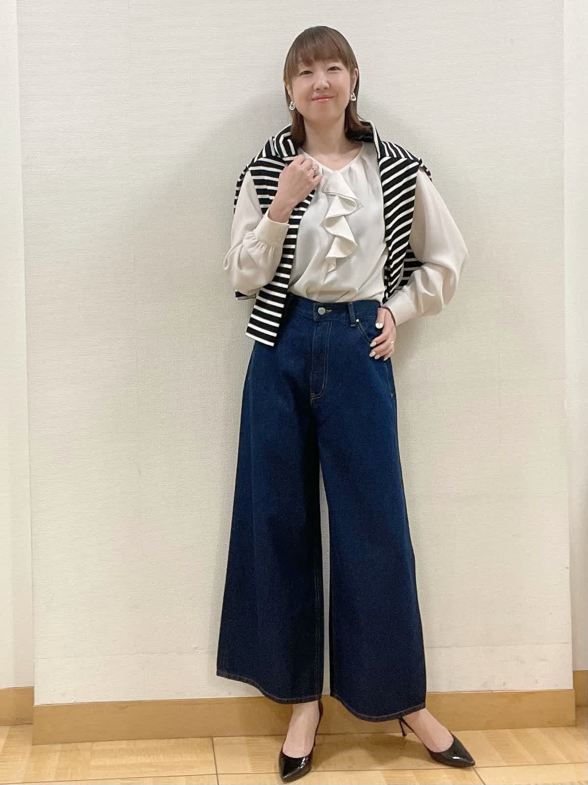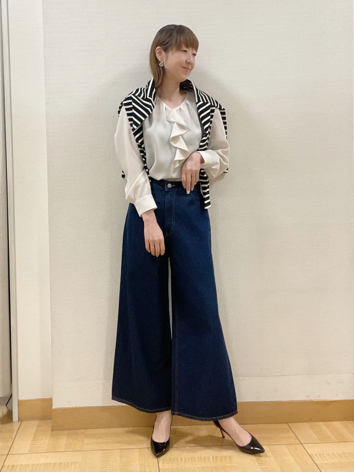 【着用サイズ】ブラウス、 パンツ共に9号 カットソー:フリー【着用カラー】ブラウス:アイボリー カットソー:ブラック パンツ:インディゴ 女性らしいデザインが可愛らしいブラウス。胸元のフリルが女性らしさをプラス。デニムにインして綺麗めカジュアルスタイルに。