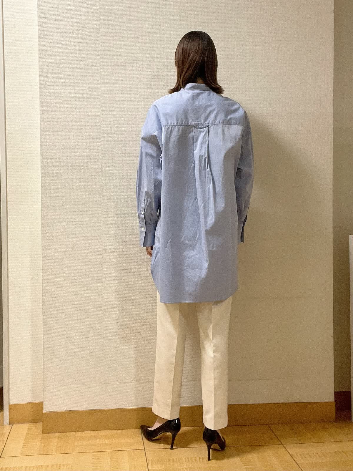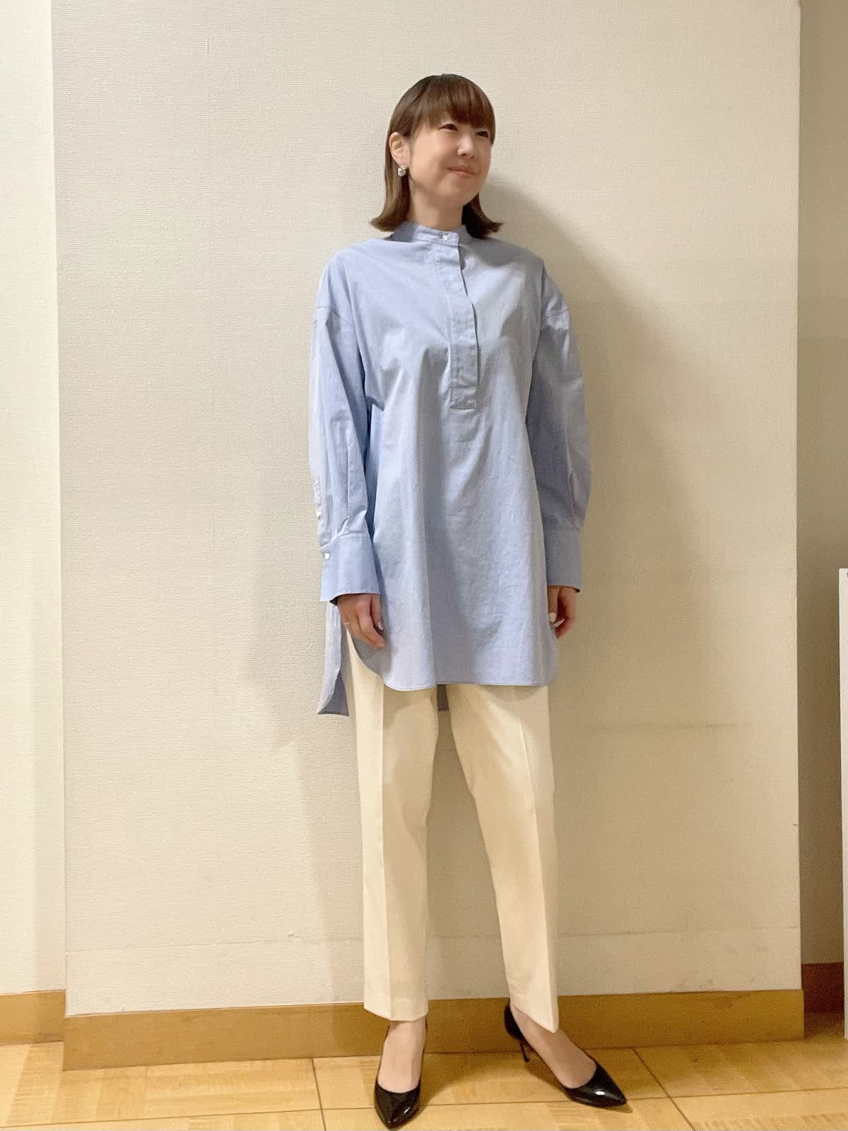 【着用サイズ】シャツ:フリー パンツ:9号 【着用カラー】シャツ:ブルー パンツ:オフホワイト 1枚でスタイルが決まるロングシャツ。スタンドカラーで首元もスッキリ。テーパードパンツにヒール合わせでオフィススタイルに。