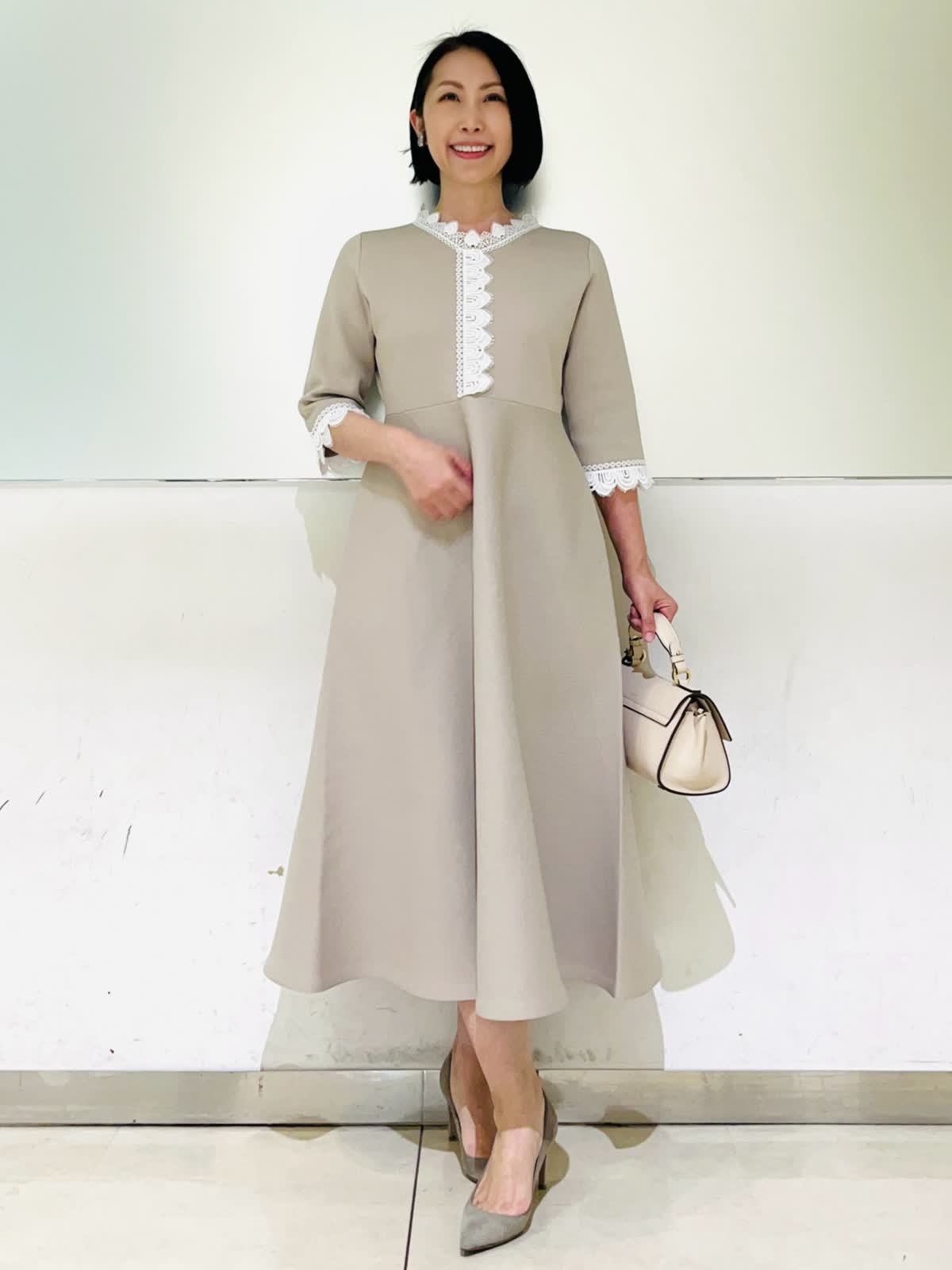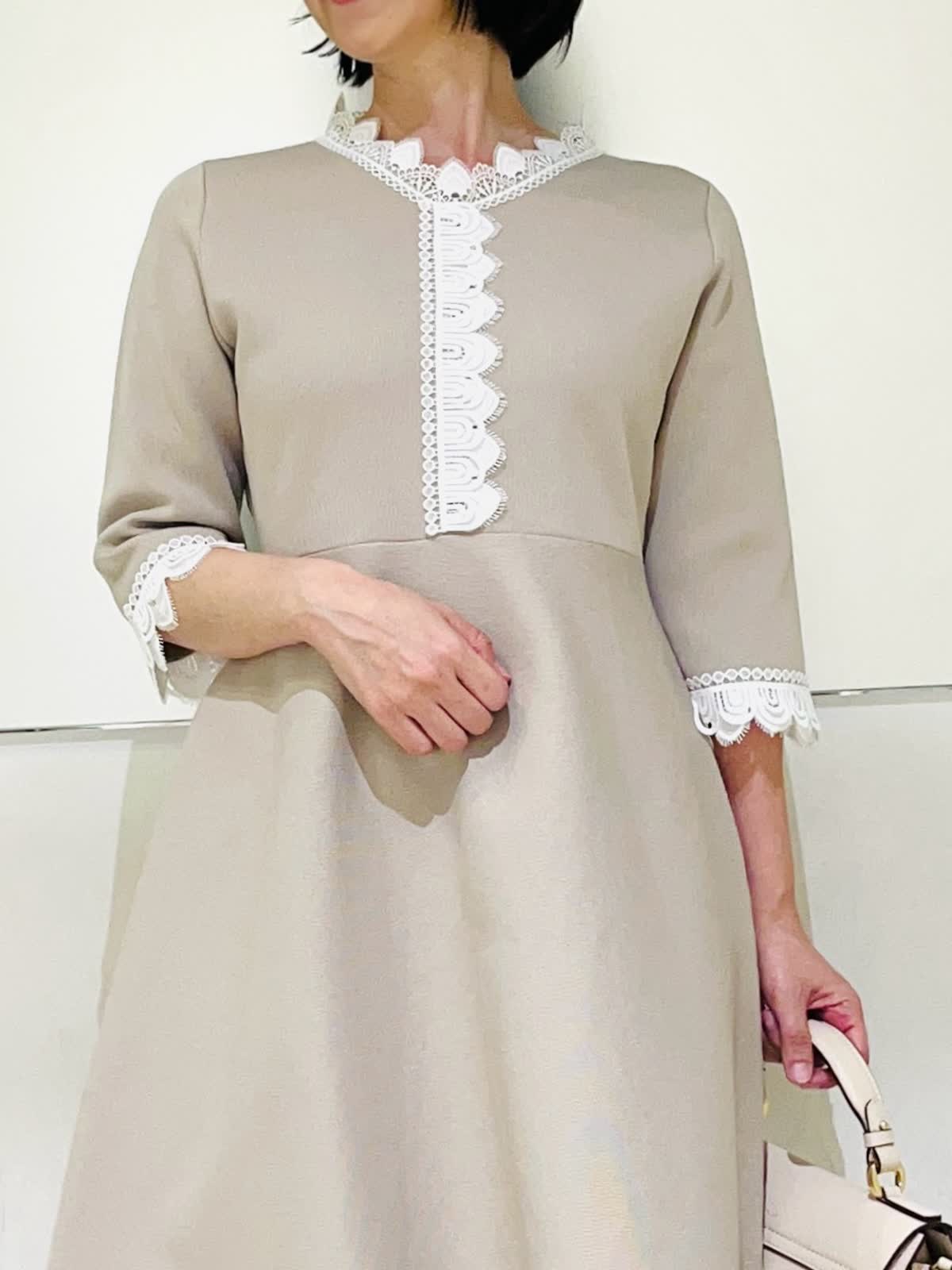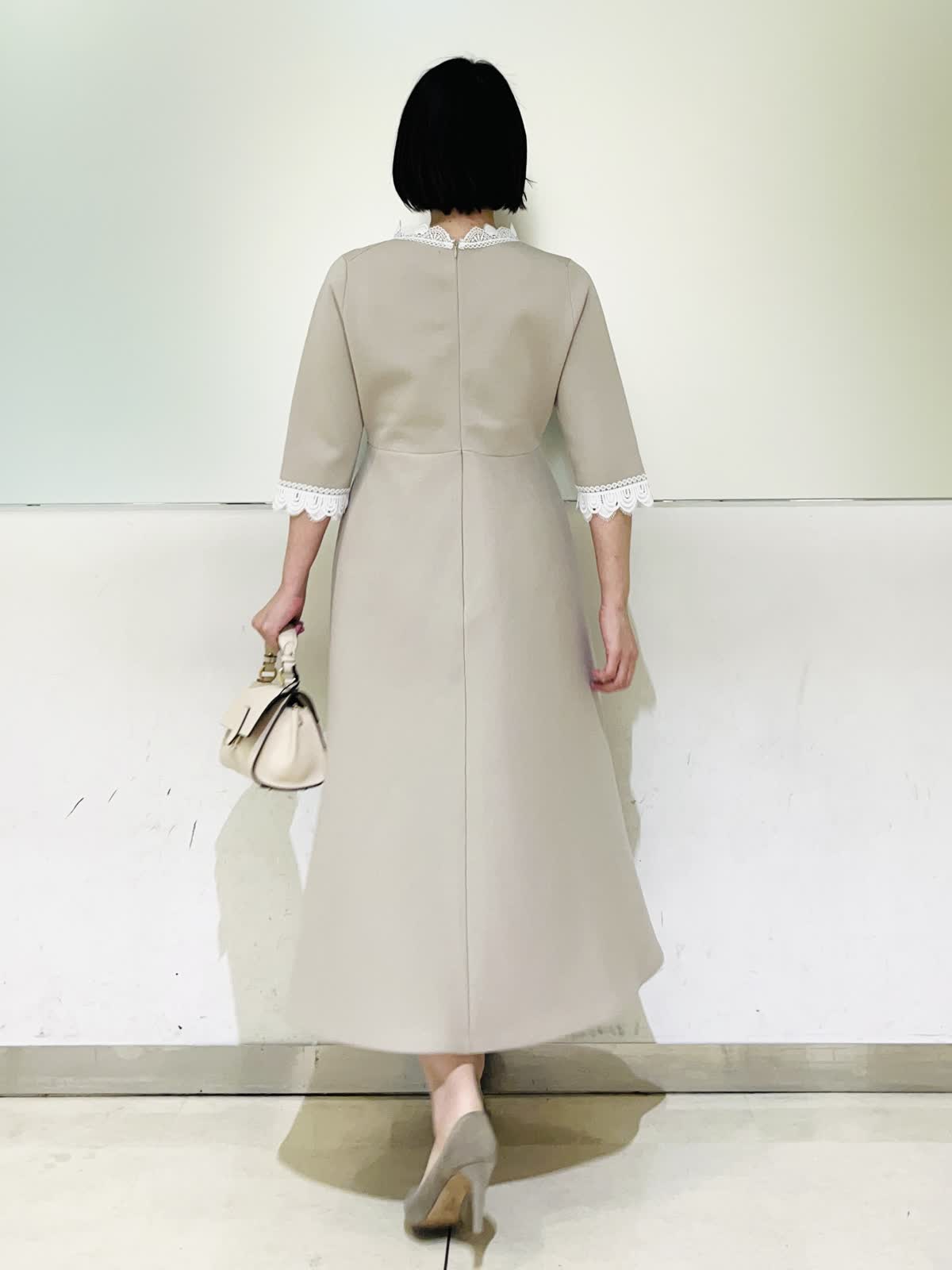 【着用アイテム/カラー】ワンピース:9号/ベージュ 春のお呼ばれコーディネート。上品なベージュのカラーに真っ白なレースが映えるニットワンピース。ニットなのに立体的なフィット&フレアのシルエットがきれいに出るのはMaglieだからこそ。スポンディッシュでハリ感のある素材で、いつもよりゆとりを感じたのでフィットしたシルエットがお好きな方はワンサイズ下でもいいかもしれません。お顔合わせや女子会など、華やかなシーンにおすすめのワンピースです。
