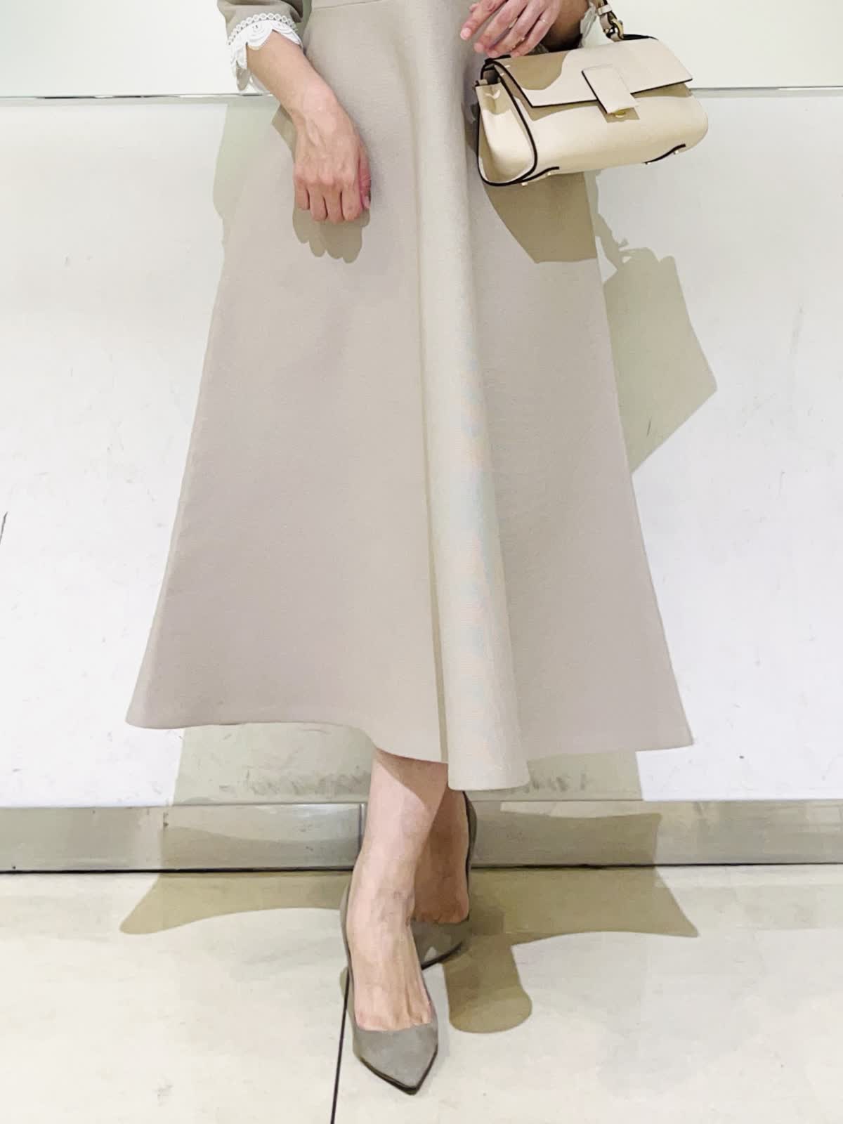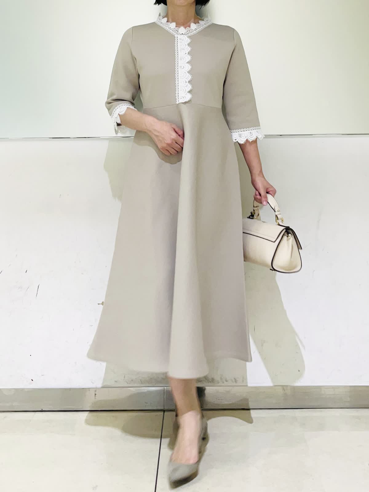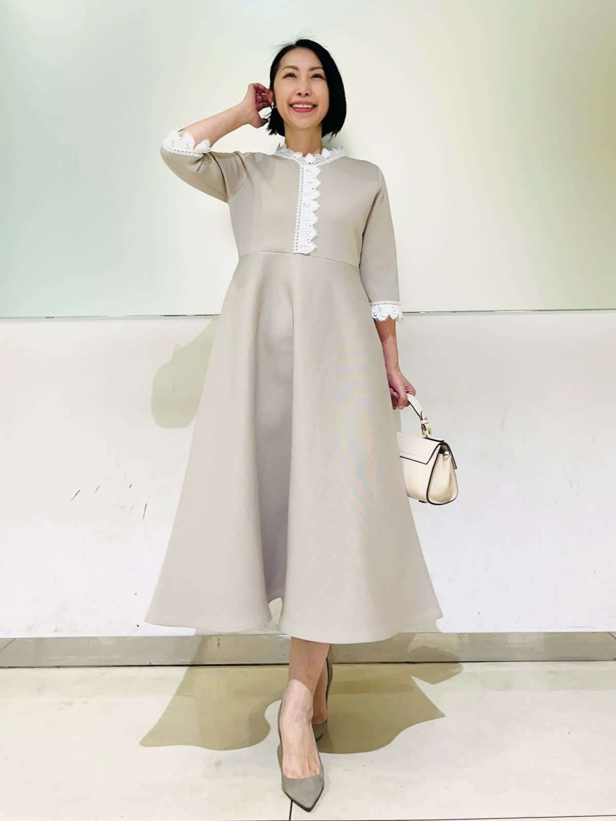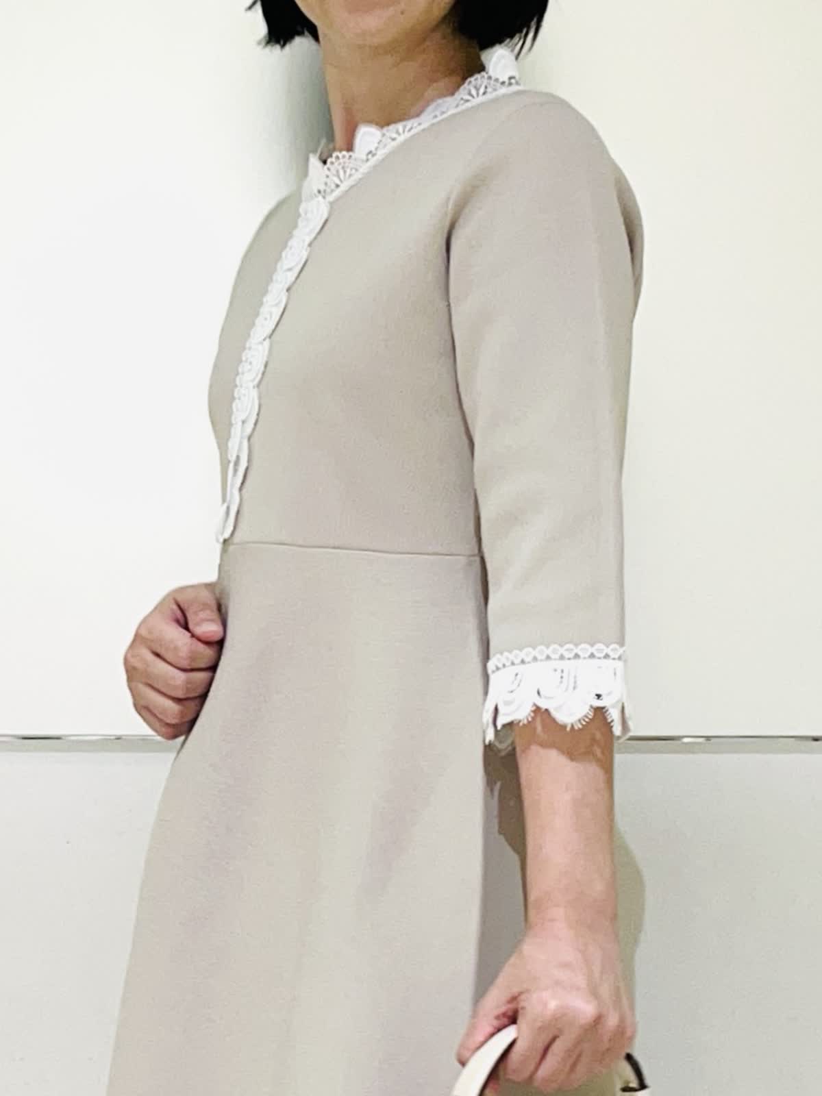 【着用アイテム/カラー】ワンピース:9号/ベージュ 春のお呼ばれコーディネート。上品なベージュのカラーに真っ白なレースが映えるニットワンピース。ニットなのに立体的なフィット&フレアのシルエットがきれいに出るのはMaglieだからこそ。スポンディッシュでハリ感のある素材で、いつもよりゆとりを感じたのでフィットしたシルエットがお好きな方はワンサイズ下でもいいかもしれません。お顔合わせや女子会など、華やかなシーンにおすすめのワンピースです。