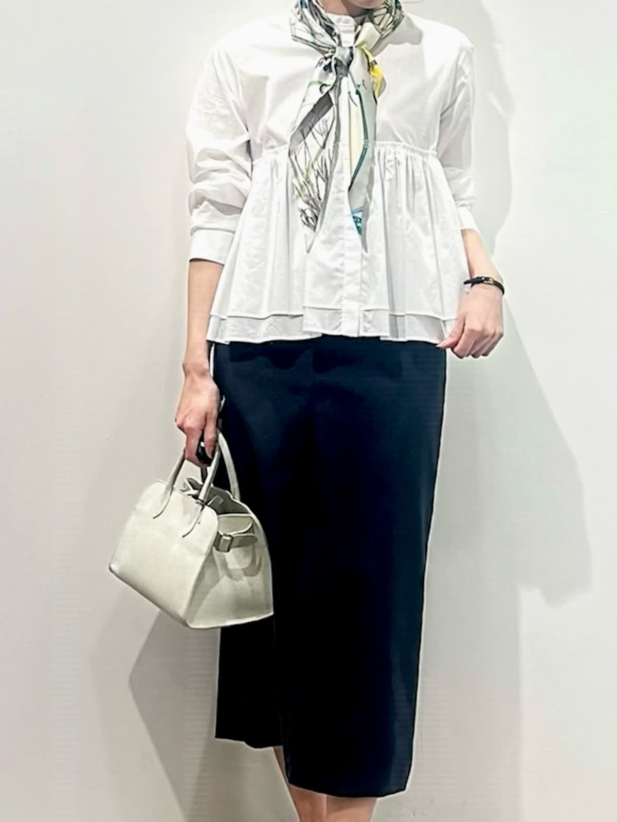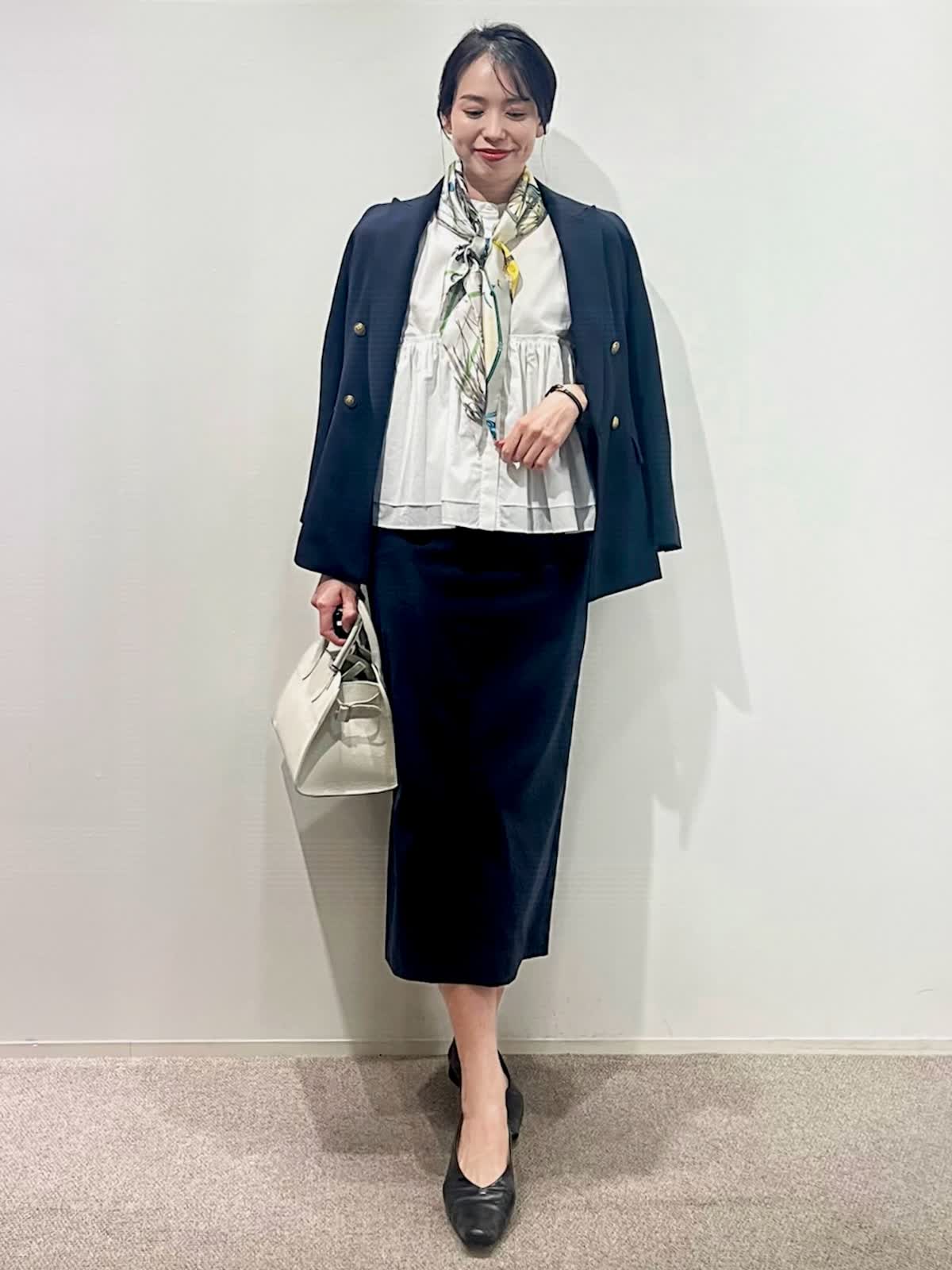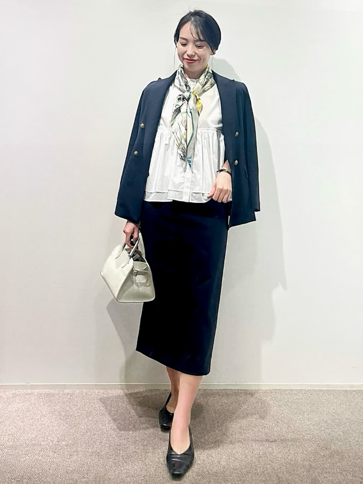 【着用サイズ】ジャケット:9号 ブラウス:9号 スカート:11号 【着用カラー】ジャケット:ネイビー ブラウス:オフホワイト スカート:ネイビー バッグ:グレー 「きちんと感&軽やか、春のお仕事スタイル」 デザインブラウスは、ウエストギャザー切り替えですっきり着こなせる万能アイテム。ボトムはタイトスカートの着こなしで、Iラインが強調され、スタイルアップが叶います。ジャケットを羽織るとお仕事スタイルにもおすすめ。デイリーから通勤まで着回し万能スタイルです。