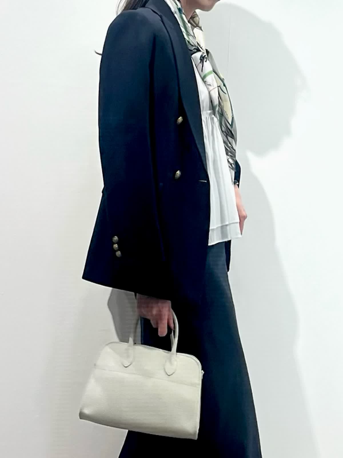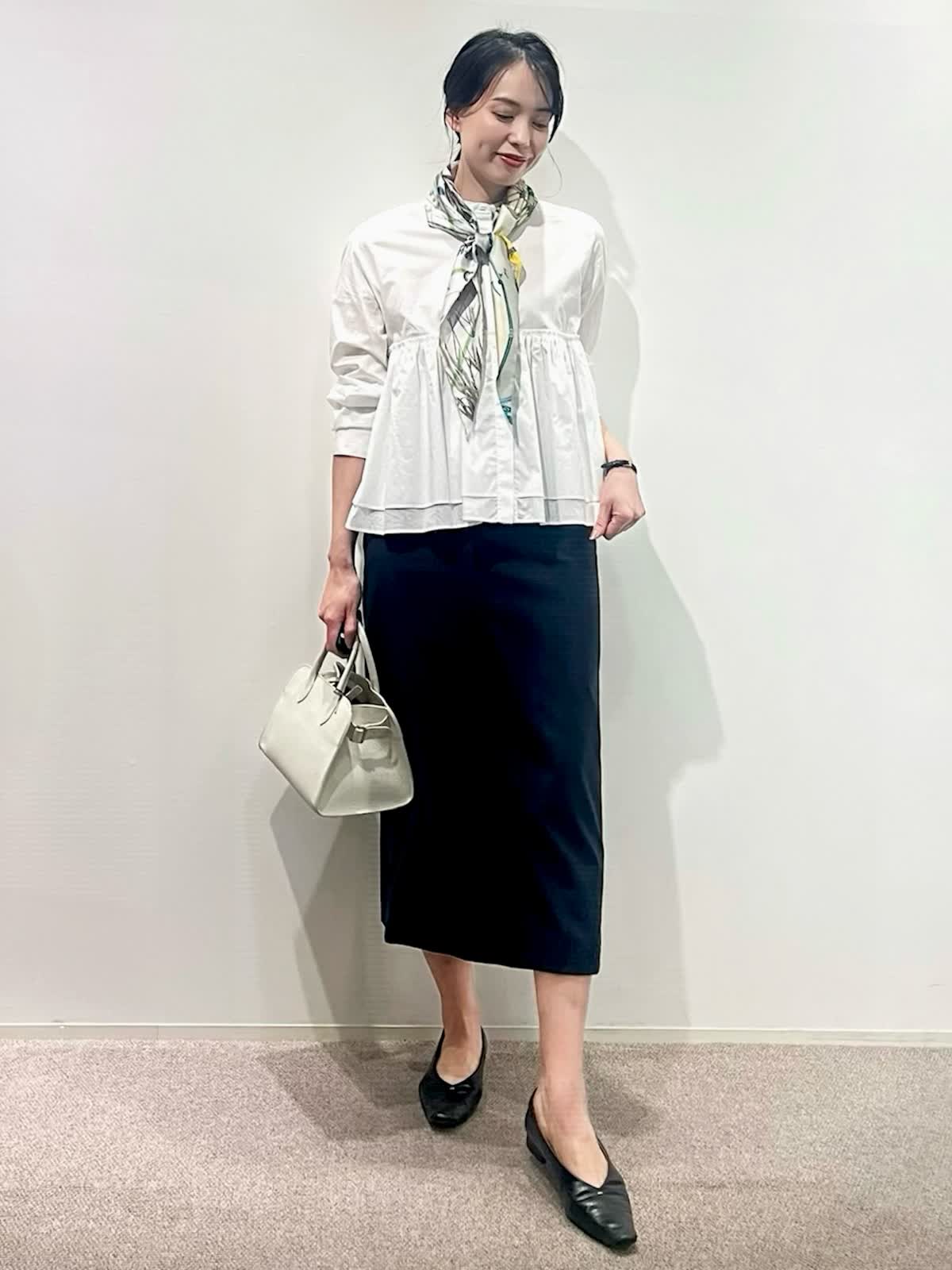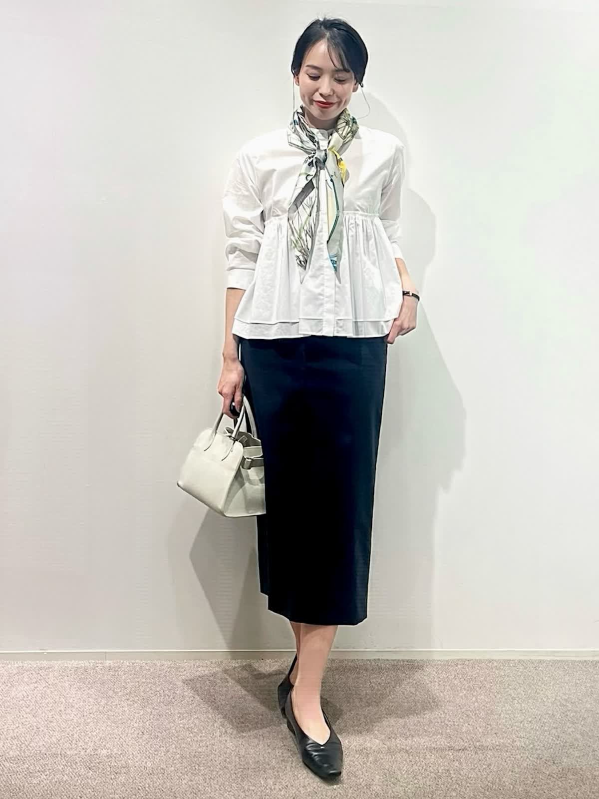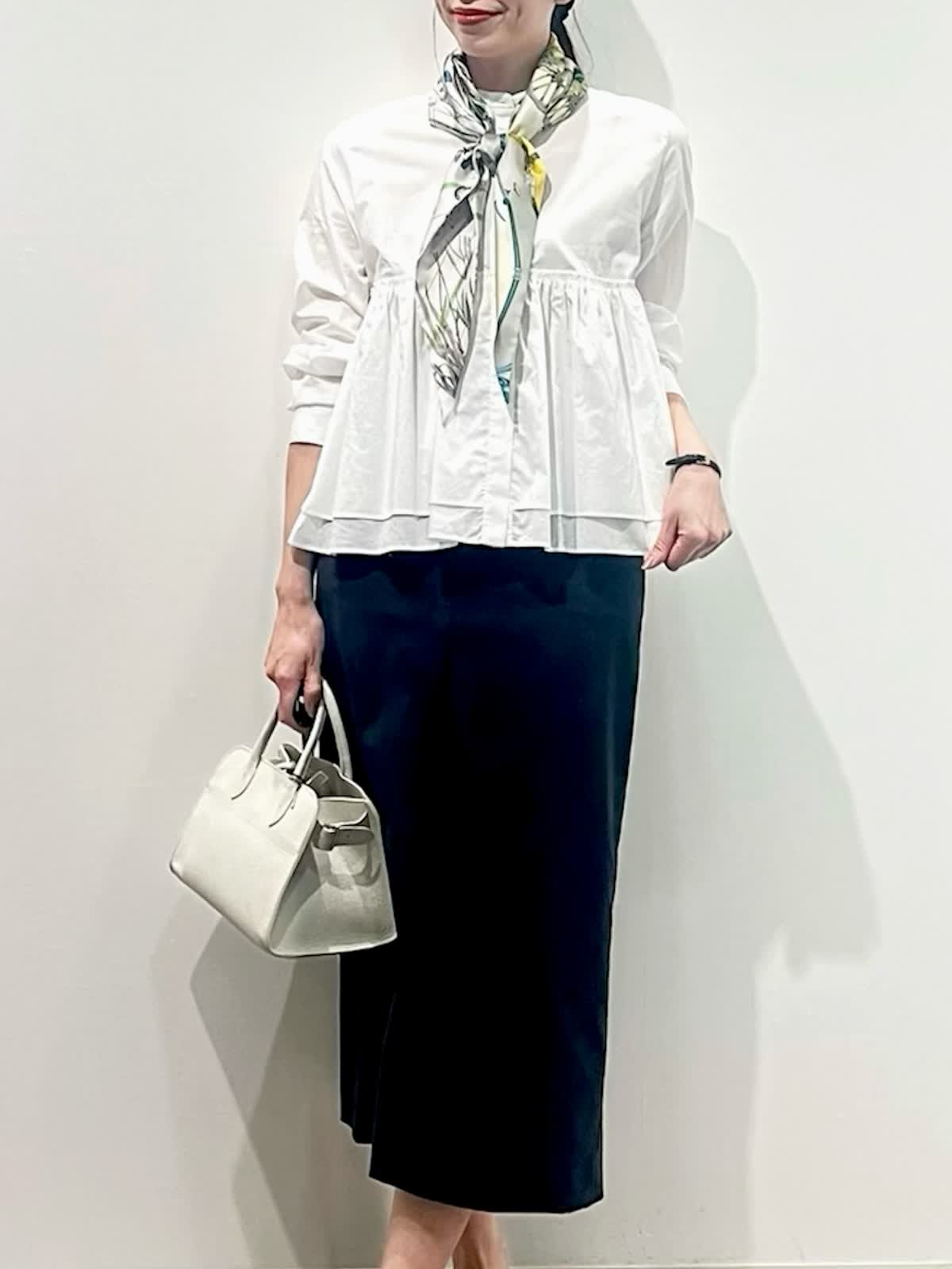 【着用サイズ】ジャケット:9号 ブラウス:9号 スカート:11号 【着用カラー】ジャケット:ネイビー ブラウス:オフホワイト スカート:ネイビー バッグ:グレー 「きちんと感&軽やか、春のお仕事スタイル」 デザインブラウスは、ウエストギャザー切り替えですっきり着こなせる万能アイテム。ボトムはタイトスカートの着こなしで、Iラインが強調され、スタイルアップが叶います。ジャケットを羽織るとお仕事スタイルにもおすすめ。デイリーから通勤まで着回し万能スタイルです。