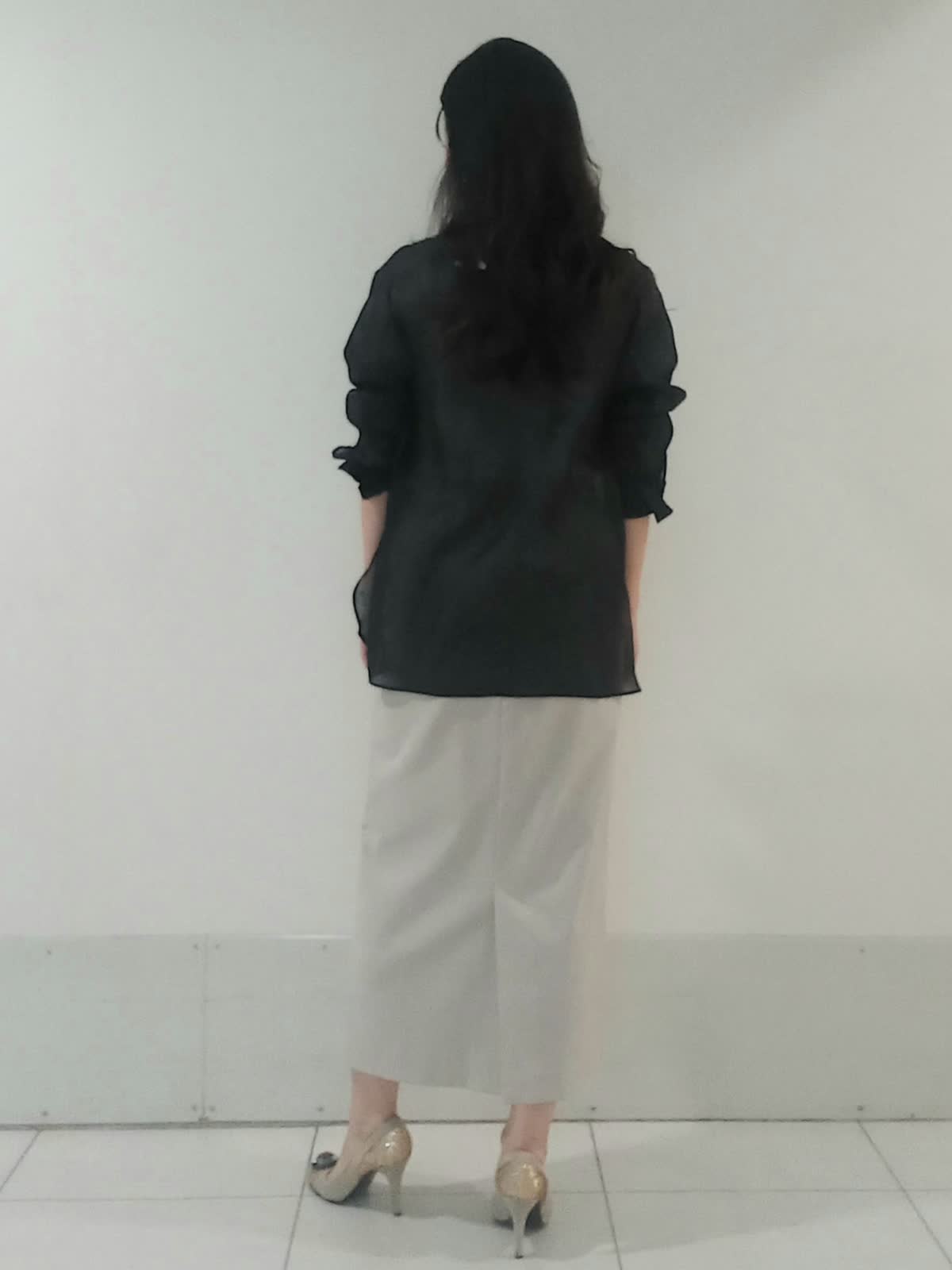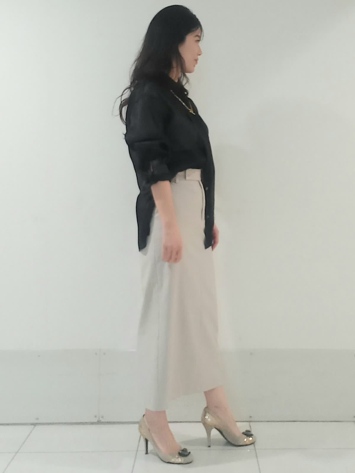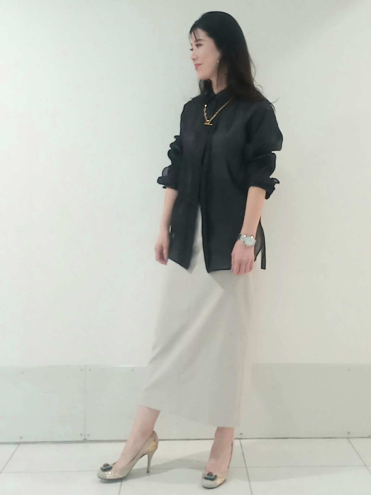 【着用サイズ、シアーシャツ9号、スカート9号】 シアーシャツの軽やかな透け感とスッキリしたシルエットのタイトスカートのバランスが最大のポイント。 黒は重くなりがちな色ですが、肌が透けることで抜け感が出て春夏のダークカラーも涼しげに見えます。アイボリーのタイトスカートが全体のトーンをパッと明るくさせ上品な印象に。 シアーシャツは全部出すとリラックス感が強すぎ、全部入れるとカッチリしすぎる所をハーフインした着方ひとつでこなれ感を演出出来ます。 腰の位置が高く見えるのでスタイルアップ効果もばっちりです!