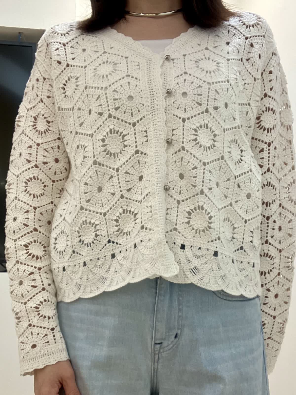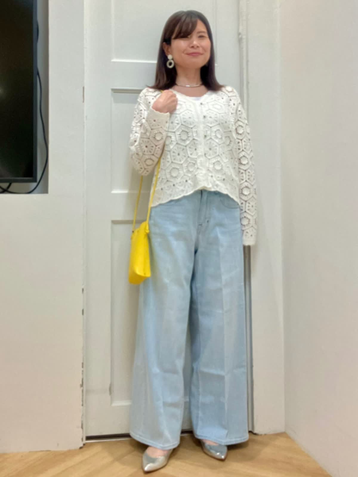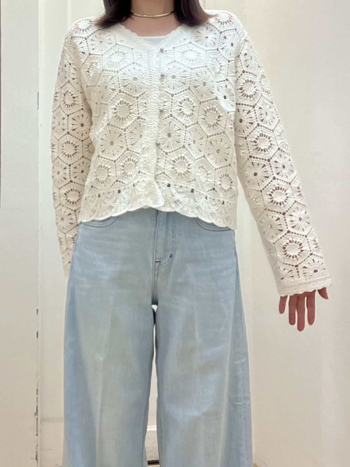 【着用サイズ】ニット:9号 パンツ:7号 【着用カラー】ニット:オフホワイト パンツ:サックス 休日のリラックスカジュアルスタイル 立体感のあるクロシェ編みが印象的なニットカーディガン。夏場まで着回せる綿100%で柔らかい着心地。シルバーボタンもポイントで、短めの着丈でバランスが取りやすいです。いつものデニムスタイルを新鮮に見せたい方におすすめです。