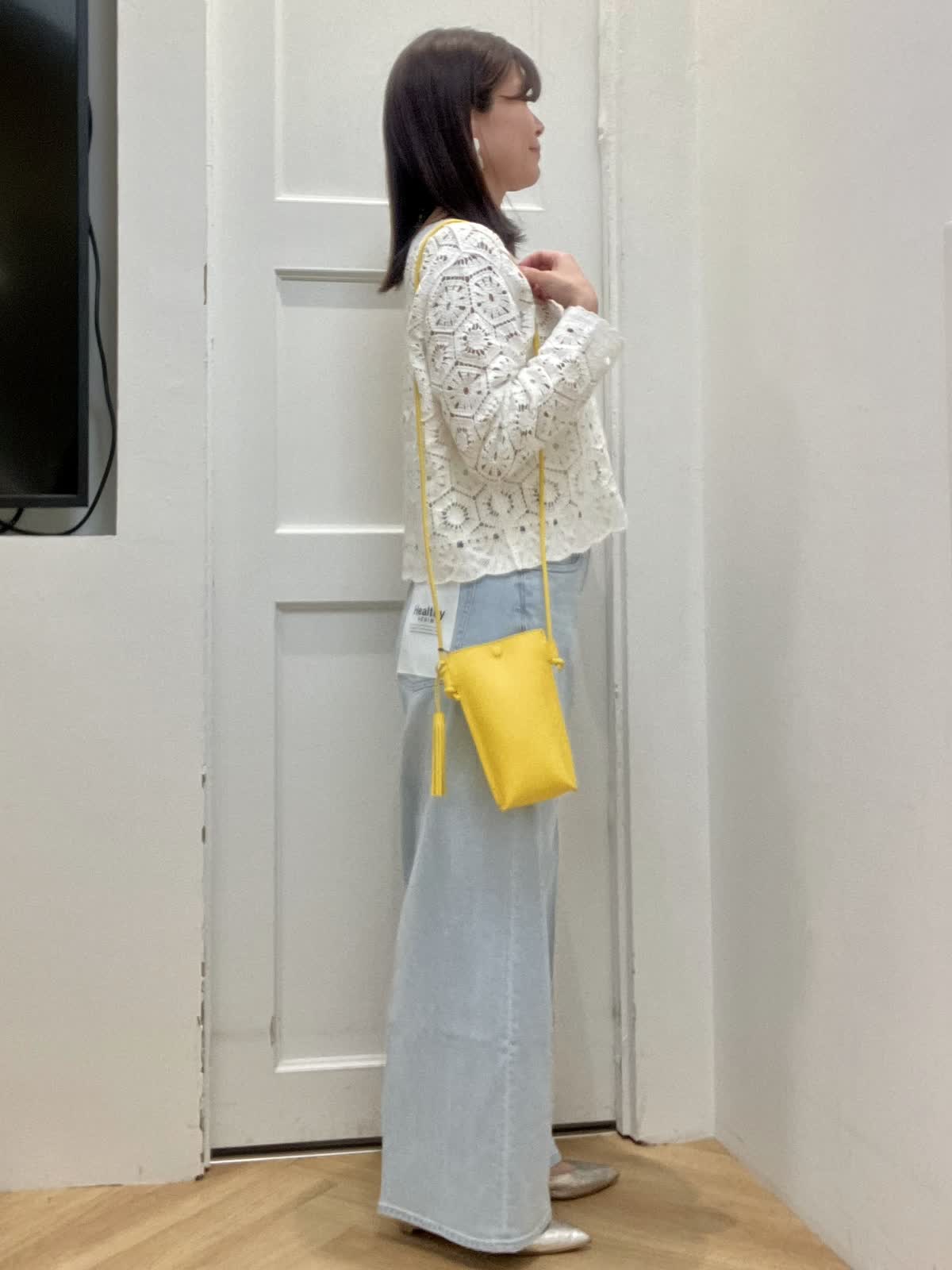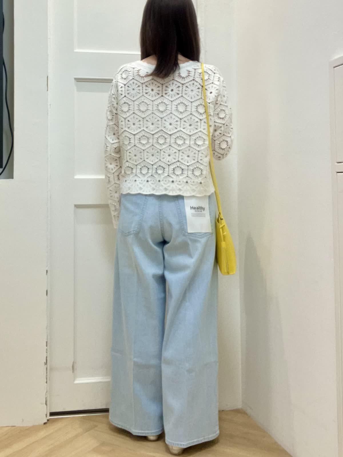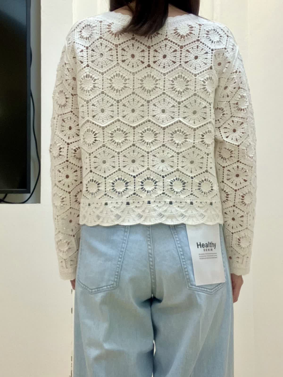 【着用サイズ】ニット:9号 パンツ:7号 【着用カラー】ニット:オフホワイト パンツ:サックス 休日のリラックスカジュアルスタイル 立体感のあるクロシェ編みが印象的なニットカーディガン。夏場まで着回せる綿100%で柔らかい着心地。シルバーボタンもポイントで、短めの着丈でバランスが取りやすいです。いつものデニムスタイルを新鮮に見せたい方におすすめです。