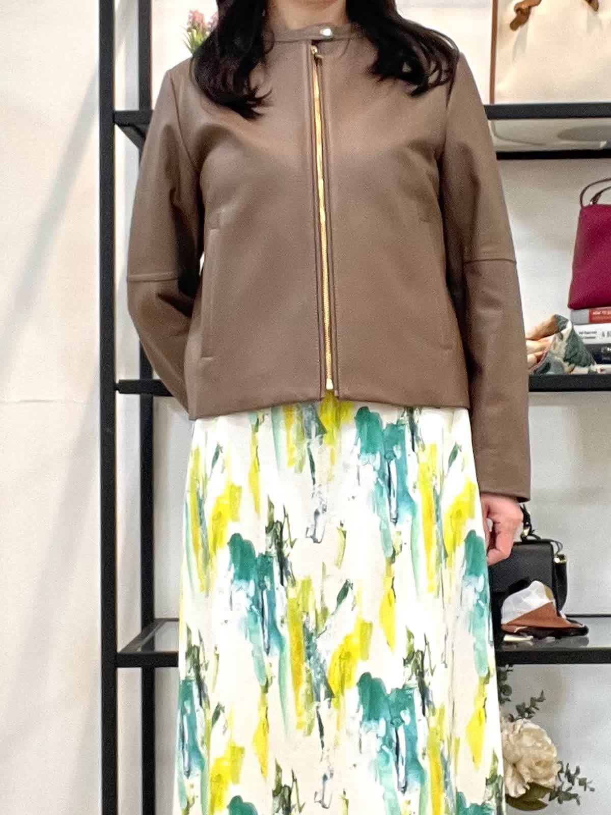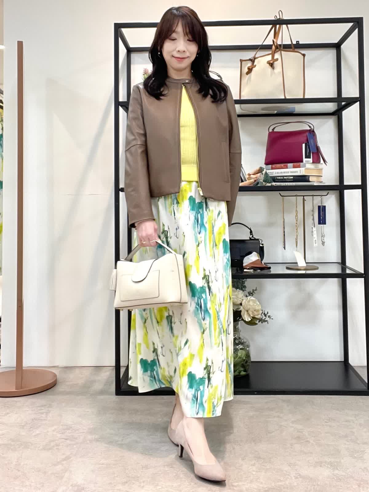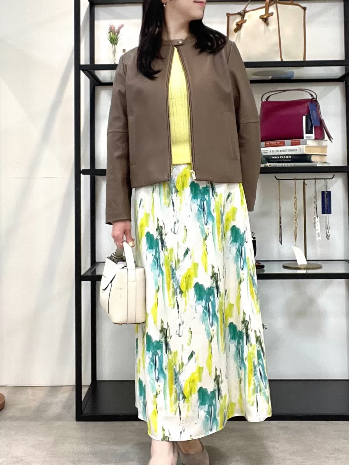 【着用サイズ】全て9号 【着用カラー】ブルゾン:ブラウン ニット:イエロー スカート:ペパーミント 春のお出かけスタイル。上品な光沢感のラムレザーブルゾン。柔らかい着心地、アームホールがゆったり目で楽に羽織れます。ベーシックなデザインでカジュアルにも綺麗目にも幅広く着用いただけます。春らしいカラーのスカートは落ち感のあるスッキリとしたシルエット。シワになりにくい素材でお洗濯可能も嬉しいポイントです。