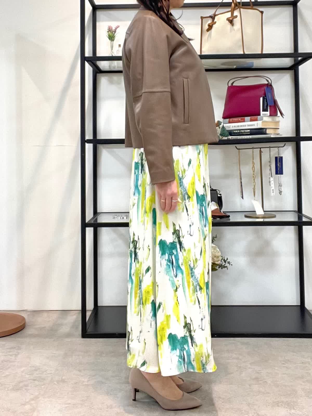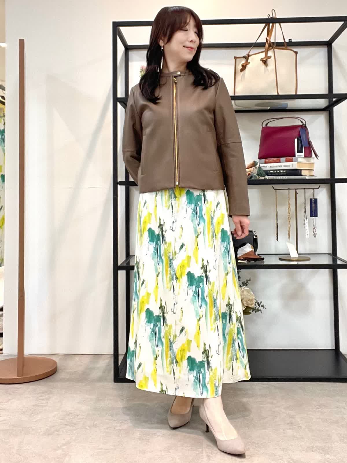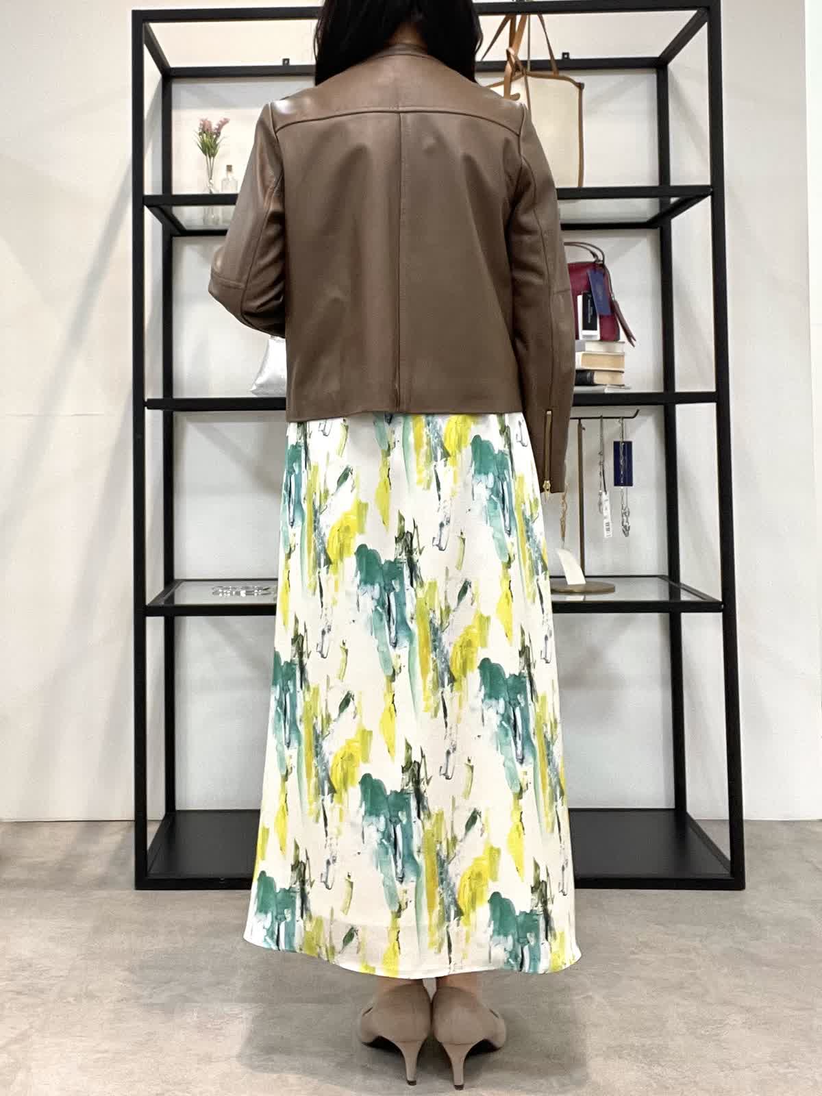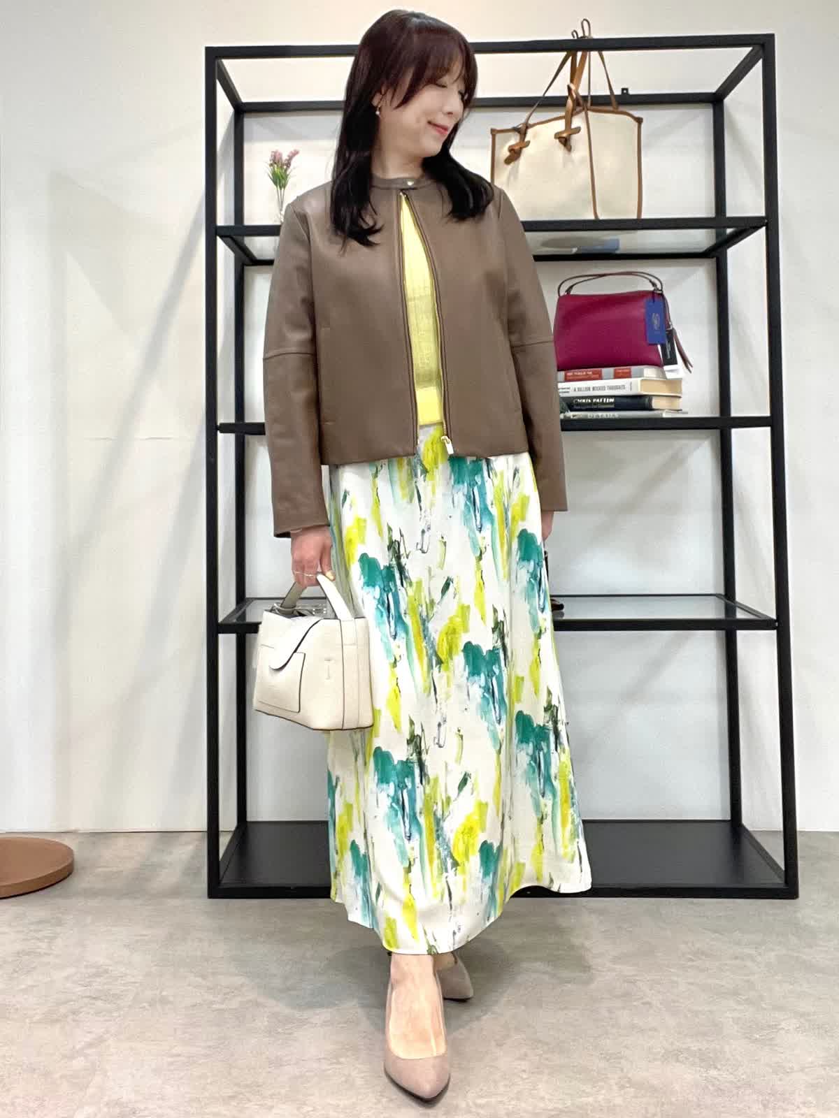【着用サイズ】全て9号 【着用カラー】ブルゾン:ブラウン ニット:イエロー スカート:ペパーミント 春のお出かけスタイル。上品な光沢感のラムレザーブルゾン。柔らかい着心地、アームホールがゆったり目で楽に羽織れます。ベーシックなデザインでカジュアルにも綺麗目にも幅広く着用いただけます。春らしいカラーのスカートは落ち感のあるスッキリとしたシルエット。シワになりにくい素材でお洗濯可能も嬉しいポイントです。