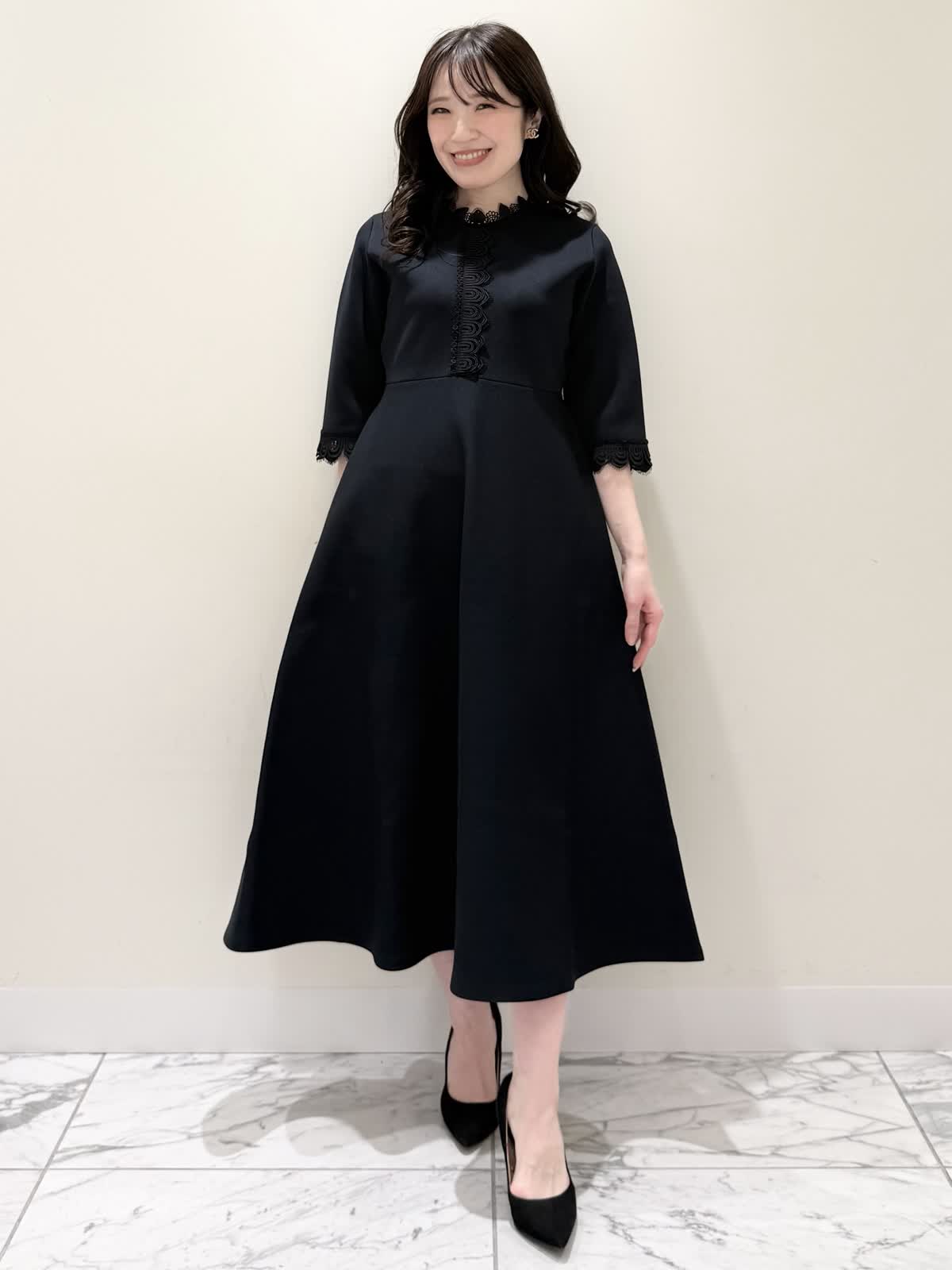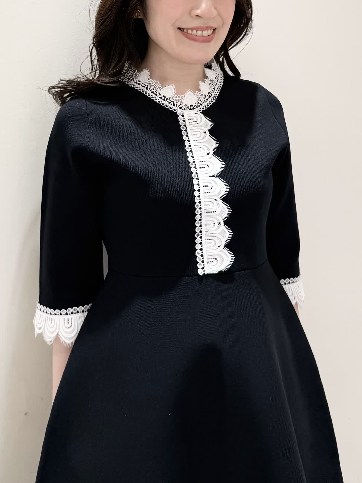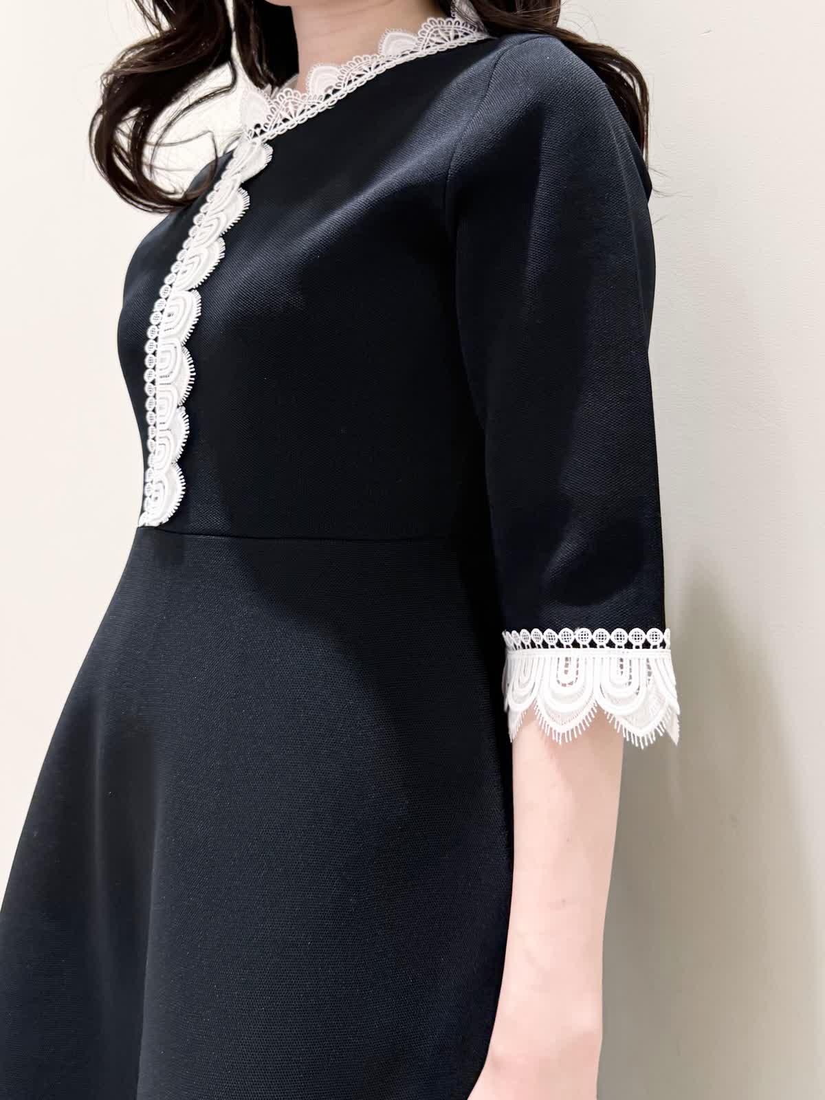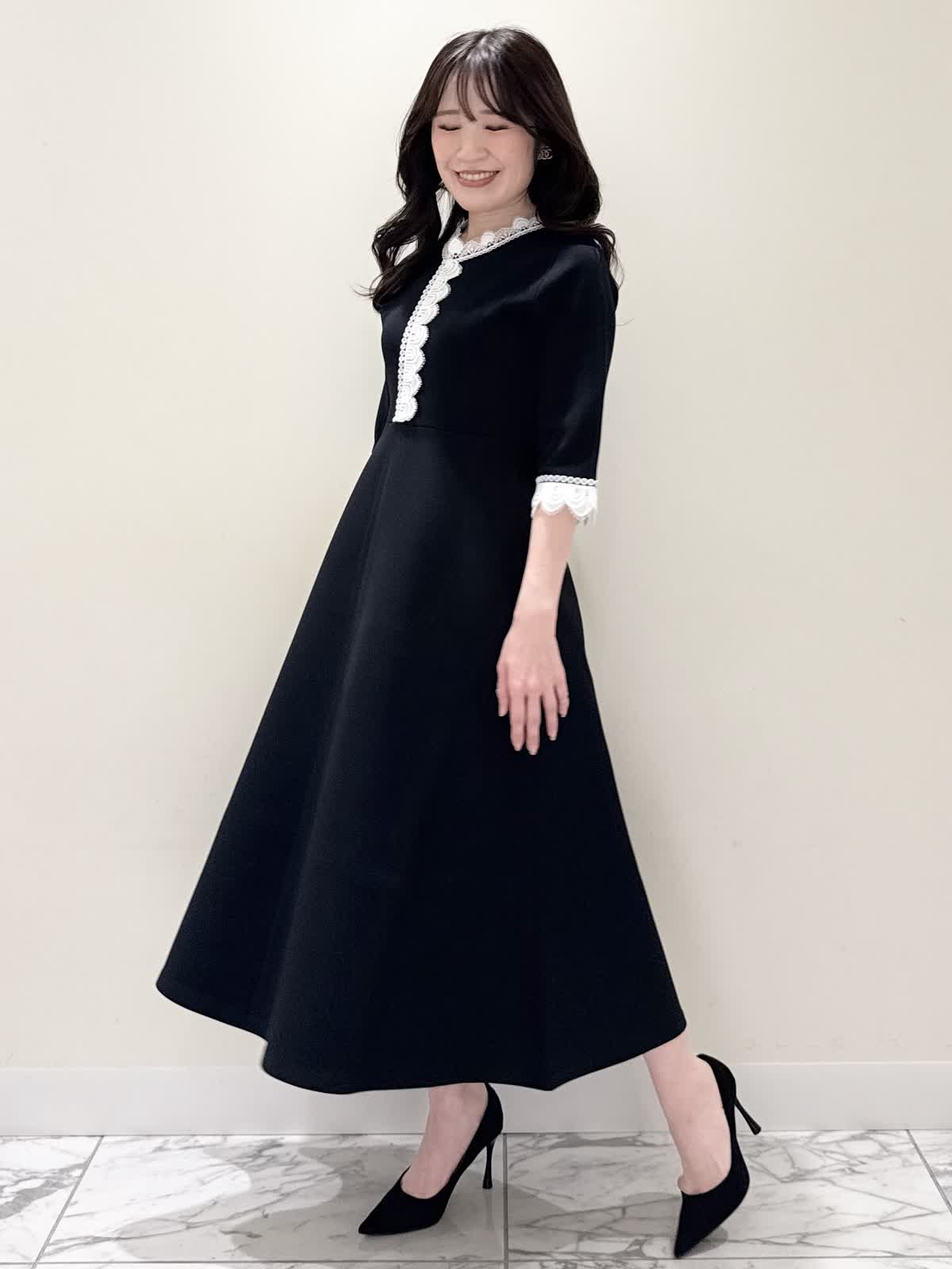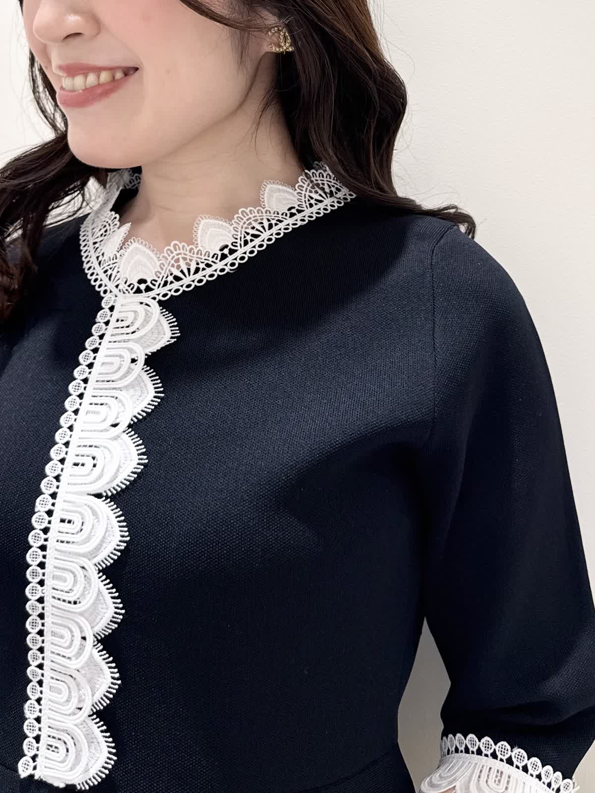 【着用サイズ/カラー】ニットワンピース:5号/ブラック ニットワンピース:7号/ベージュ・ネイビー ローファー:24.0cm/オフホワイト 着るだけでスタイルUPが叶う魔法のワンピース♪ 目を惹くオリジナルレースは衿ぐり、前立て、袖口に贅沢にあしらわれ、顔まわりを華やかに見せてくれます。衿ぐりのレースは首に当たらない工夫がされており、絶妙な開き具合ですっきりと着られます。切り替え高めからのフィット&フレアシルエットで程よいハリ感があるのでスカート部分のフレアシルエットがしっかりと出るのが特徴。身体のラインを拾わず、生地は硬くなく、アームホールもゆとりがあるので着心地◎着るといつもよりゆったりしているかなと思いますが、程よいゆとりがあるシルエットが綺麗に見えるので、いつものサイズで良いかと思います。