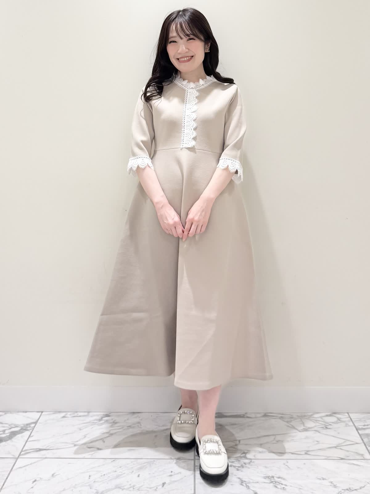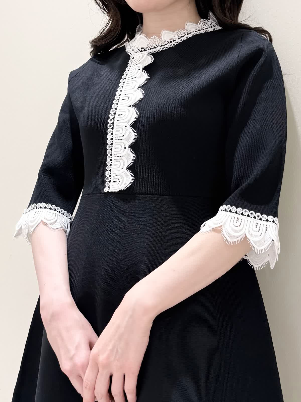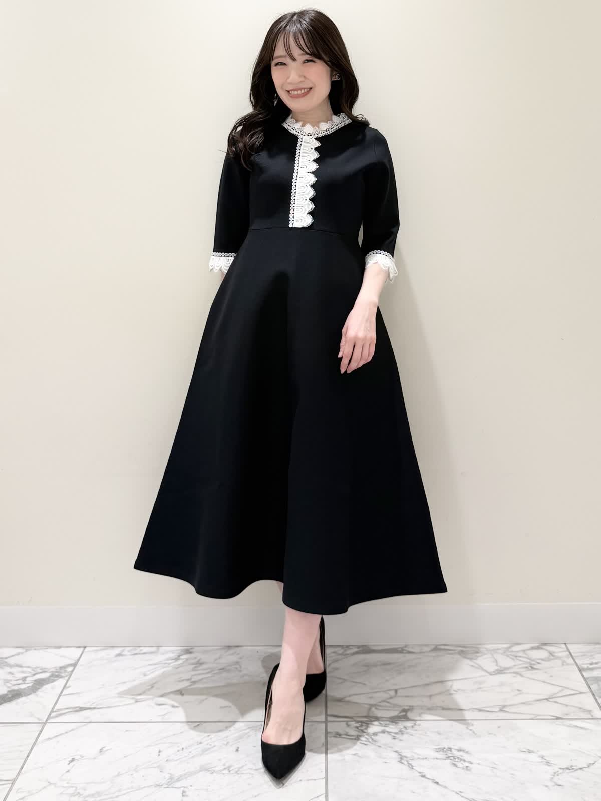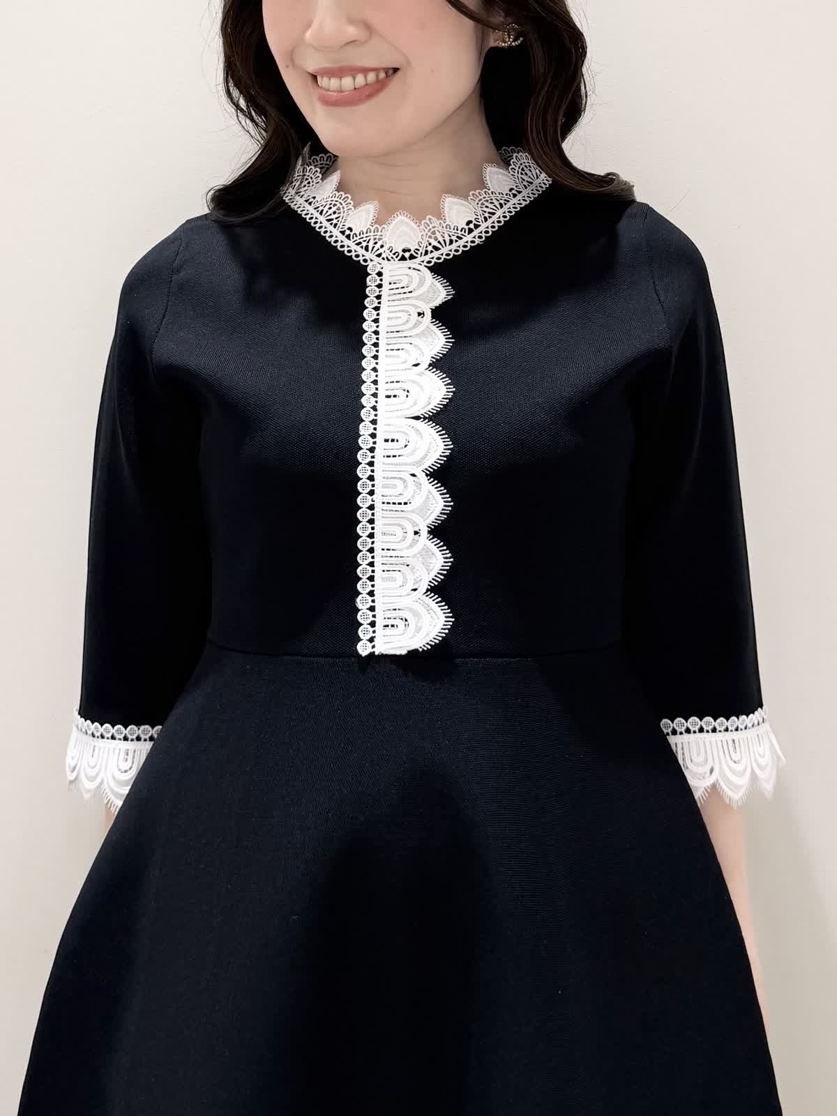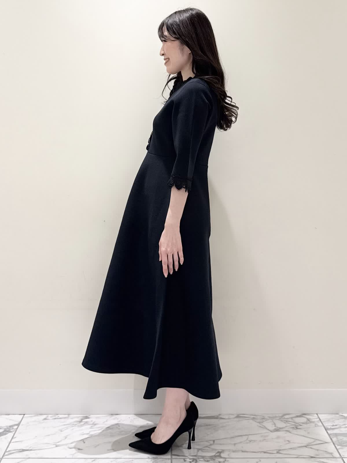 【着用サイズ/カラー】ニットワンピース:5号/ブラック ニットワンピース:7号/ベージュ・ネイビー ローファー:24.0cm/オフホワイト 着るだけでスタイルUPが叶う魔法のワンピース♪ 目を惹くオリジナルレースは衿ぐり、前立て、袖口に贅沢にあしらわれ、顔まわりを華やかに見せてくれます。衿ぐりのレースは首に当たらない工夫がされており、絶妙な開き具合ですっきりと着られます。切り替え高めからのフィット&フレアシルエットで程よいハリ感があるのでスカート部分のフレアシルエットがしっかりと出るのが特徴。身体のラインを拾わず、生地は硬くなく、アームホールもゆとりがあるので着心地◎着るといつもよりゆったりしているかなと思いますが、程よいゆとりがあるシルエットが綺麗に見えるので、いつものサイズで良いかと思います。