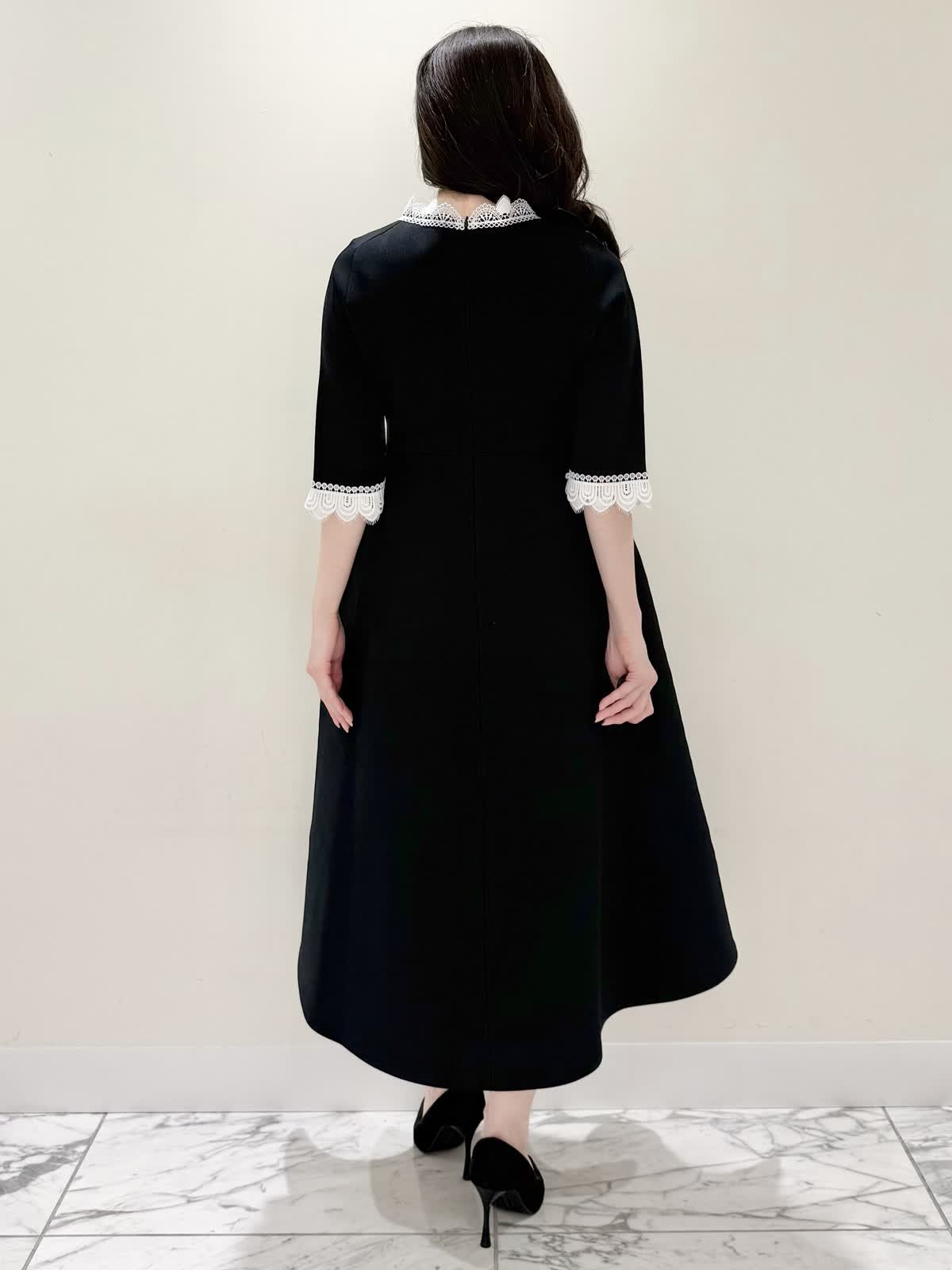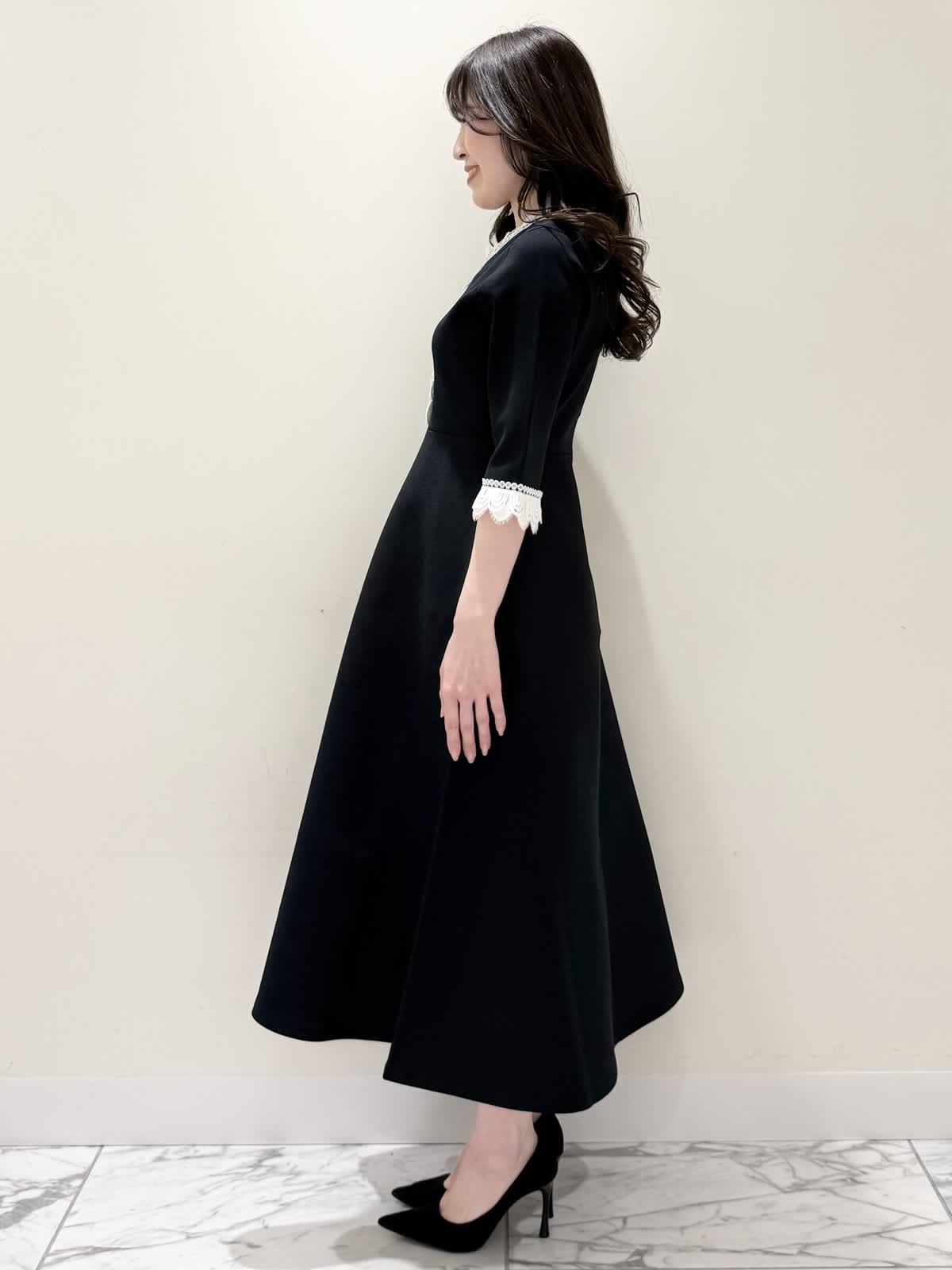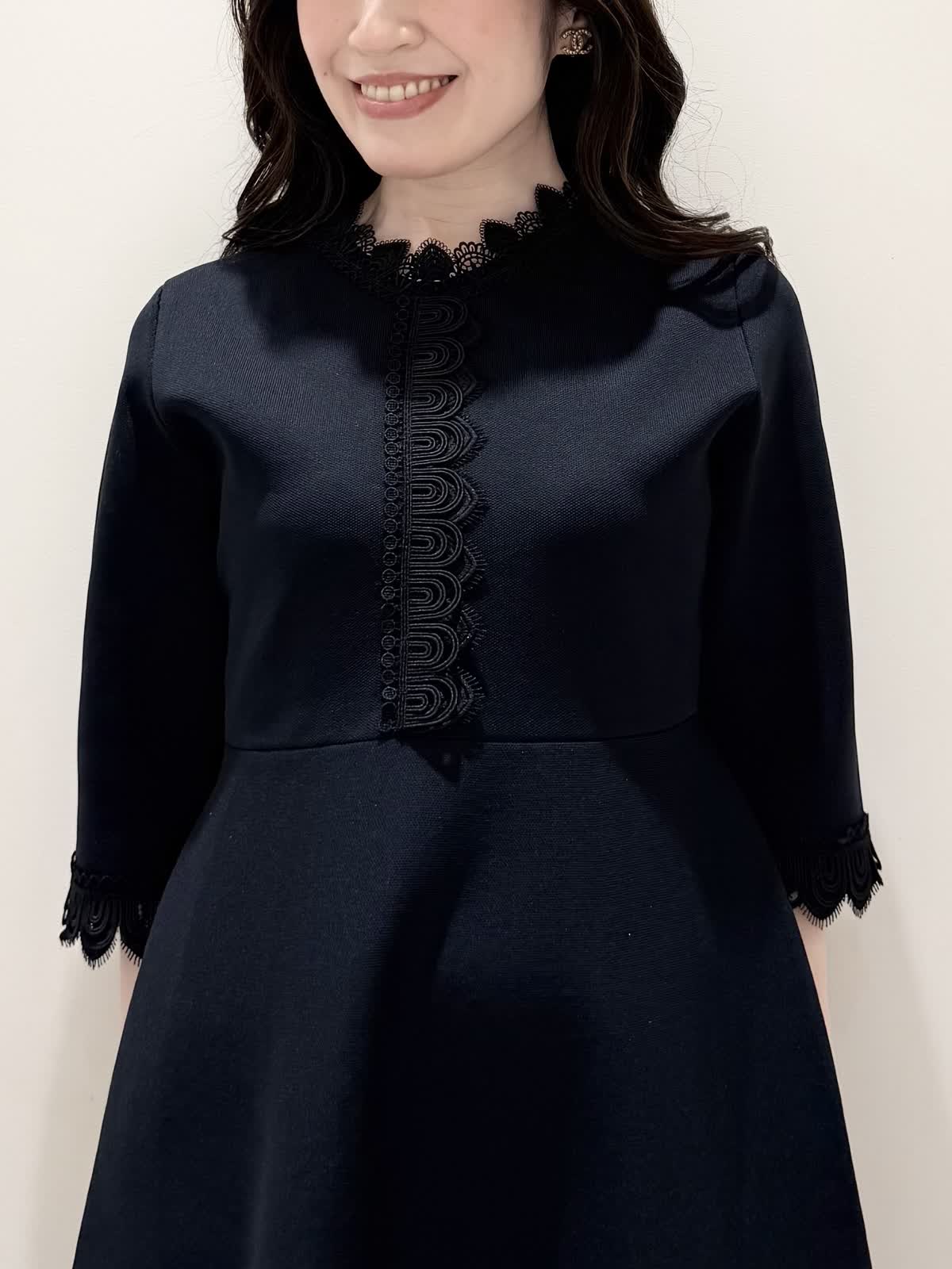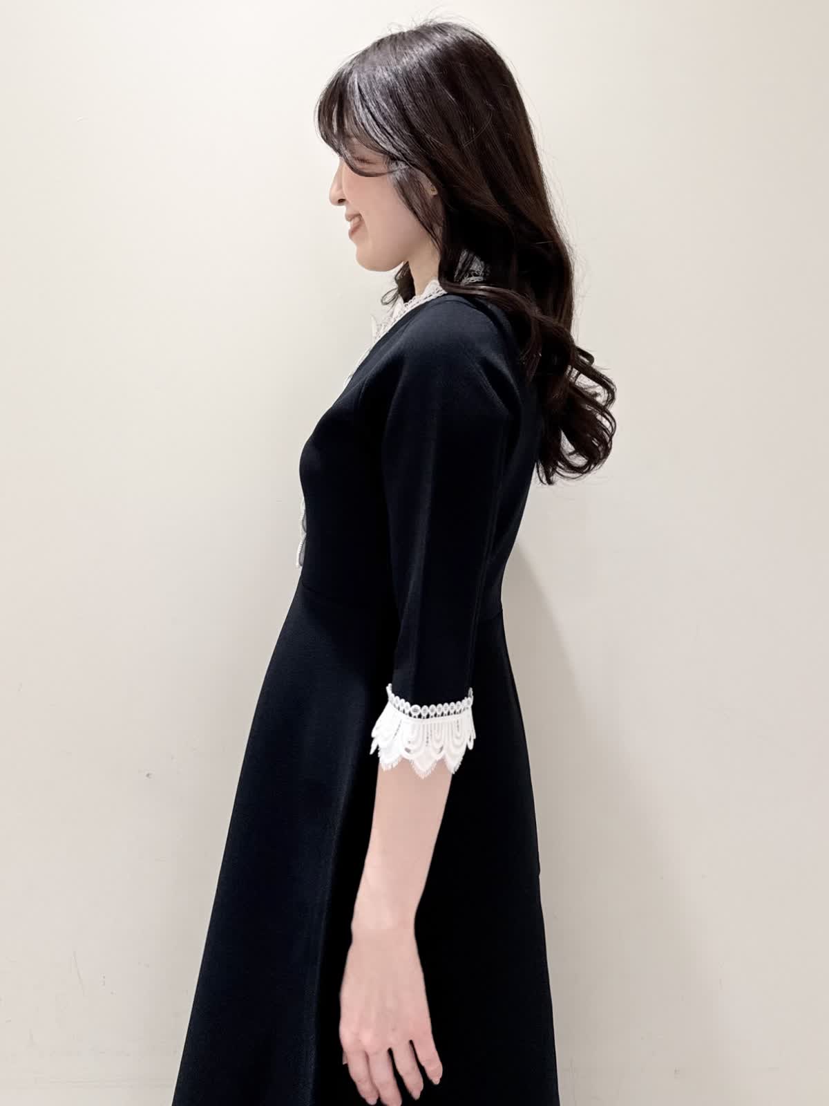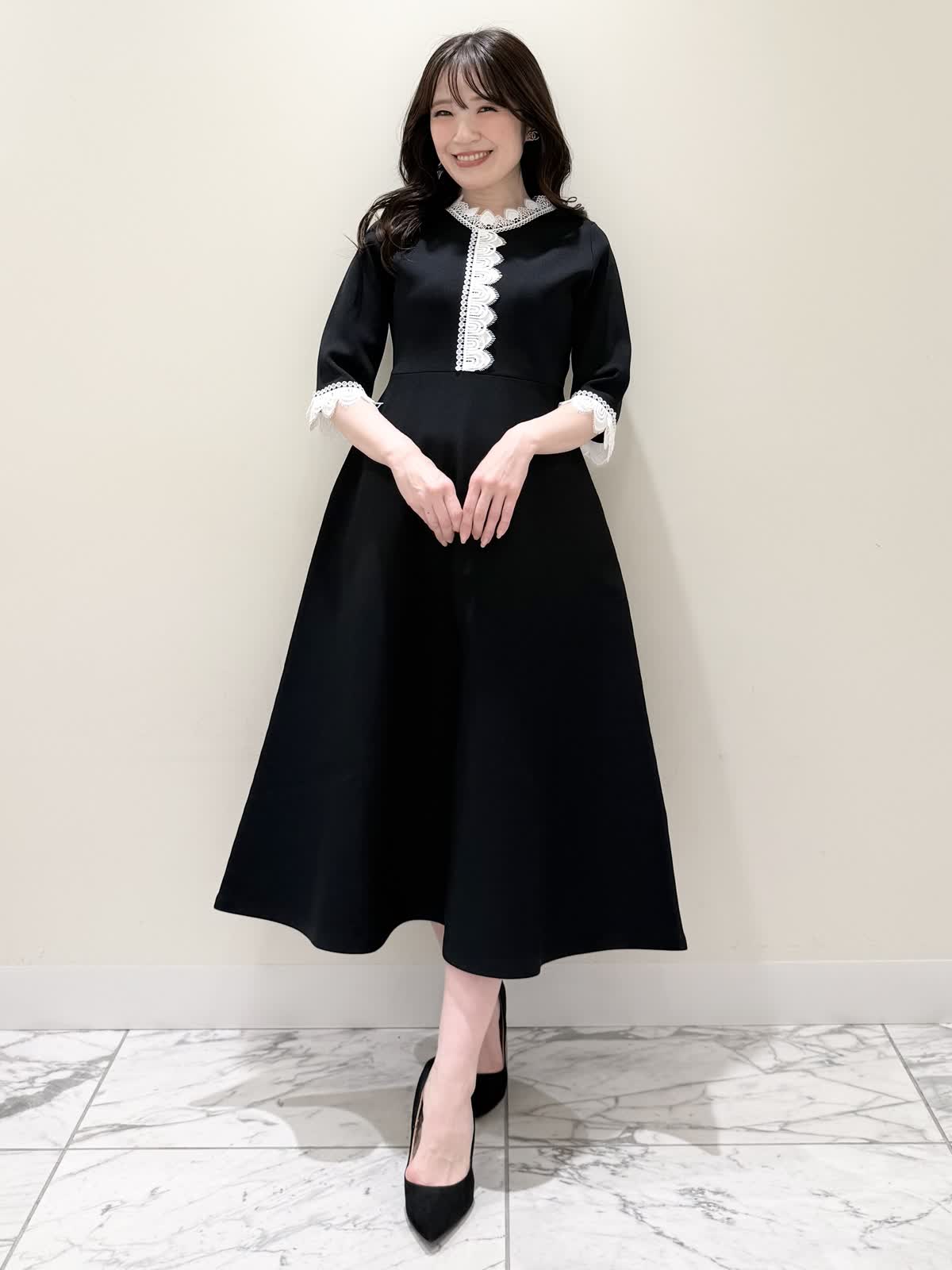 【着用サイズ/カラー】ニットワンピース:5号/ブラック ニットワンピース:7号/ベージュ・ネイビー ローファー:24.0cm/オフホワイト 着るだけでスタイルUPが叶う魔法のワンピース♪ 目を惹くオリジナルレースは衿ぐり、前立て、袖口に贅沢にあしらわれ、顔まわりを華やかに見せてくれます。衿ぐりのレースは首に当たらない工夫がされており、絶妙な開き具合ですっきりと着られます。切り替え高めからのフィット&フレアシルエットで程よいハリ感があるのでスカート部分のフレアシルエットがしっかりと出るのが特徴。身体のラインを拾わず、生地は硬くなく、アームホールもゆとりがあるので着心地◎着るといつもよりゆったりしているかなと思いますが、程よいゆとりがあるシルエットが綺麗に見えるので、いつものサイズで良いかと思います。