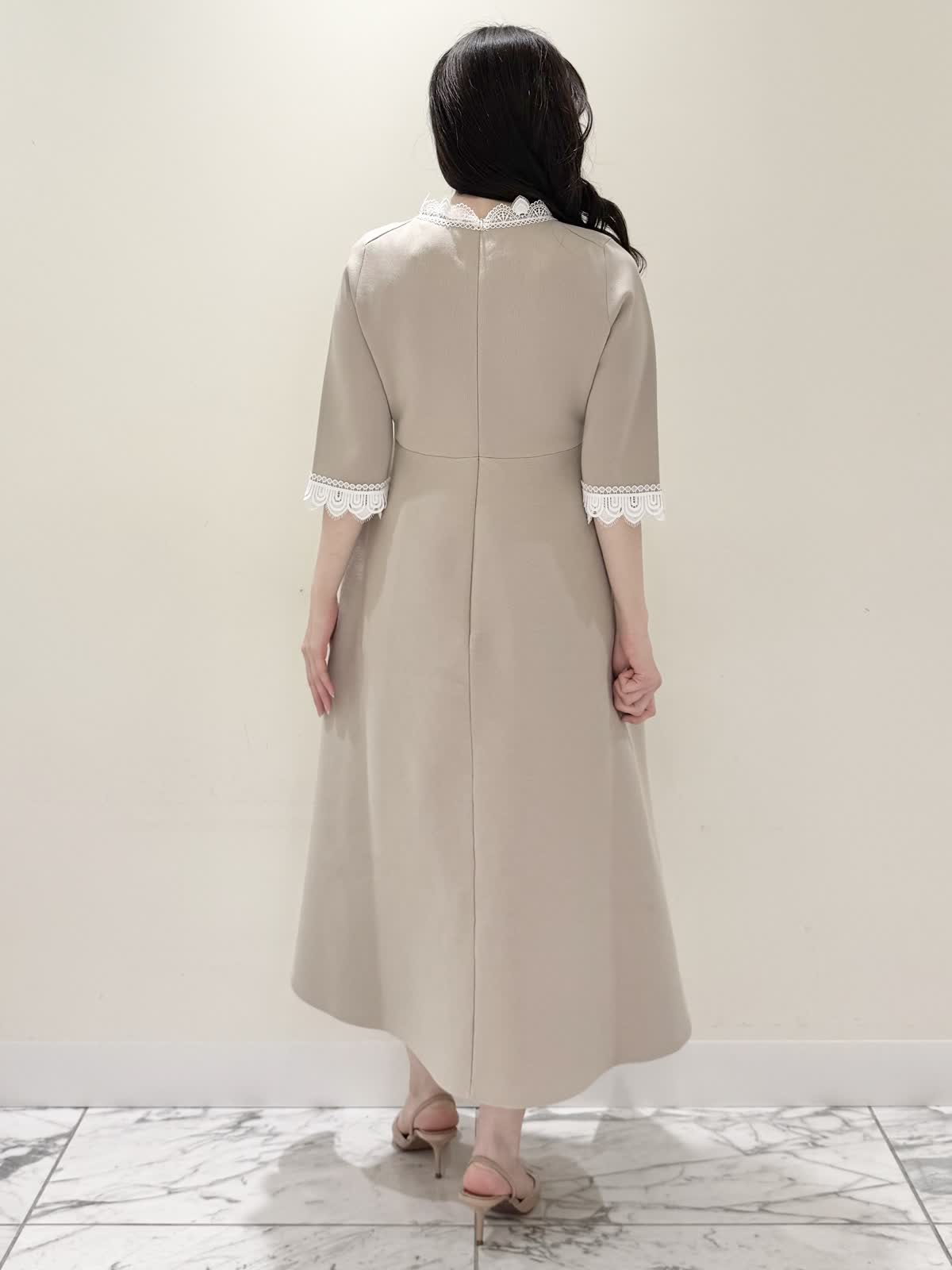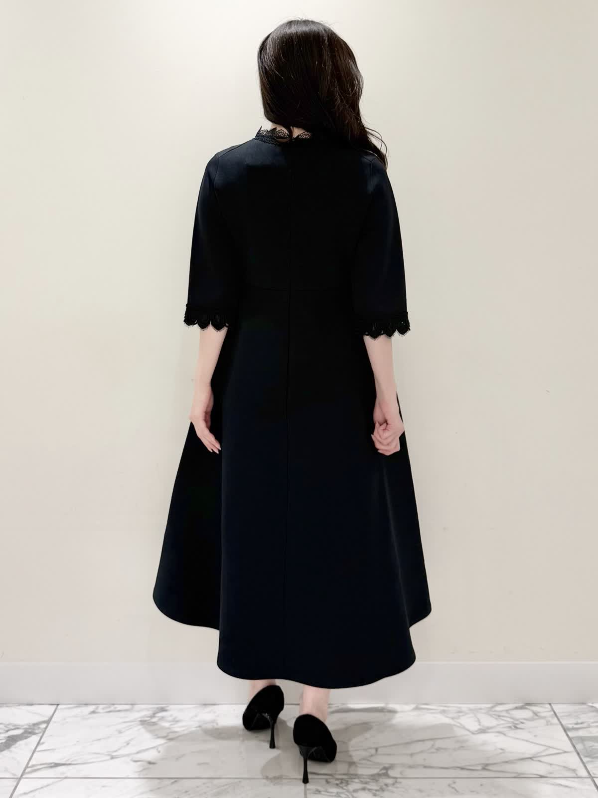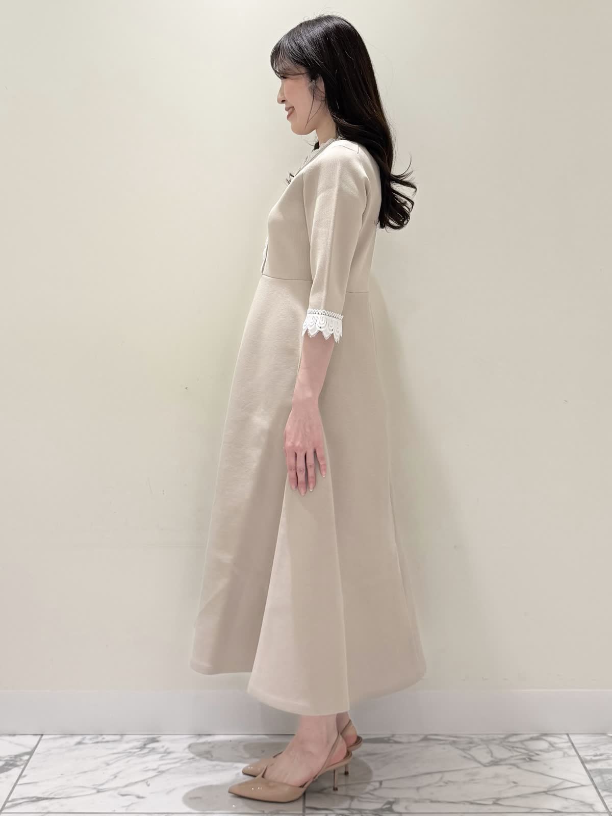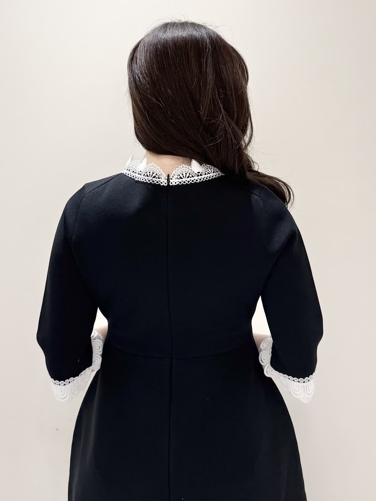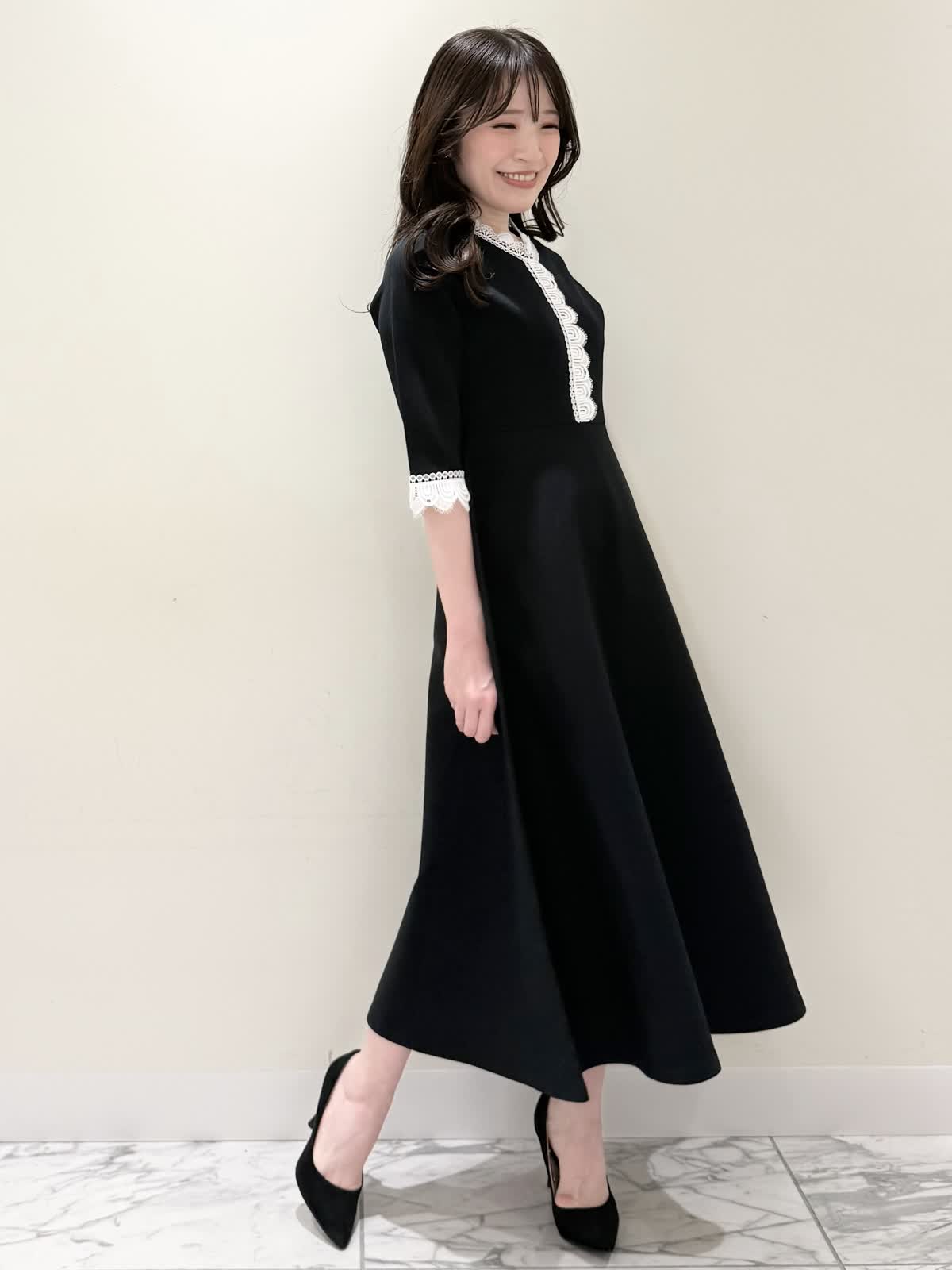 【着用サイズ/カラー】ニットワンピース:5号/ブラック ニットワンピース:7号/ベージュ・ネイビー ローファー:24.0cm/オフホワイト 着るだけでスタイルUPが叶う魔法のワンピース♪ 目を惹くオリジナルレースは衿ぐり、前立て、袖口に贅沢にあしらわれ、顔まわりを華やかに見せてくれます。衿ぐりのレースは首に当たらない工夫がされており、絶妙な開き具合ですっきりと着られます。切り替え高めからのフィット&フレアシルエットで程よいハリ感があるのでスカート部分のフレアシルエットがしっかりと出るのが特徴。身体のラインを拾わず、生地は硬くなく、アームホールもゆとりがあるので着心地◎着るといつもよりゆったりしているかなと思いますが、程よいゆとりがあるシルエットが綺麗に見えるので、いつものサイズで良いかと思います。