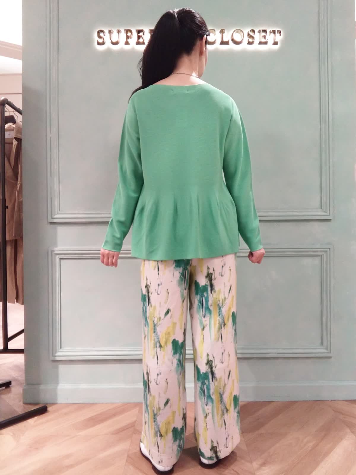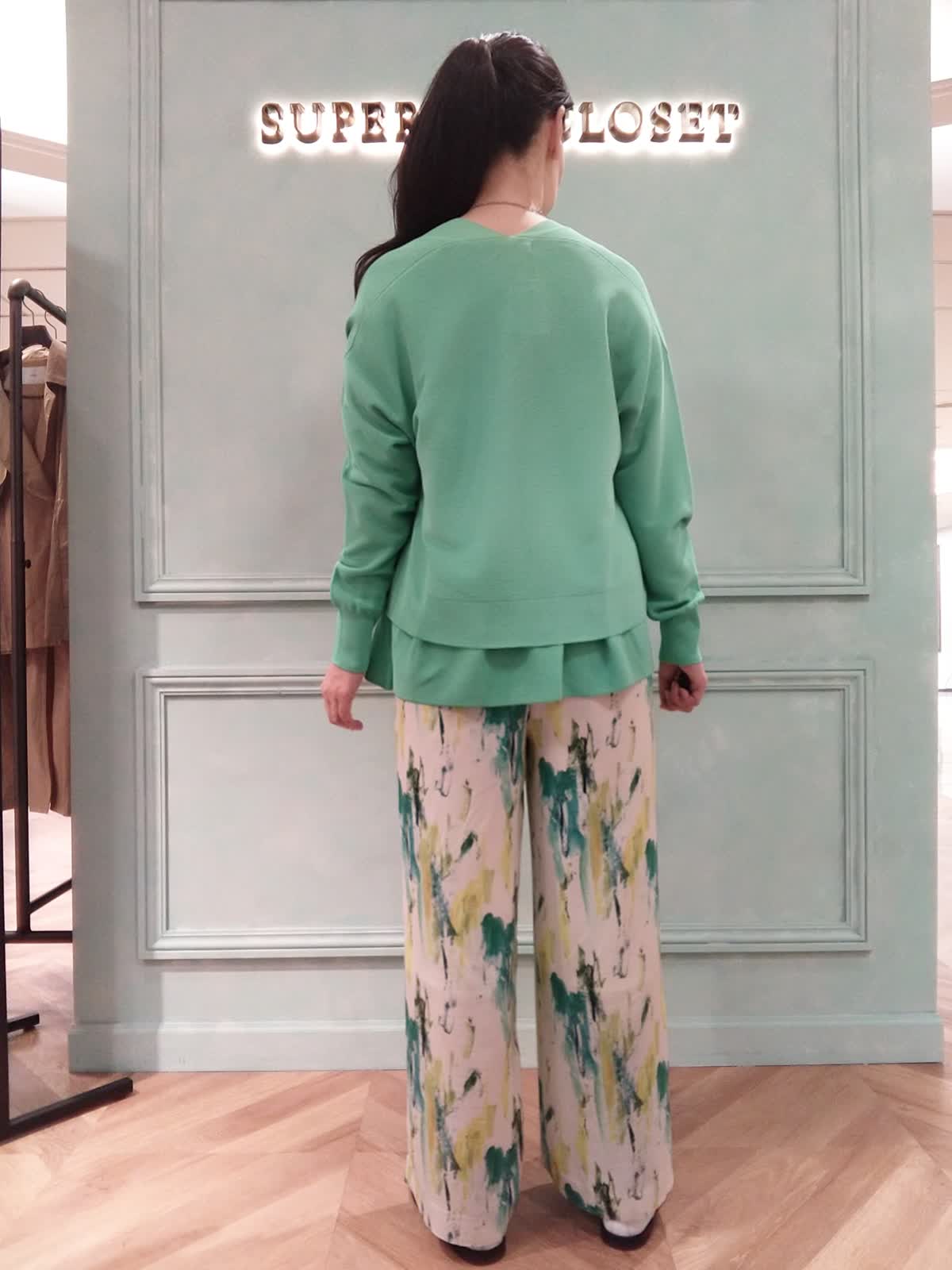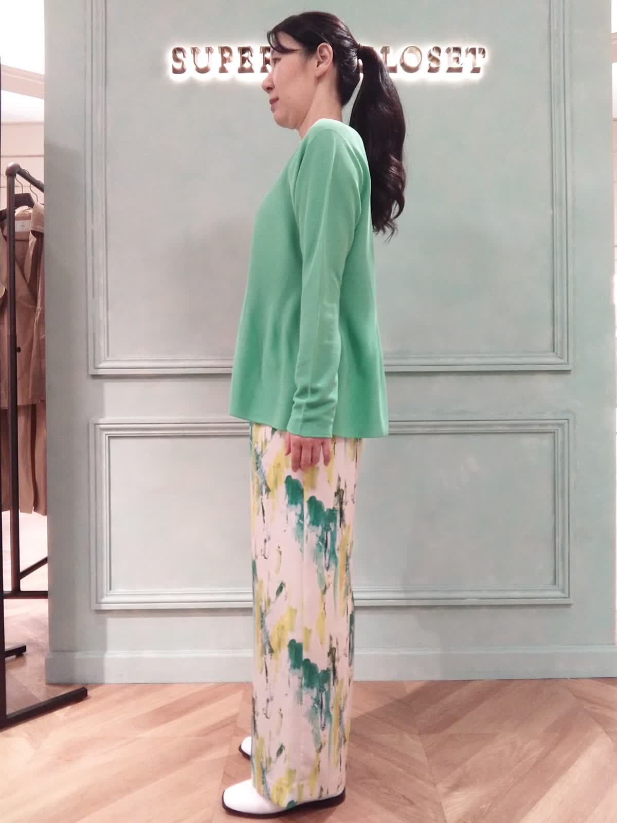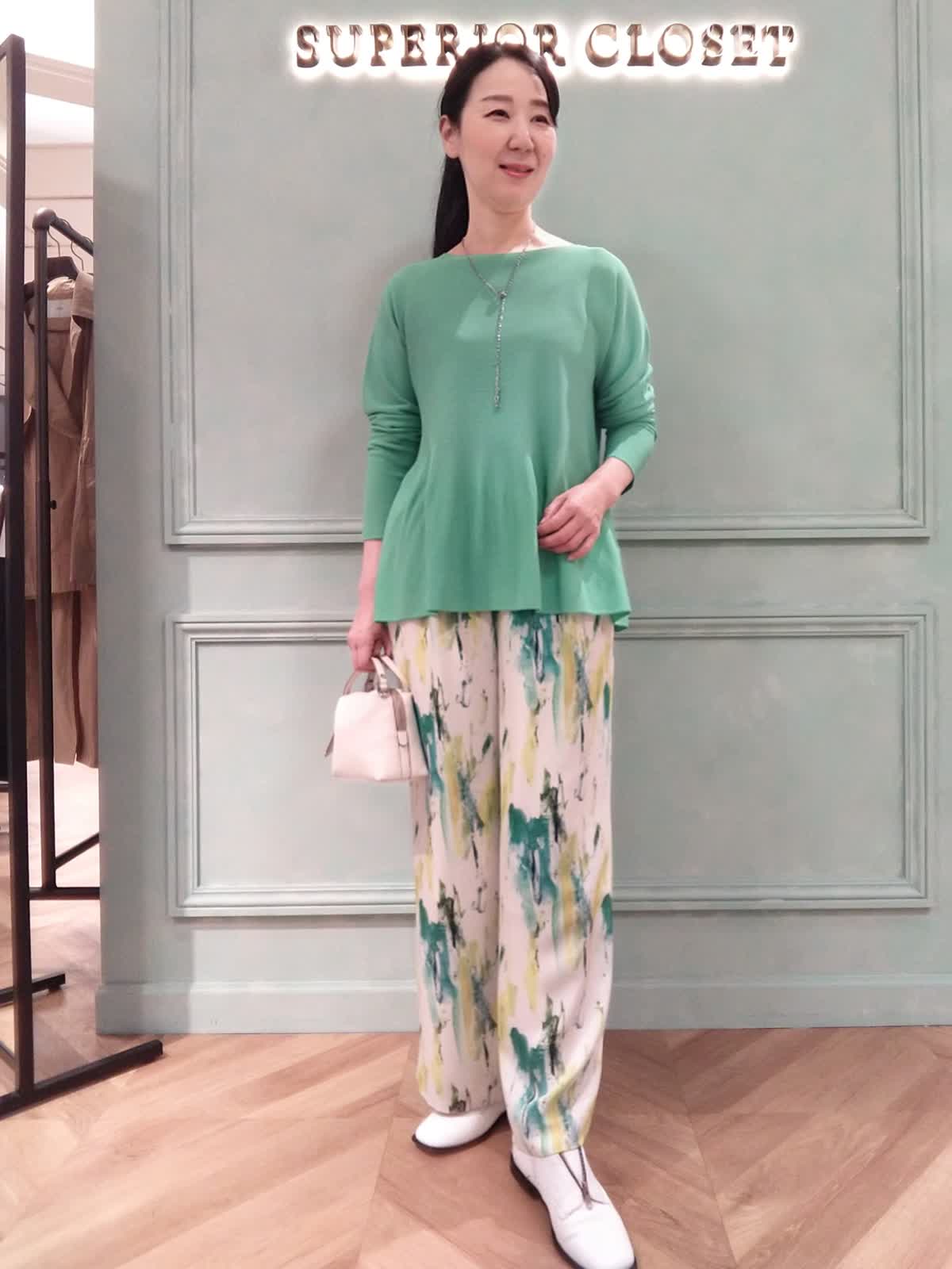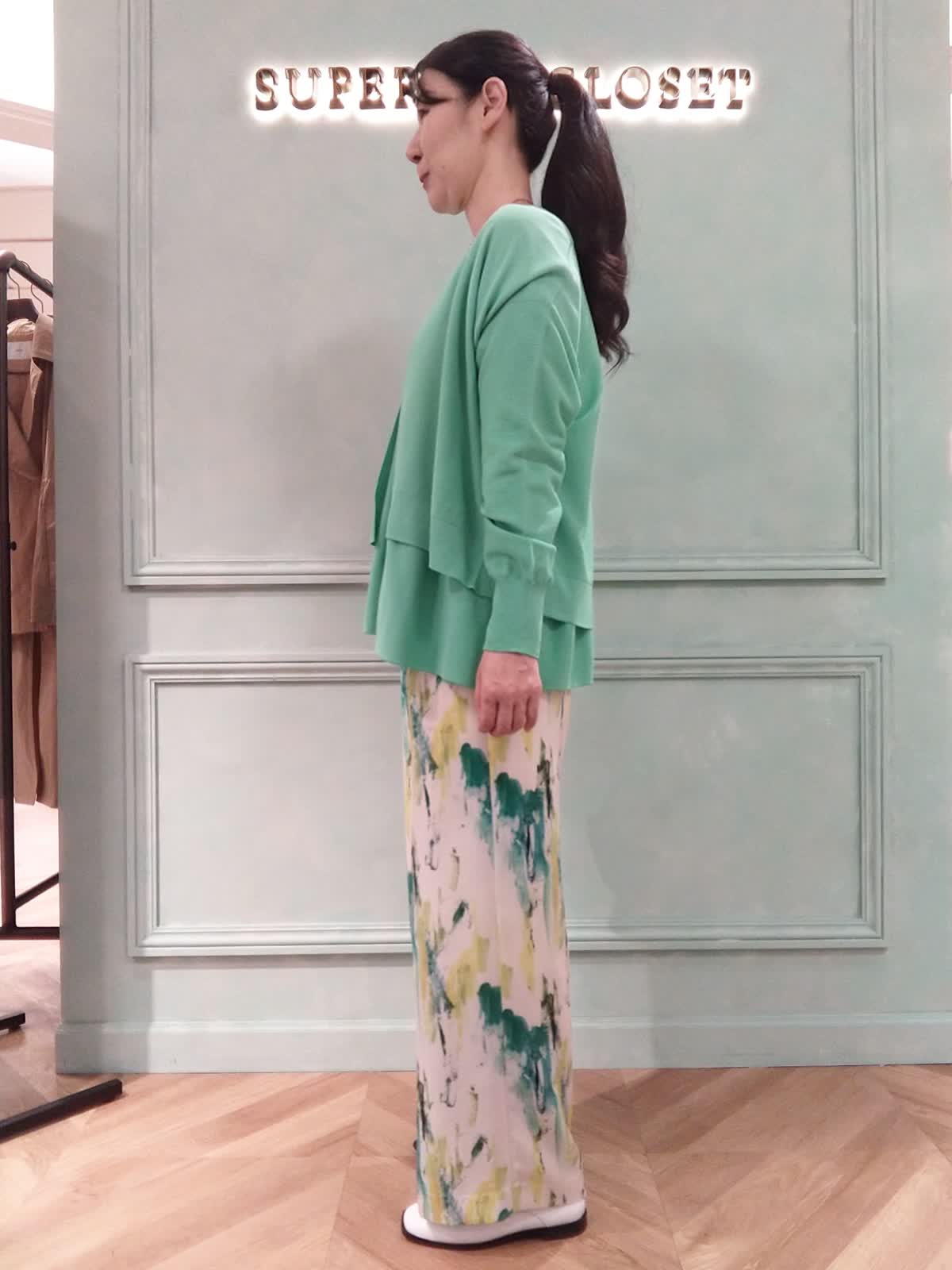 【着用サイズ】ニット:フリー、カーディガン:フリー、パンツ:9号 【着用カラー】ニット:グリーン、カーディガン:グリーン、パンツ:ペパーミント 大人カワイイアンサンブルスタイル。定番のCuooニットとカーディガンのアンサンブルはトレンドカラーのグリーンでコーディネート。カーディガンはニットよりも少し丈が短くて、アンサンブルで着るとニットの裾のヒラヒラが見えてフェミニンな印象に!プリントパンツで華やかをプラス。おでかけやお食事にオススメスタイルです。