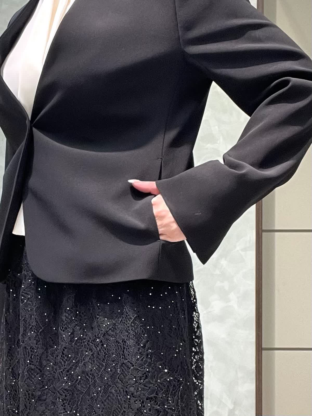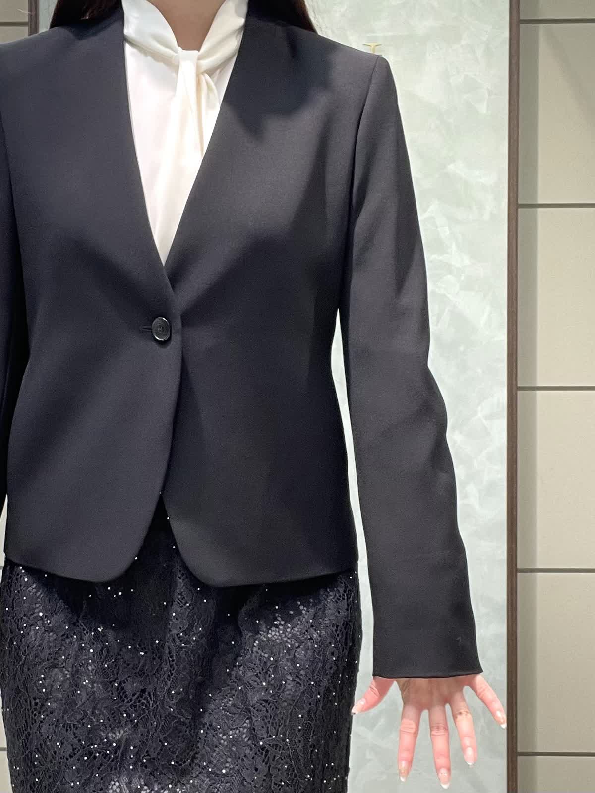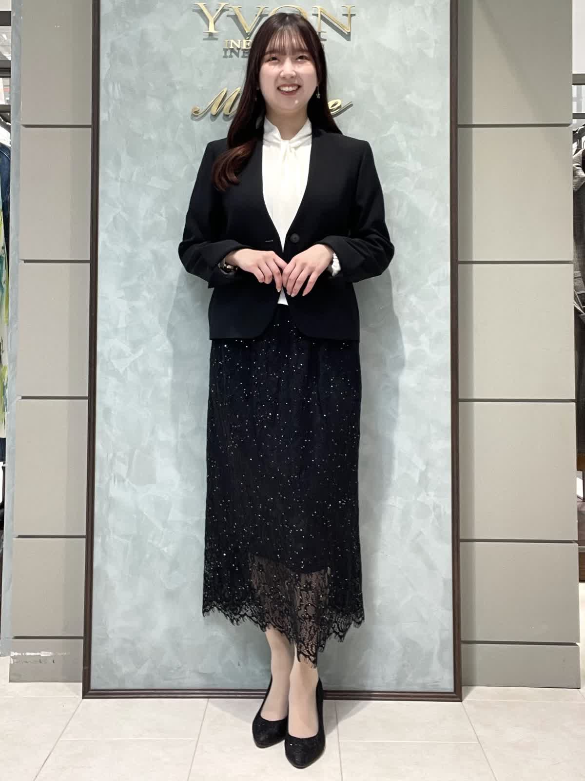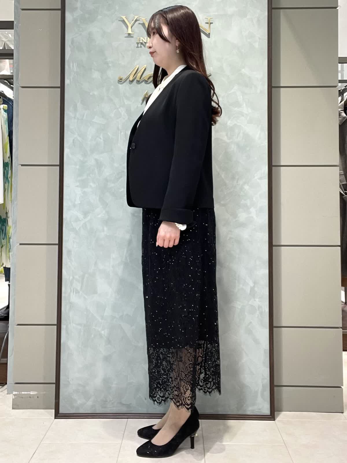 【着用サイズ】ジャケット、ブラウス、スカート:全て7号 スーツセットアップではなく、レーススカートで合わせて華やかにしました。 ジャケットは着丈すっきりしています。ウエストがシェイプされているので、女性らしいシルエットで着用できます。さらっとしたポリエステルのお素材でシワになりにくく、軽くて着心地が良いです。ポケット付き、カフスボタンなしスリット仕様です。ブラウスは落ち感のあるお素材です。少し透け感あるのでインナー着用をおすすめします。1枚は持っておきたい定番のボウタイです。スカートは細かいストーンと、裾のレースが華やかな1枚です。オールゴムで履き心地良く、タイトすぎないIラインシルエットですっきり見えします。着丈は157センチで足首が出るくらいです。