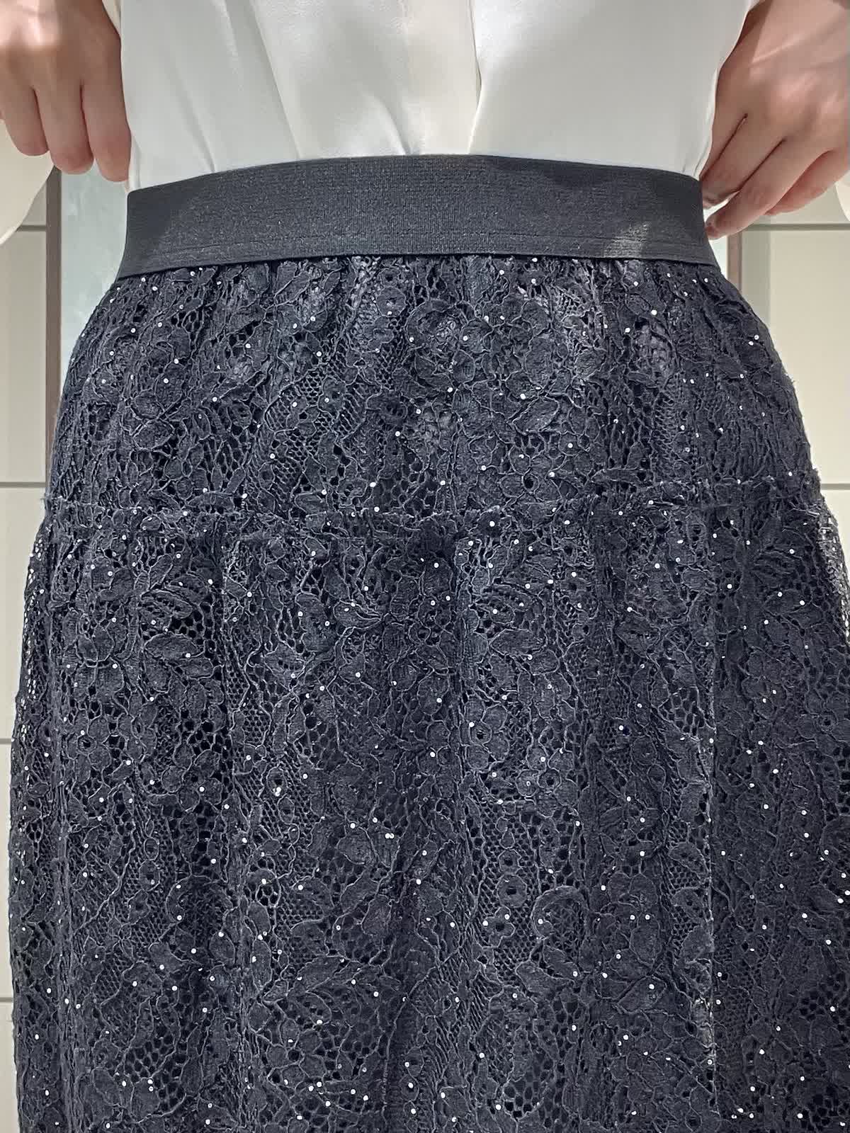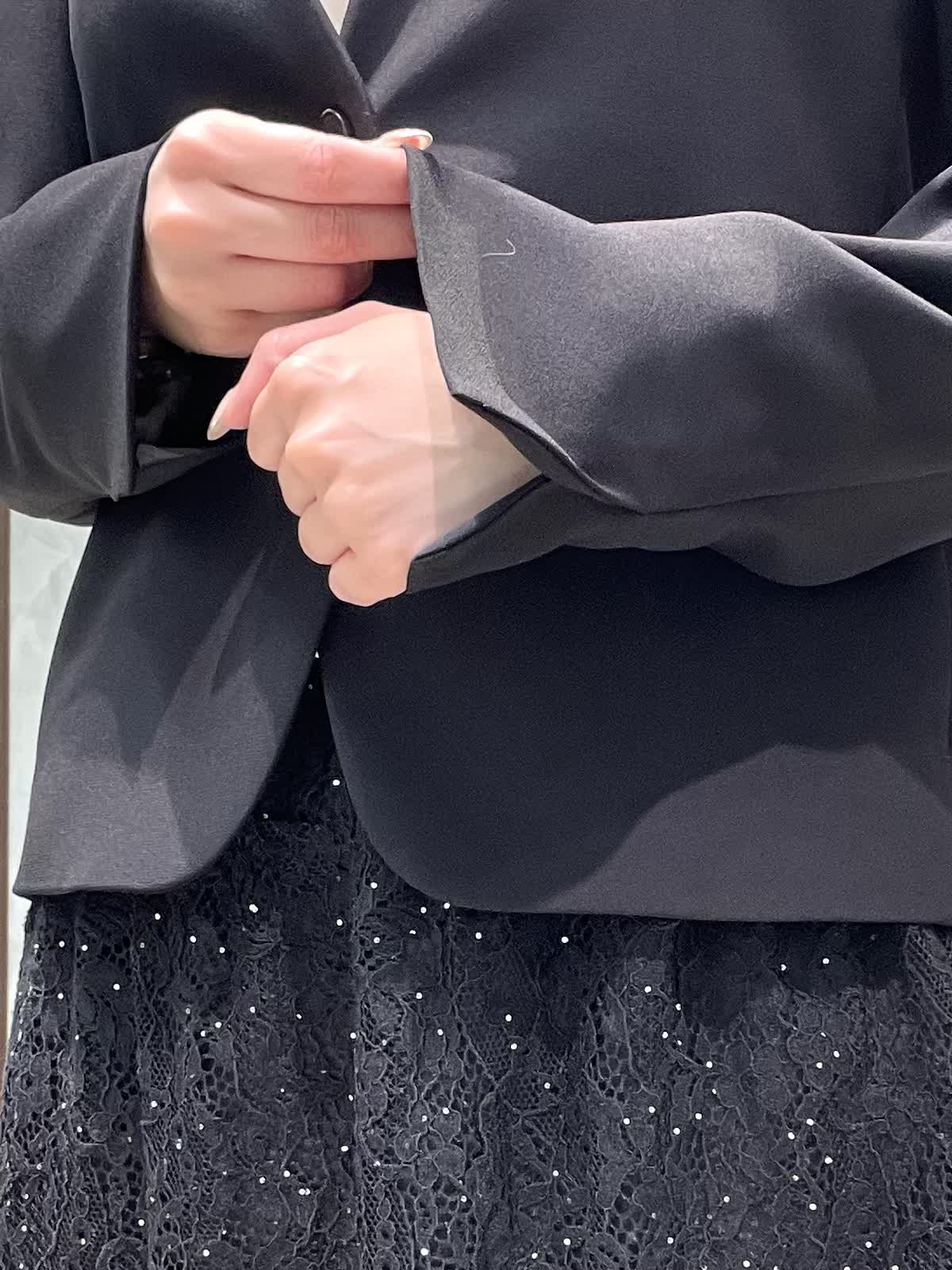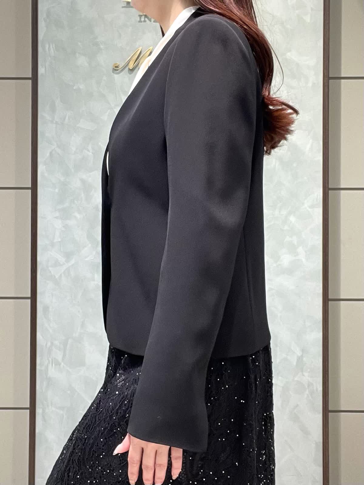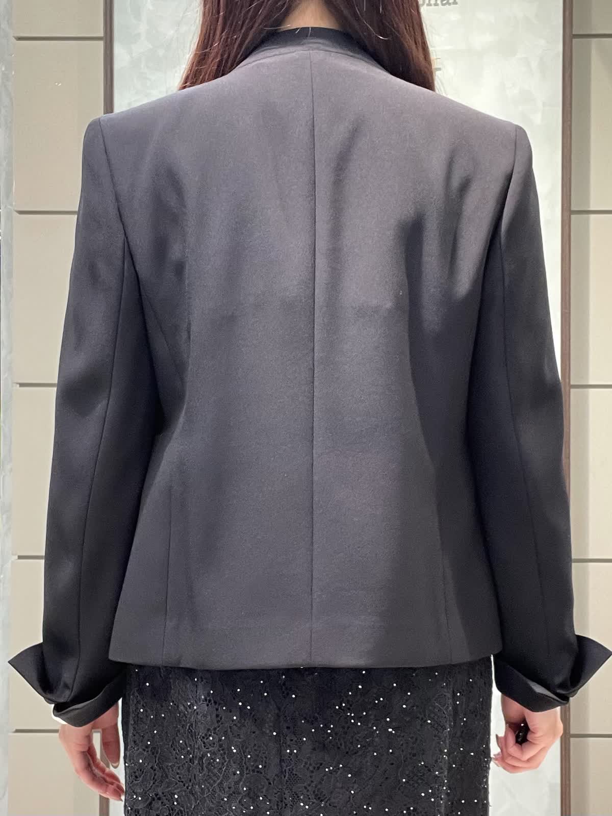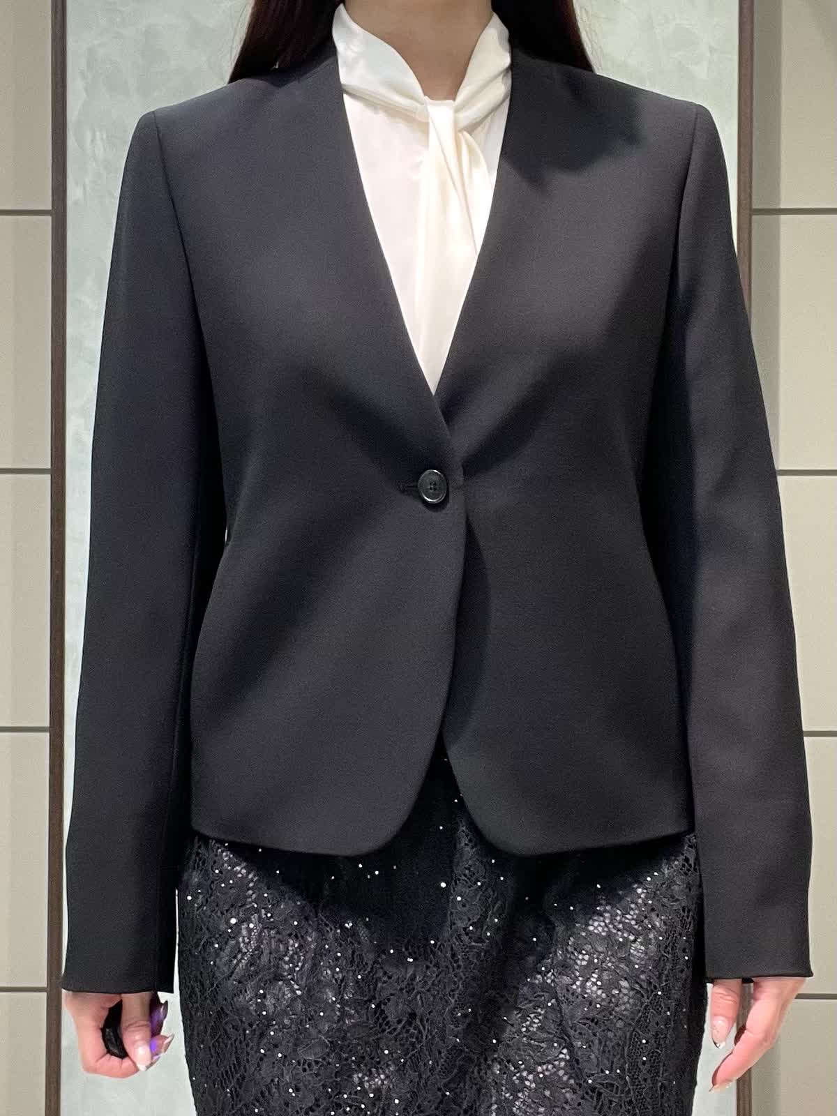 【着用サイズ】ジャケット、ブラウス、スカート:全て7号 スーツセットアップではなく、レーススカートで合わせて華やかにしました。 ジャケットは着丈すっきりしています。ウエストがシェイプされているので、女性らしいシルエットで着用できます。さらっとしたポリエステルのお素材でシワになりにくく、軽くて着心地が良いです。ポケット付き、カフスボタンなしスリット仕様です。ブラウスは落ち感のあるお素材です。少し透け感あるのでインナー着用をおすすめします。1枚は持っておきたい定番のボウタイです。スカートは細かいストーンと、裾のレースが華やかな1枚です。オールゴムで履き心地良く、タイトすぎないIラインシルエットですっきり見えします。着丈は157センチで足首が出るくらいです。