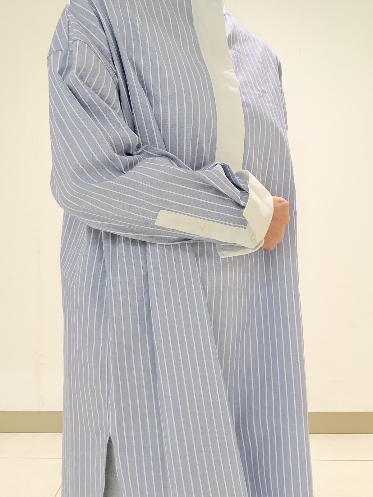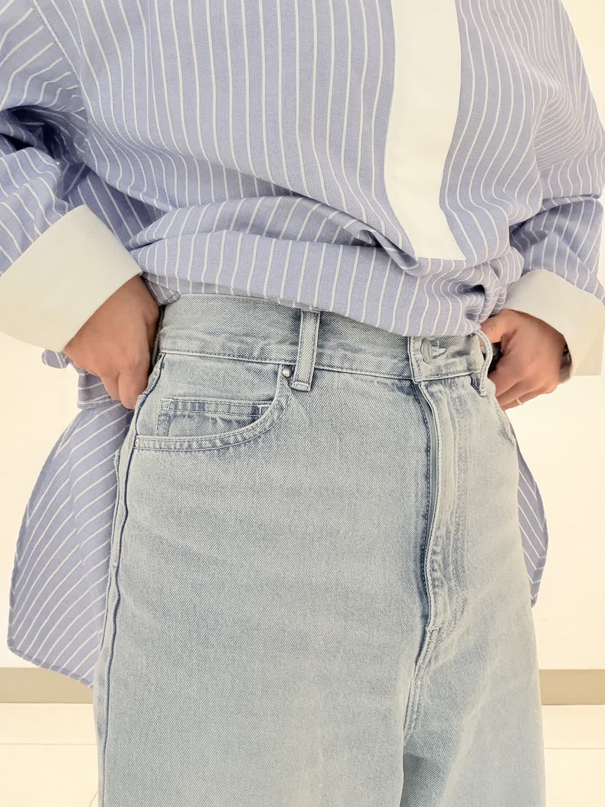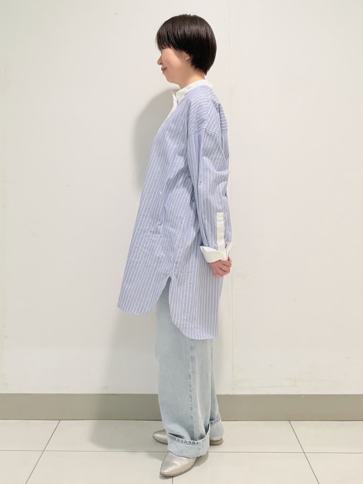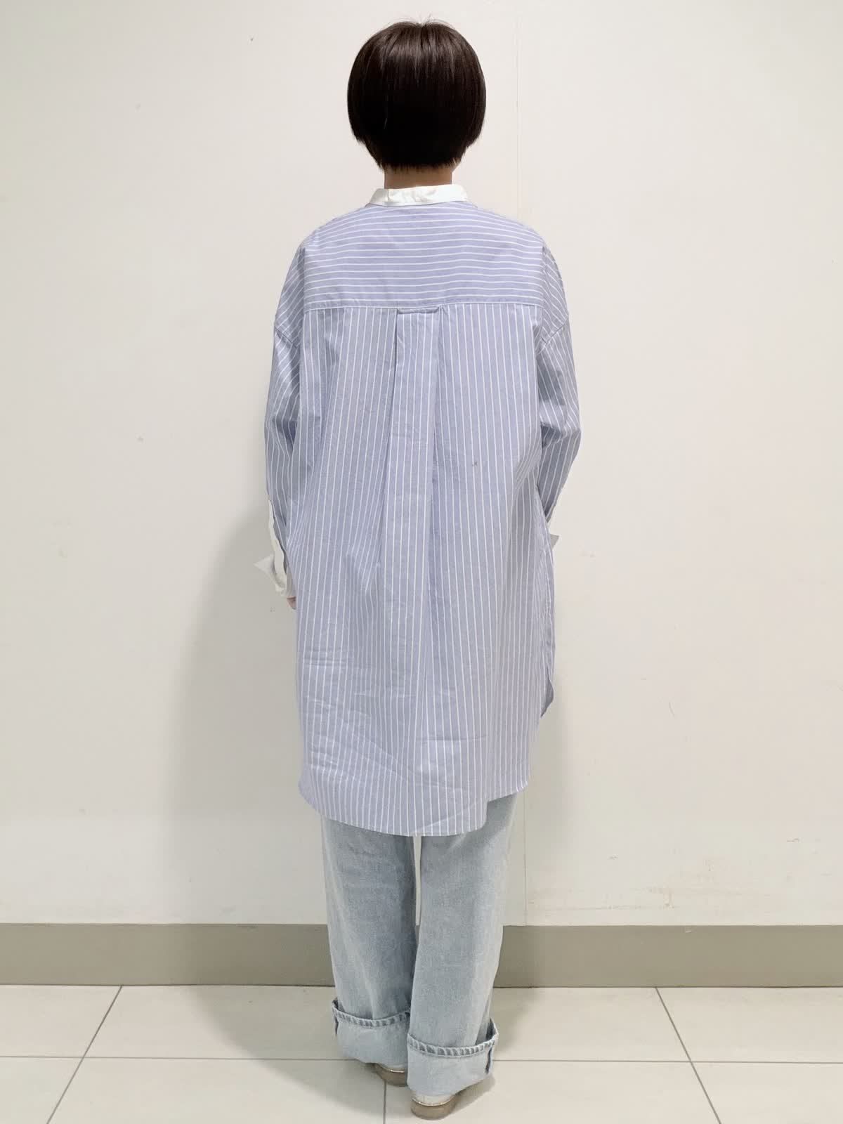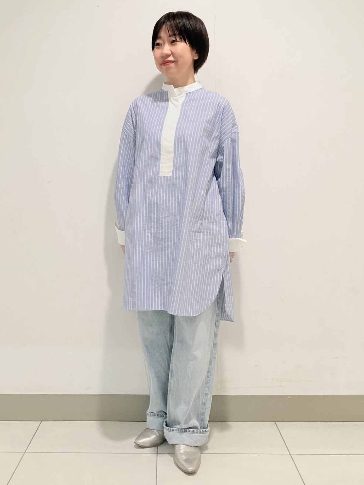 【着用サイズ】ブラウス:フリー デニム:9号 オーバーサイズのスタンドカラーロングシャツ。リラックス感もありながら、スタンドカラーできちんと感も合わせ持ったデザインです。綿100%のオックス素材は適度な張り感があり身体のラインを拾いにくいのも嬉しいポイント。オールシーズン活躍する1枚です。 ボトムには綿リヨセル混のデニムを合わせました。柔らかくて履き心地も◎。横からのラインがとっても綺麗なデニムは裾をロールアップしても可愛いです。