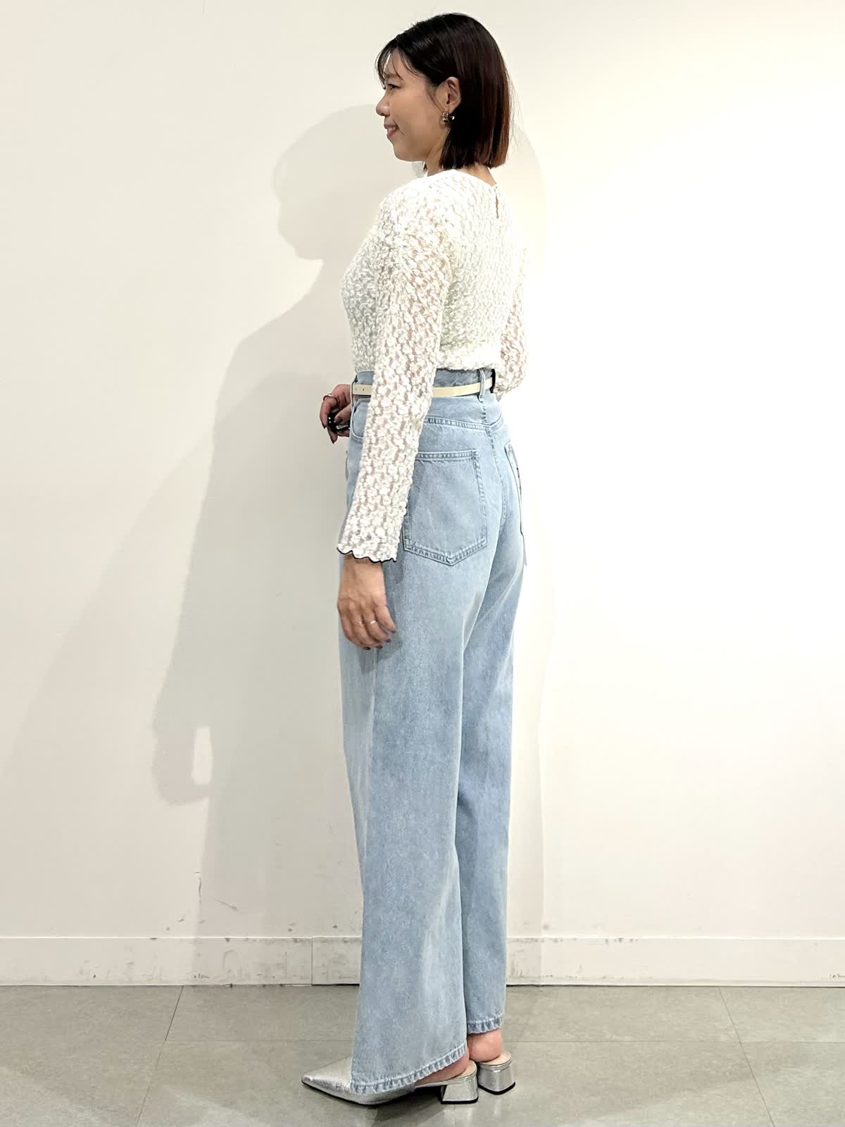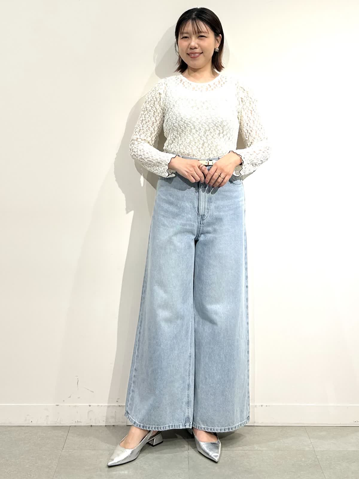 ボトムはワイドデニムでこなれ感のあるカジュアルスタイルに。ウエスト位置が高くみえるのでヒップも上がって見えて脚長効果に繋がります。