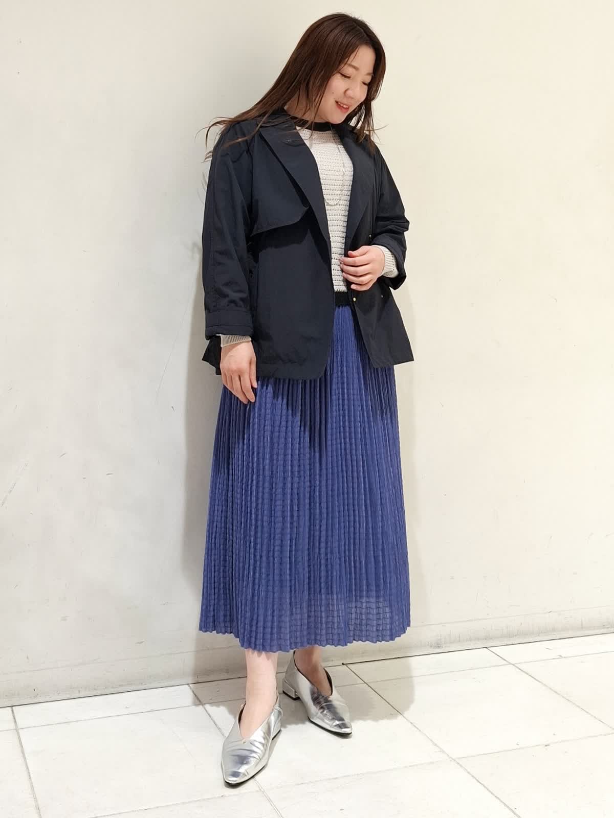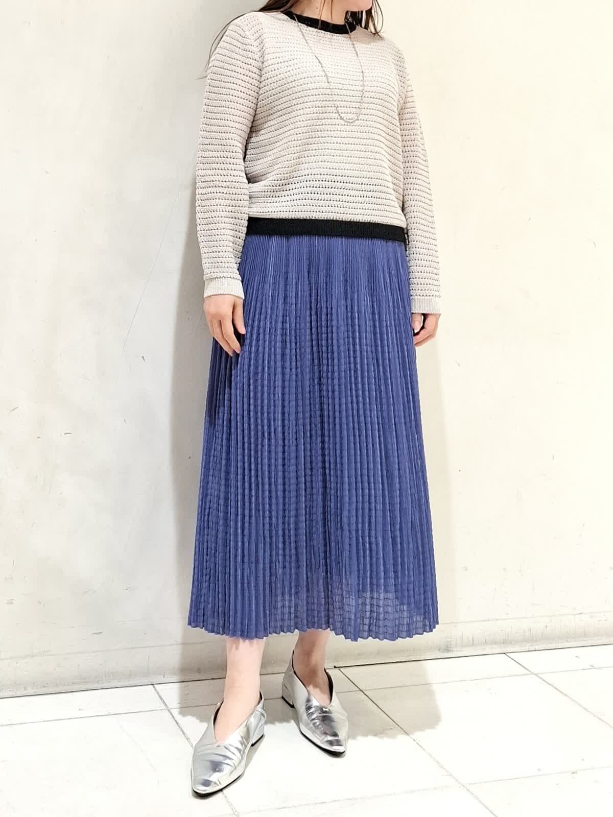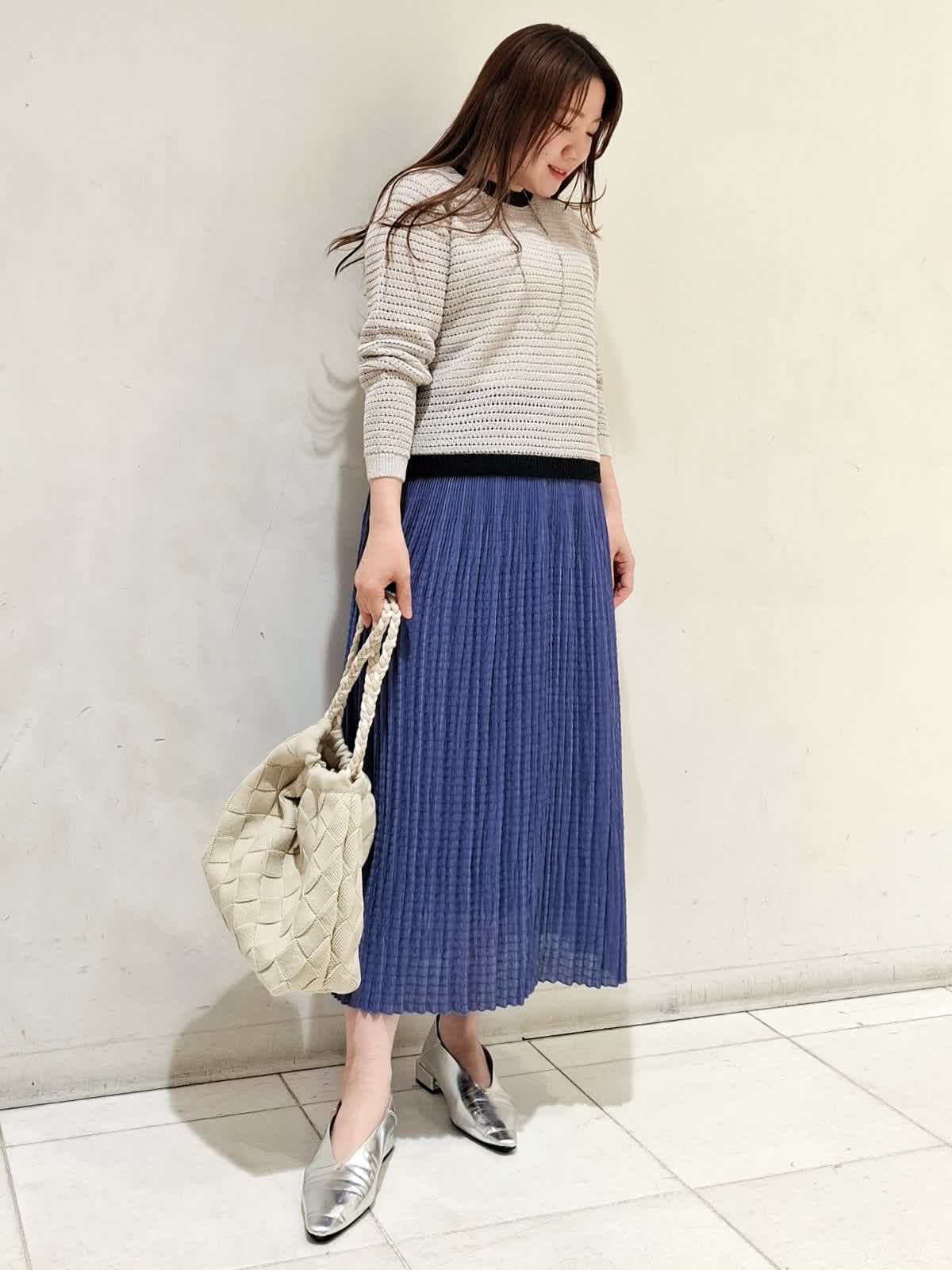 【着用サイズ】ニット:9号サイズ ミディアムグレー カットソー:9号サイズ オフホワイト スカート:9号サイズ ブルー バック:フリーサイズ ベージュ ネックレス:フリーサイズ シルバー 春のおでかけスタイル。ニットは、シンプルですが配色デザインがポイント。スカートは、軽くて柔らかい素材ではきやすいです。春はスタイリングに明るい色を取り入れるのがおすすめです。