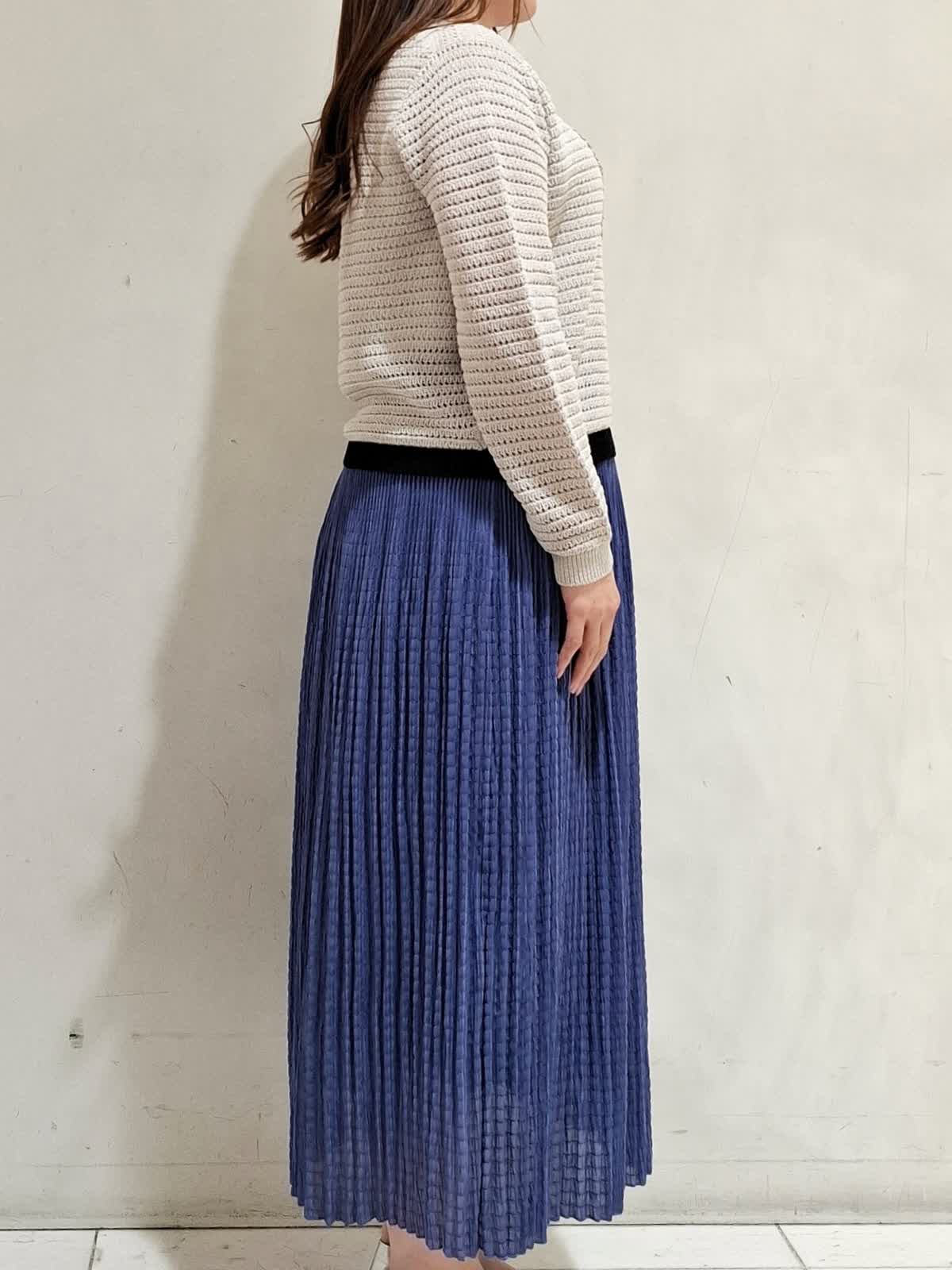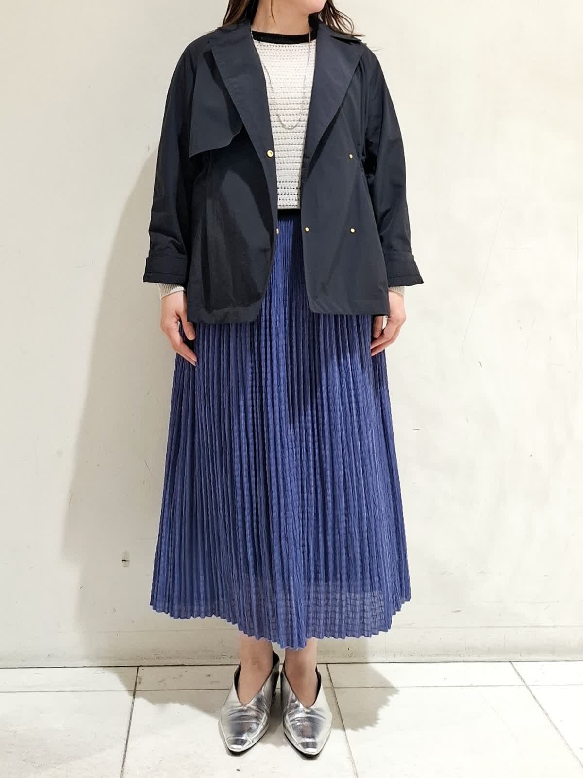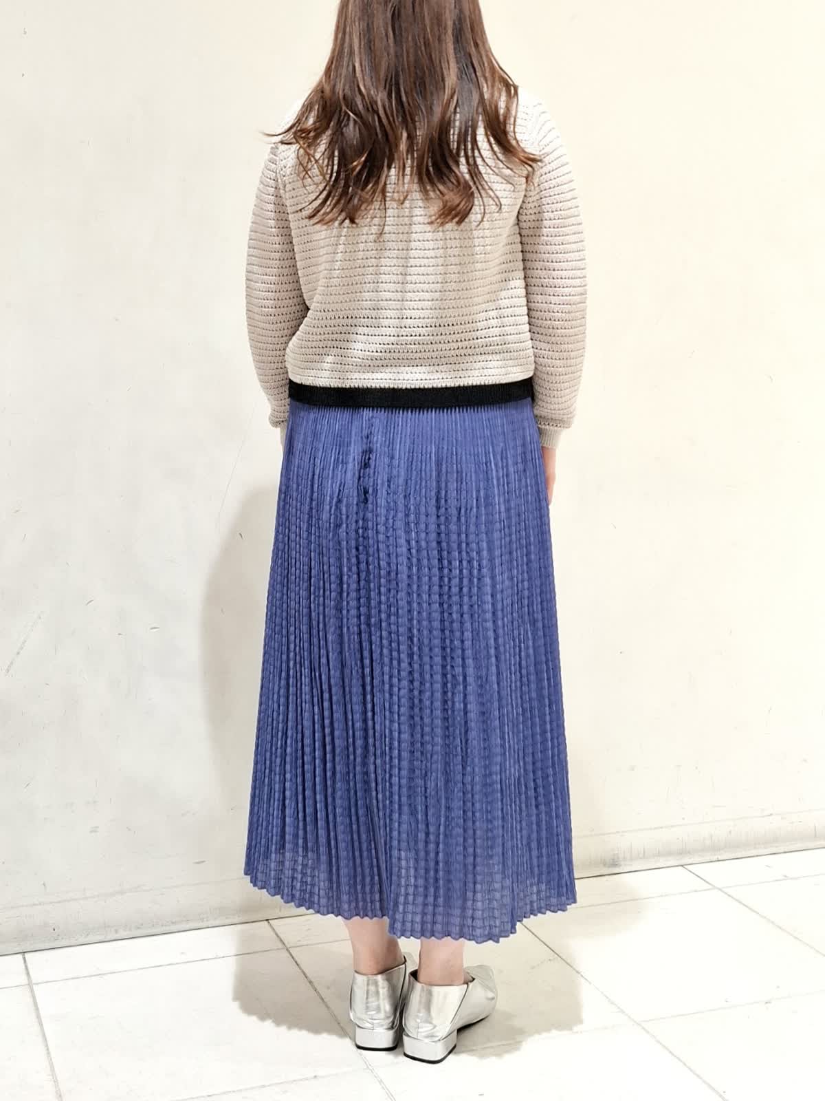 【着用サイズ】ニット:9号サイズ ミディアムグレー カットソー:9号サイズ オフホワイト スカート:9号サイズ ブルー バック:フリーサイズ ベージュ ネックレス:フリーサイズ シルバー 春のおでかけスタイル。ニットは、シンプルですが配色デザインがポイント。スカートは、軽くて柔らかい素材ではきやすいです。春はスタイリングに明るい色を取り入れるのがおすすめです。
